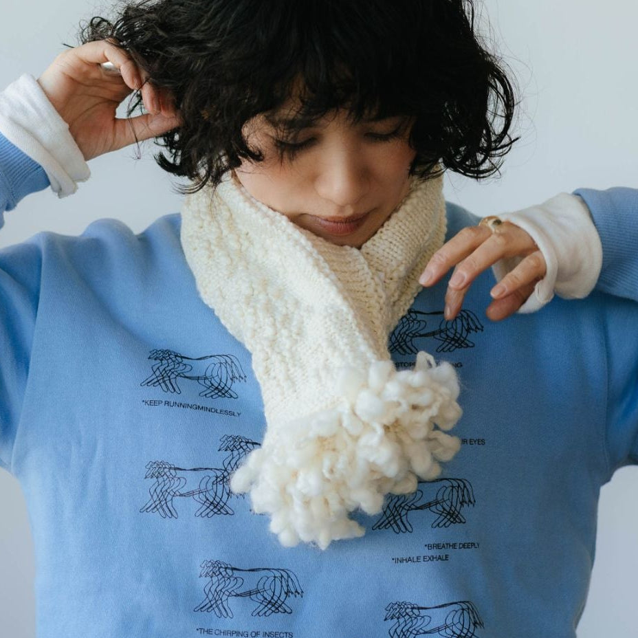 太めのウール糸を使用し、手編みのようなざっくり感を出したミニマフラーです。