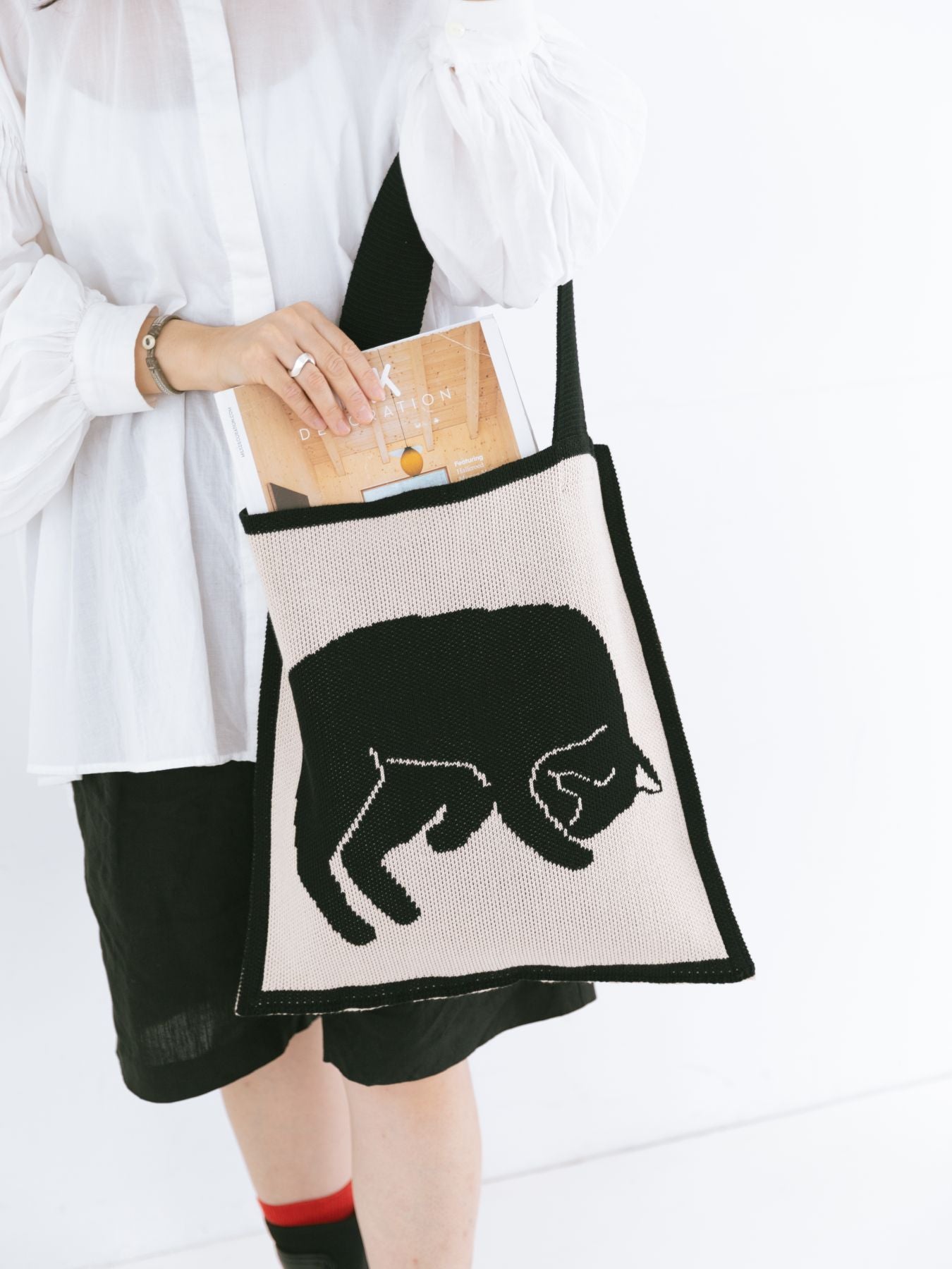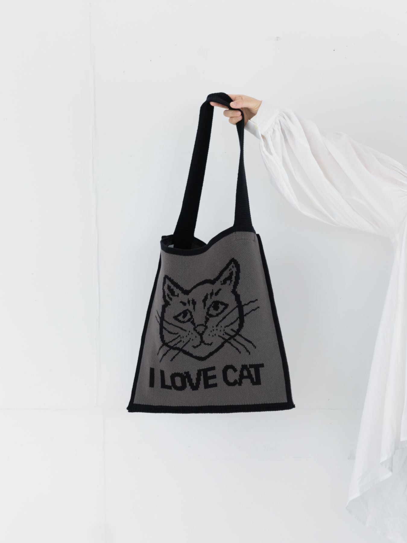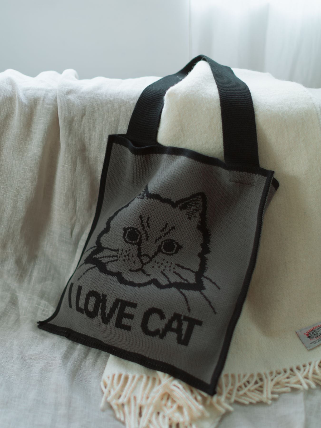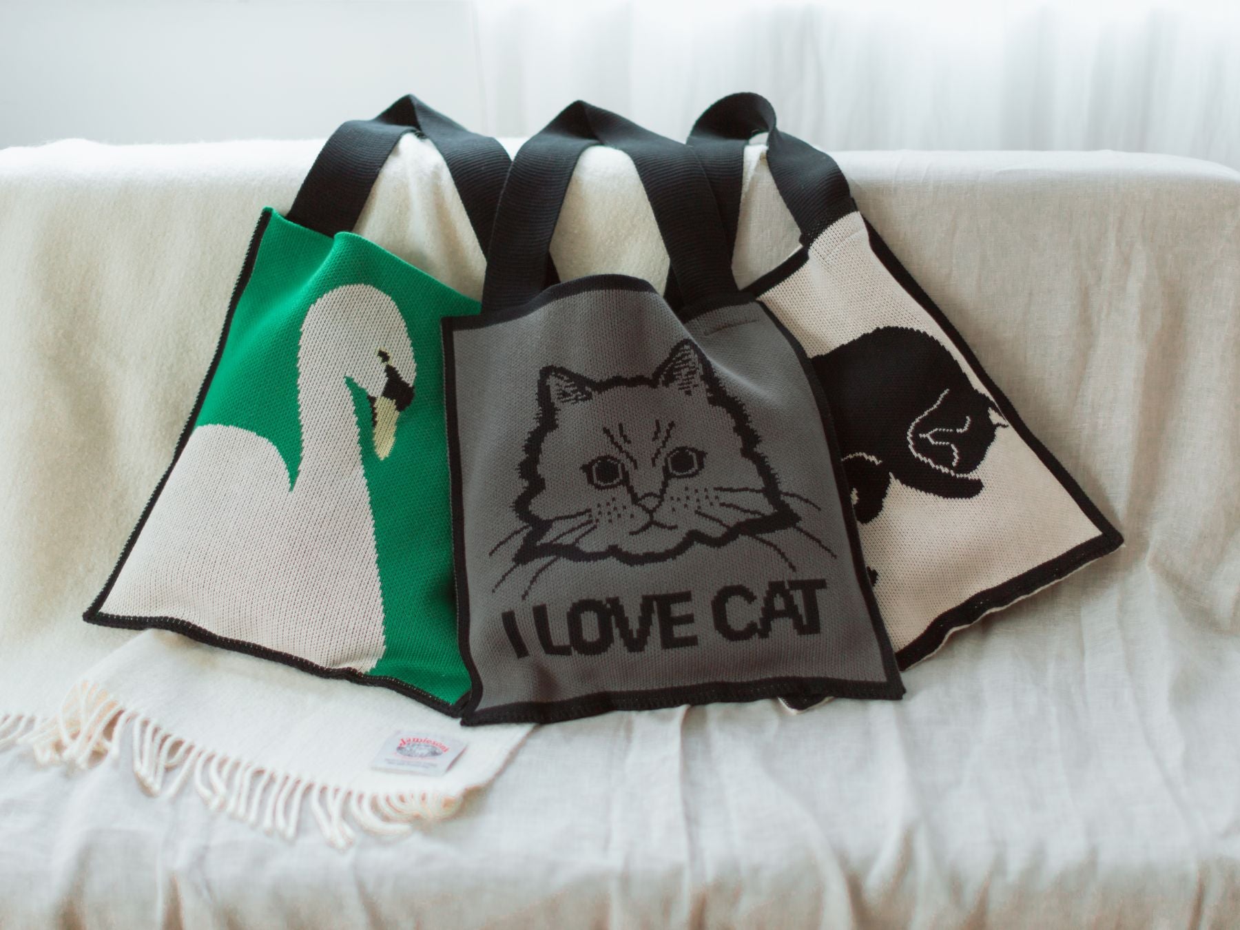 ネコ愛あふれるアップのお顔に、お昼寝中のネコ、そして穏やかな白鳥。編み柄で表現されたインパクトあるモチーフは大人コーデにもなじみ、持つだけで気分をちょっと楽しくしてくれます。