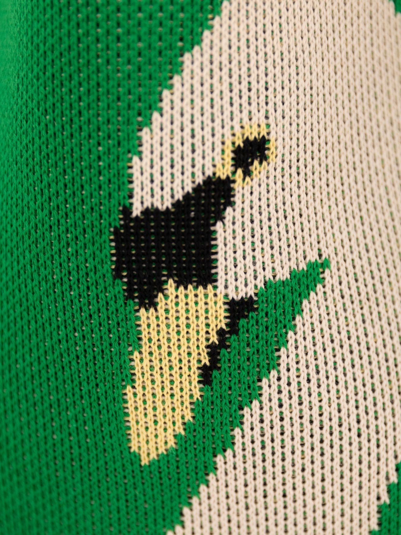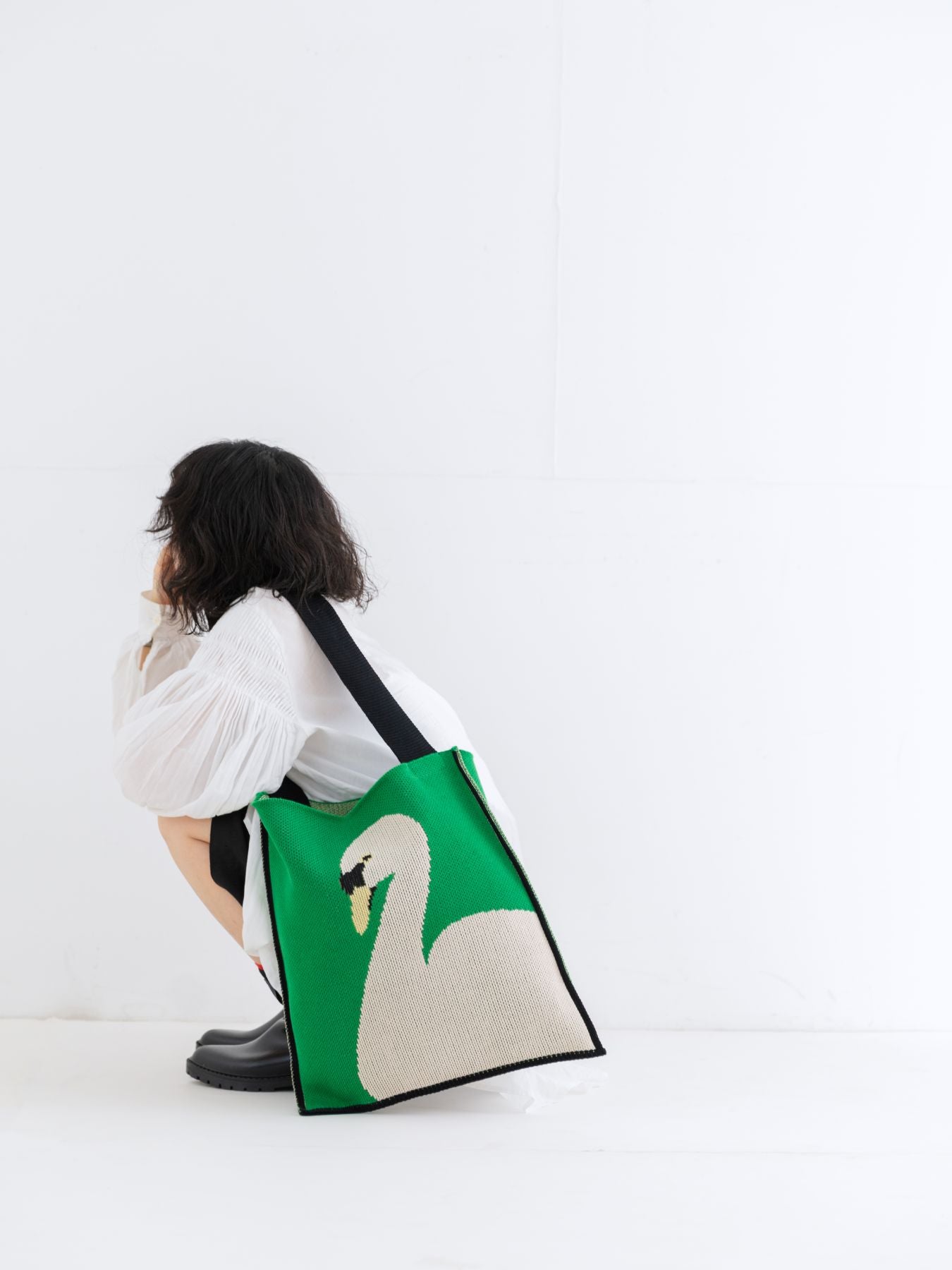 ぱきっと発色の良いグリーンに、スワンのデザイン。存在感抜群で、コーデのポイントにぴったり。ニットの風合いもあいまって、どこか大人っぽさもあります。