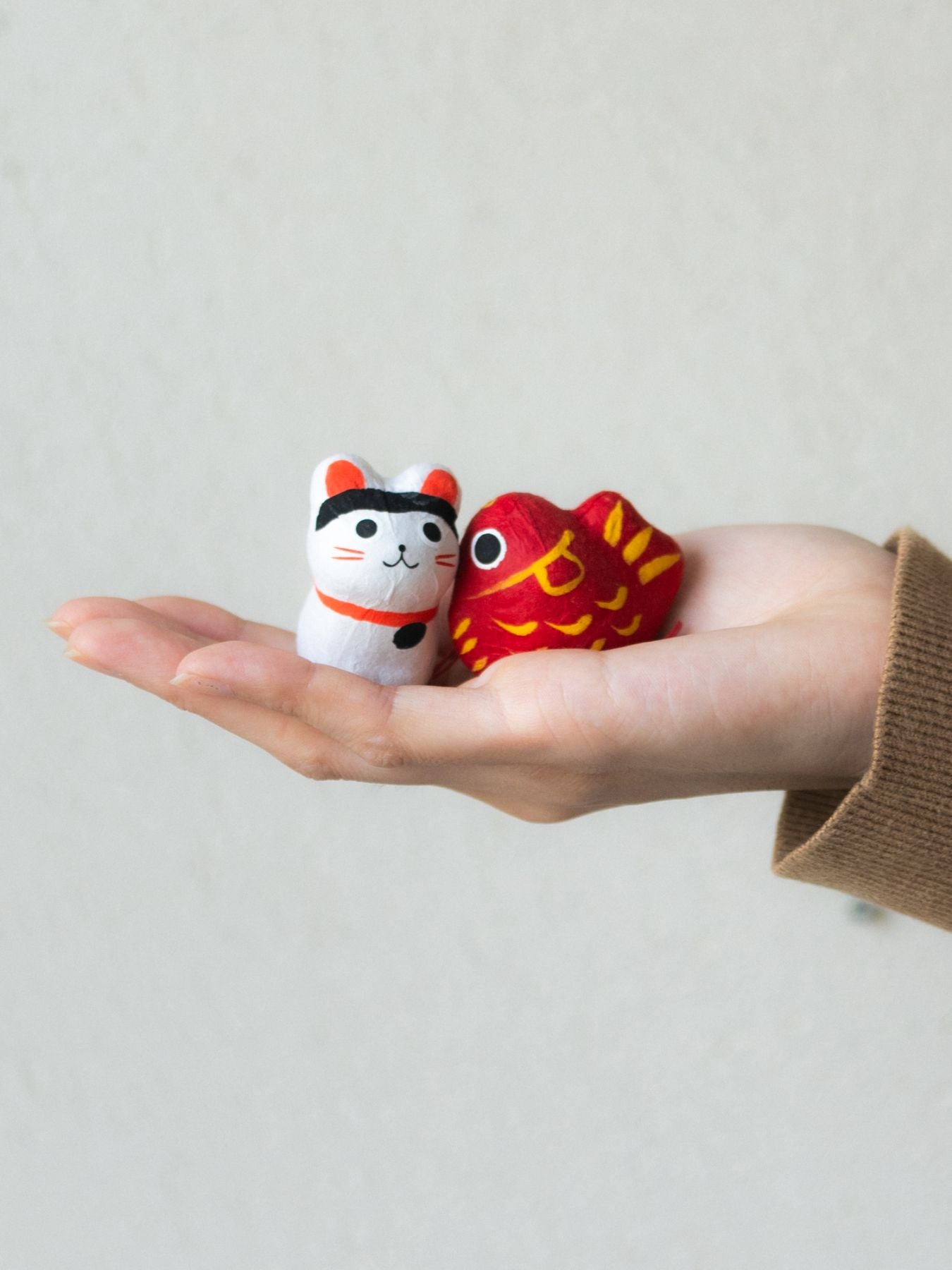 和紙貼りで丁寧に仕上げられた動物たちは、ちょこんとした佇まいと愛嬌のある表情で、いくつも並べたくなるかわいさ。