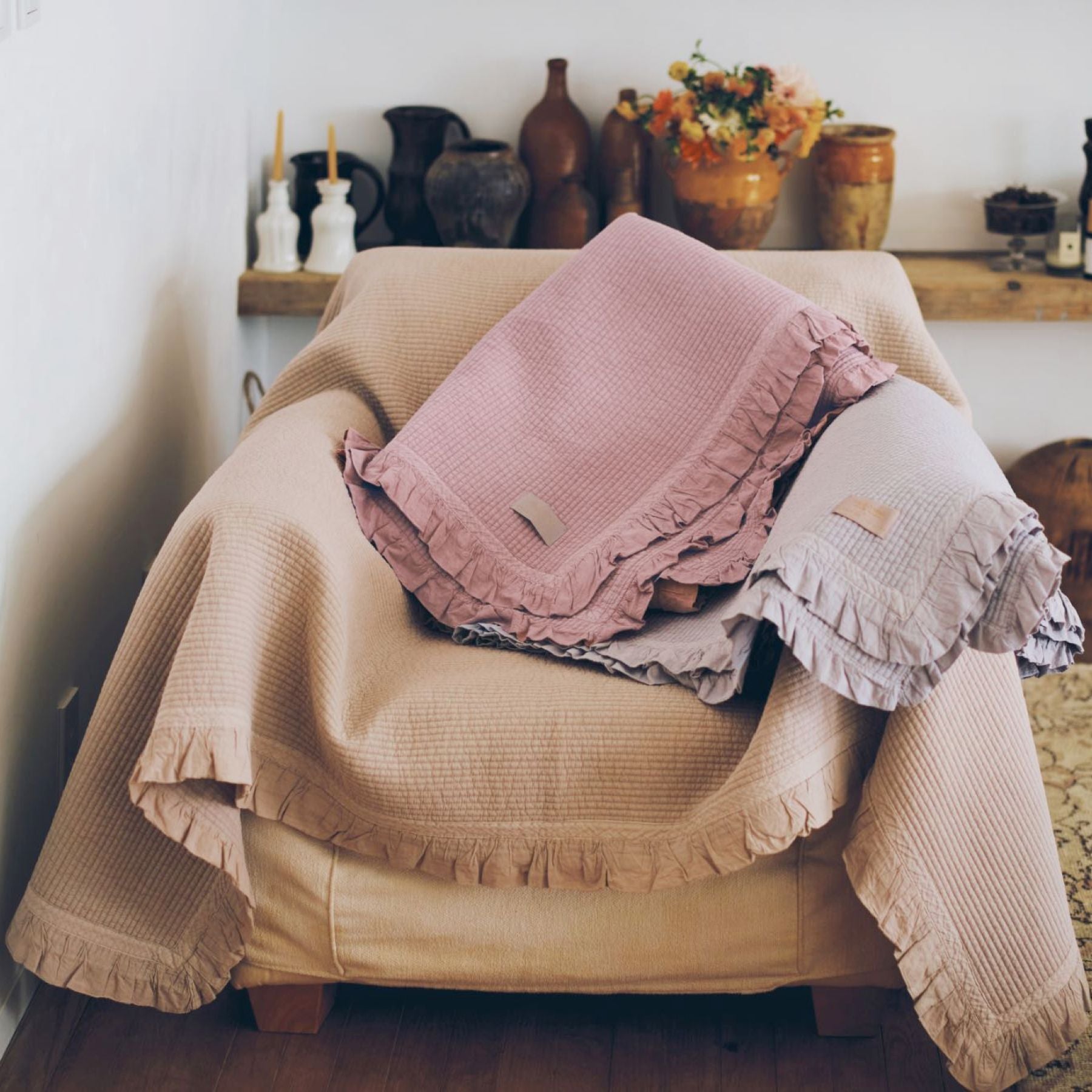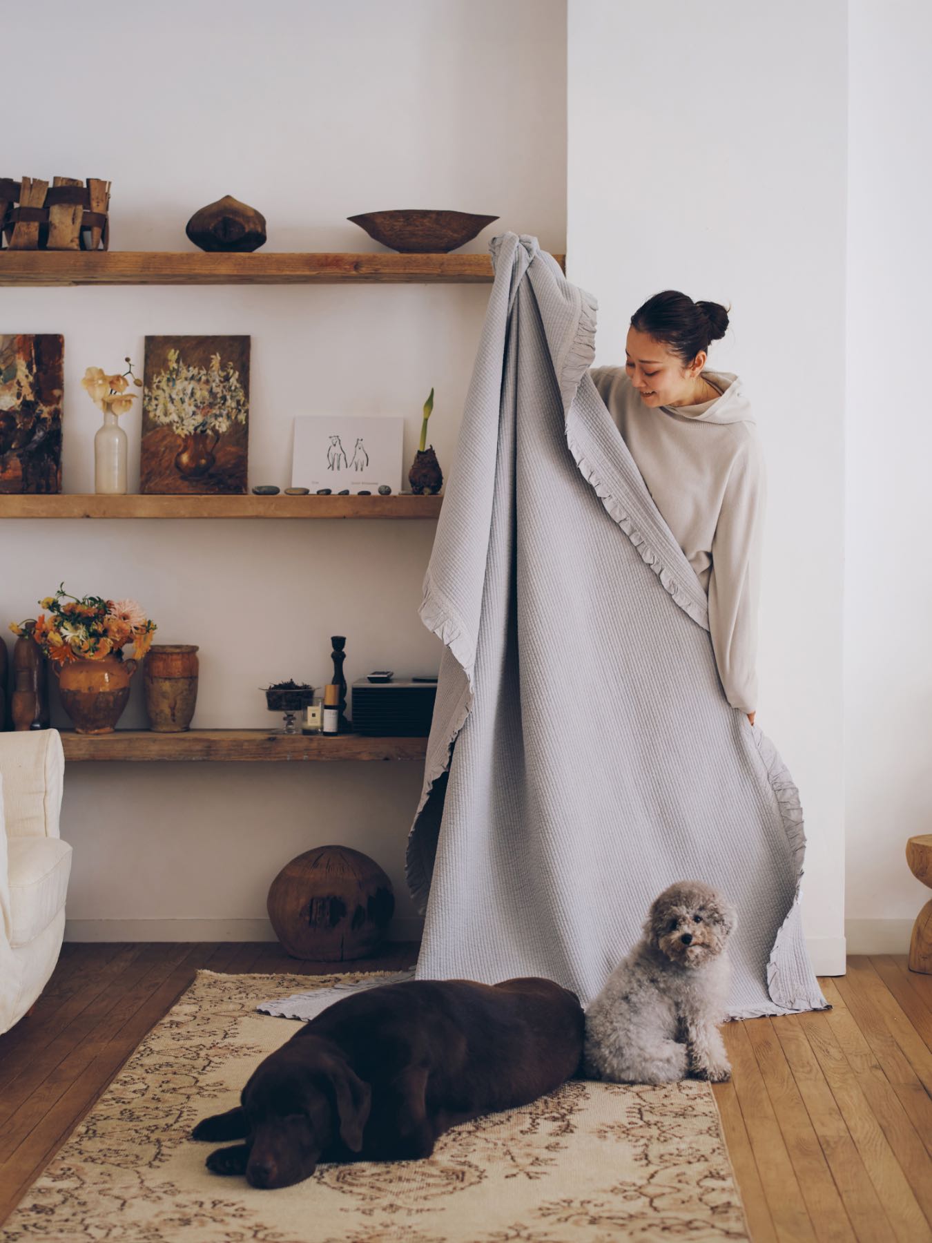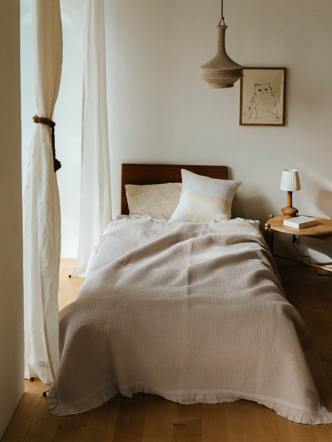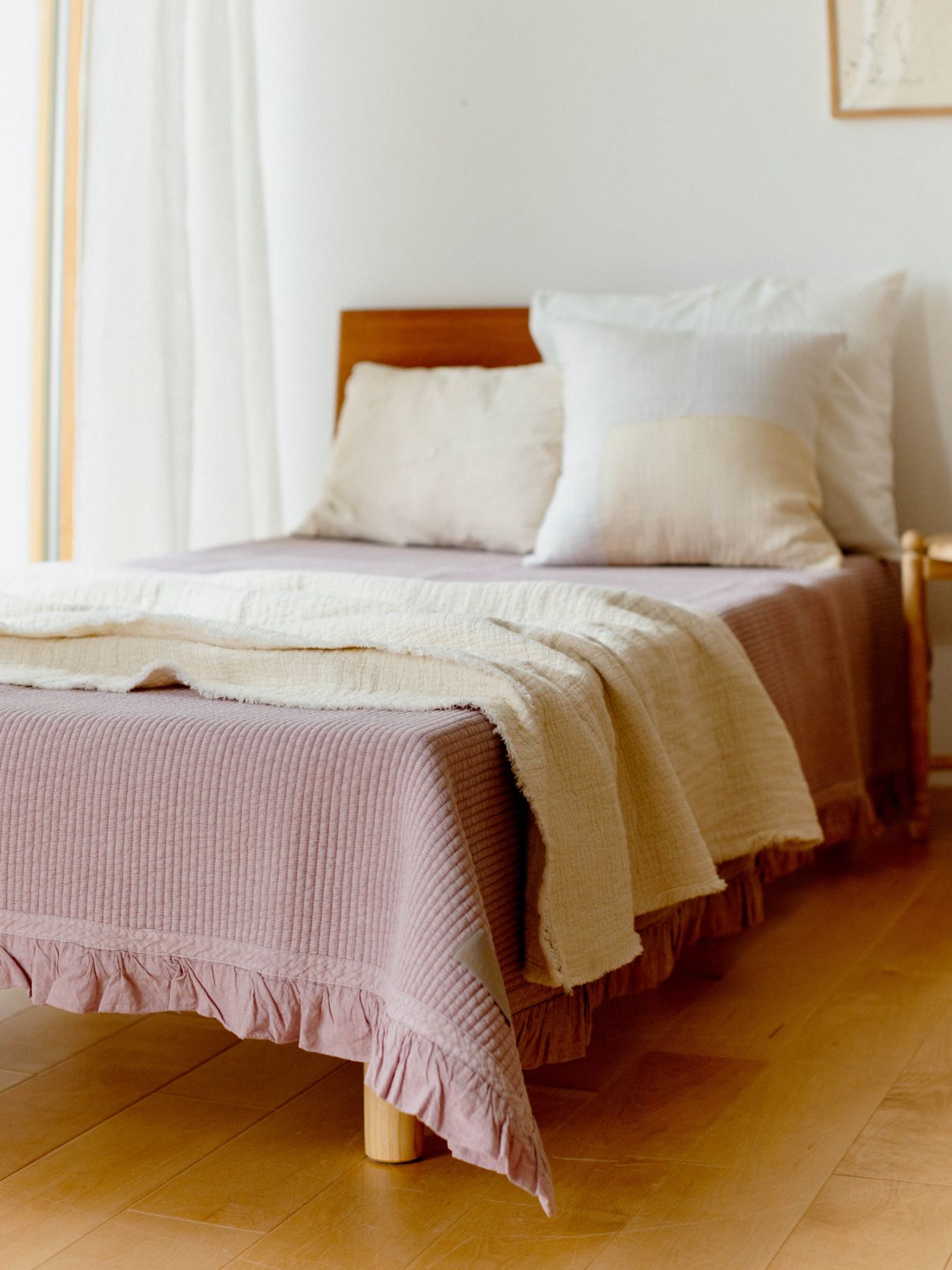 柔らかな布の表情や心地よい肌触りが魅力の韓国キルト・イブルに、雅姫さんのヴィンテージシックな感性が重なり、今の暮らしに寄り添う理想の一枚に仕上がりました。