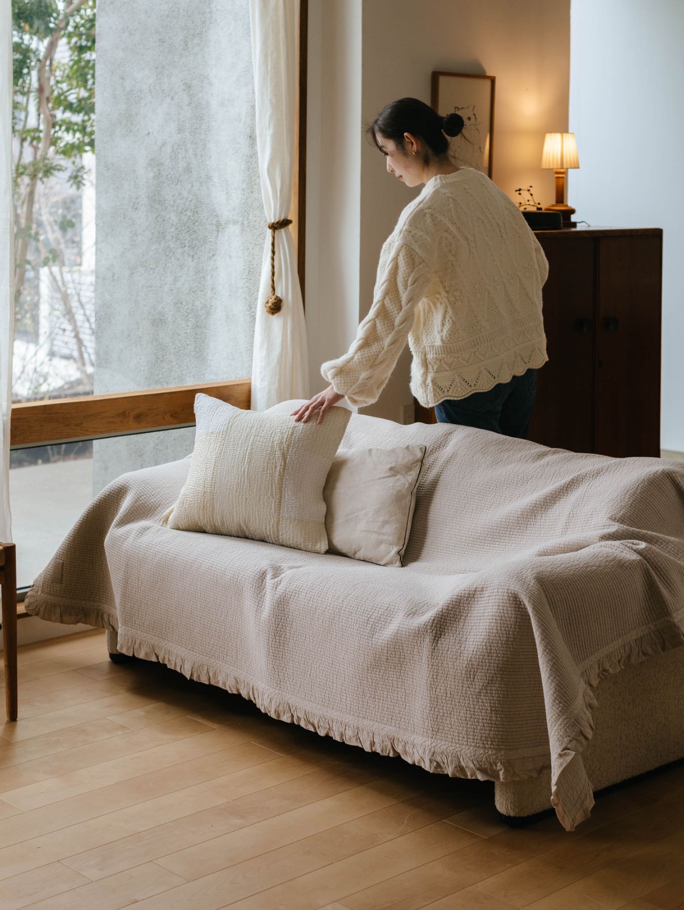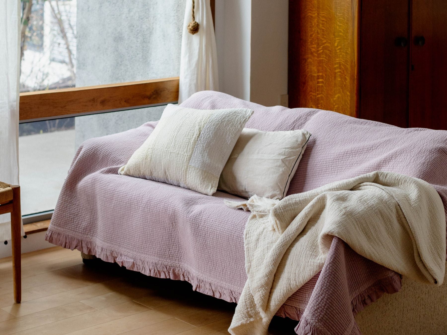 ソファーカバーやベッドスローに。あるいは、ブランケットや敷布団として肌に直接使用しても心地よい質感です。