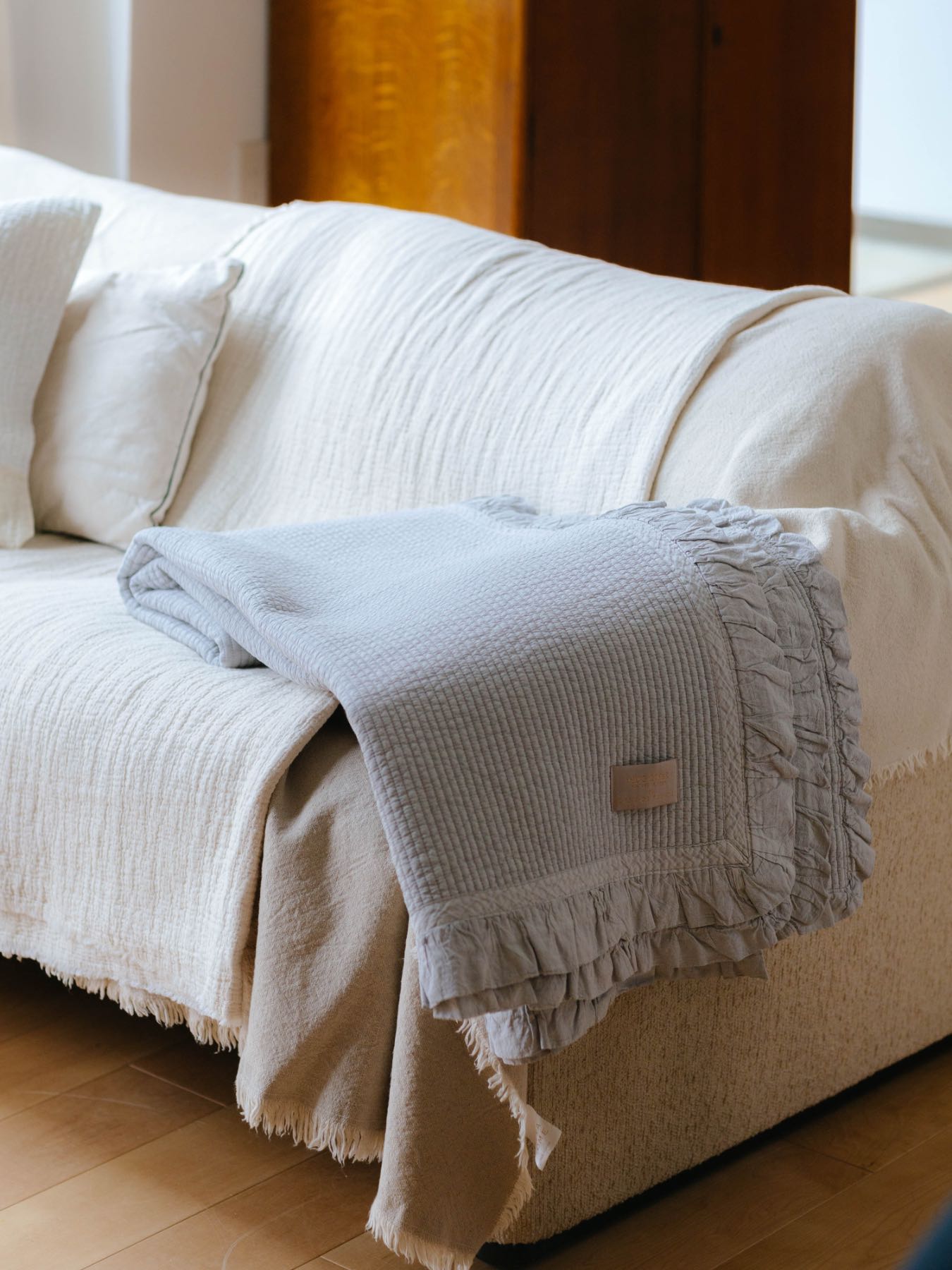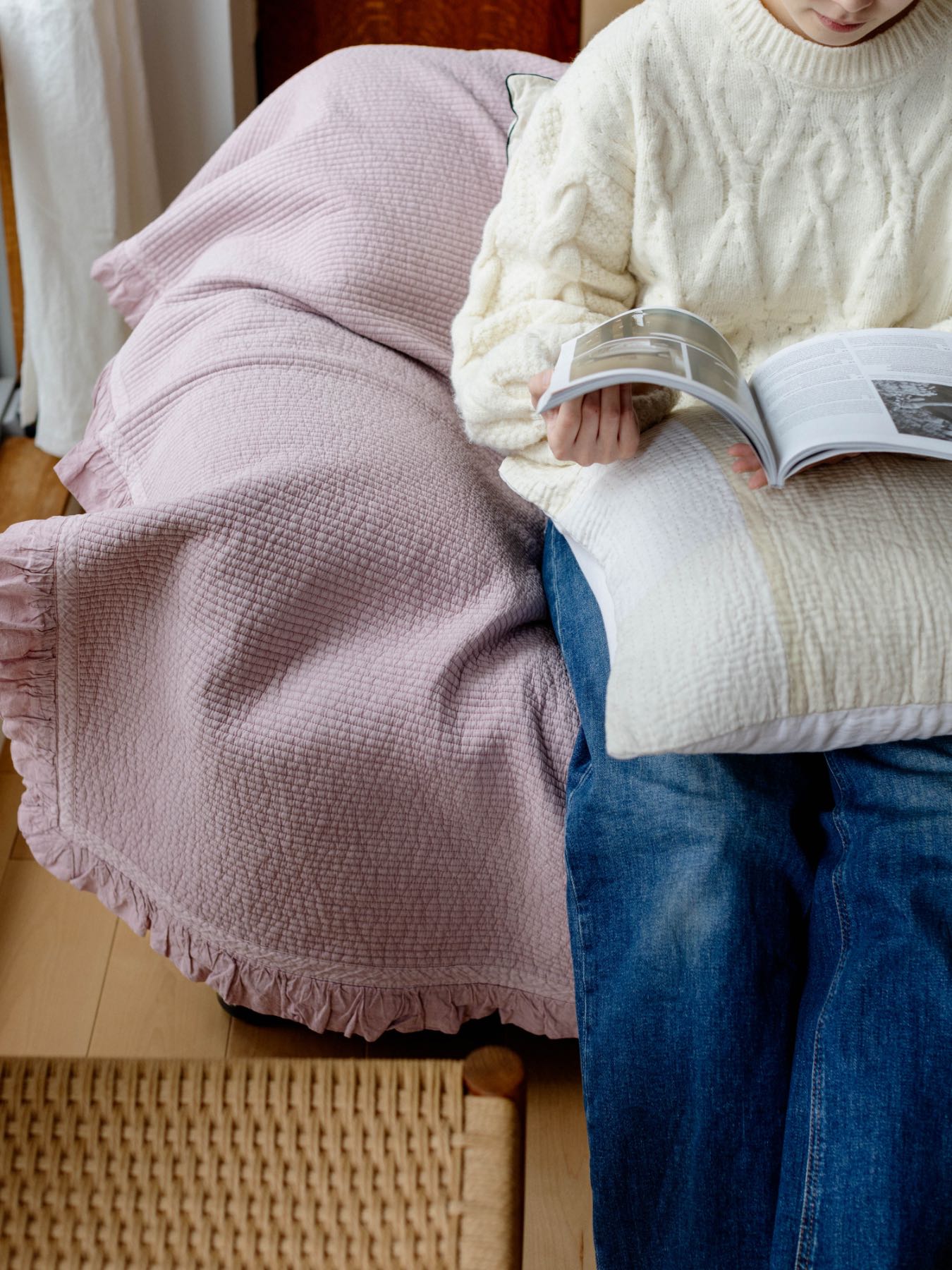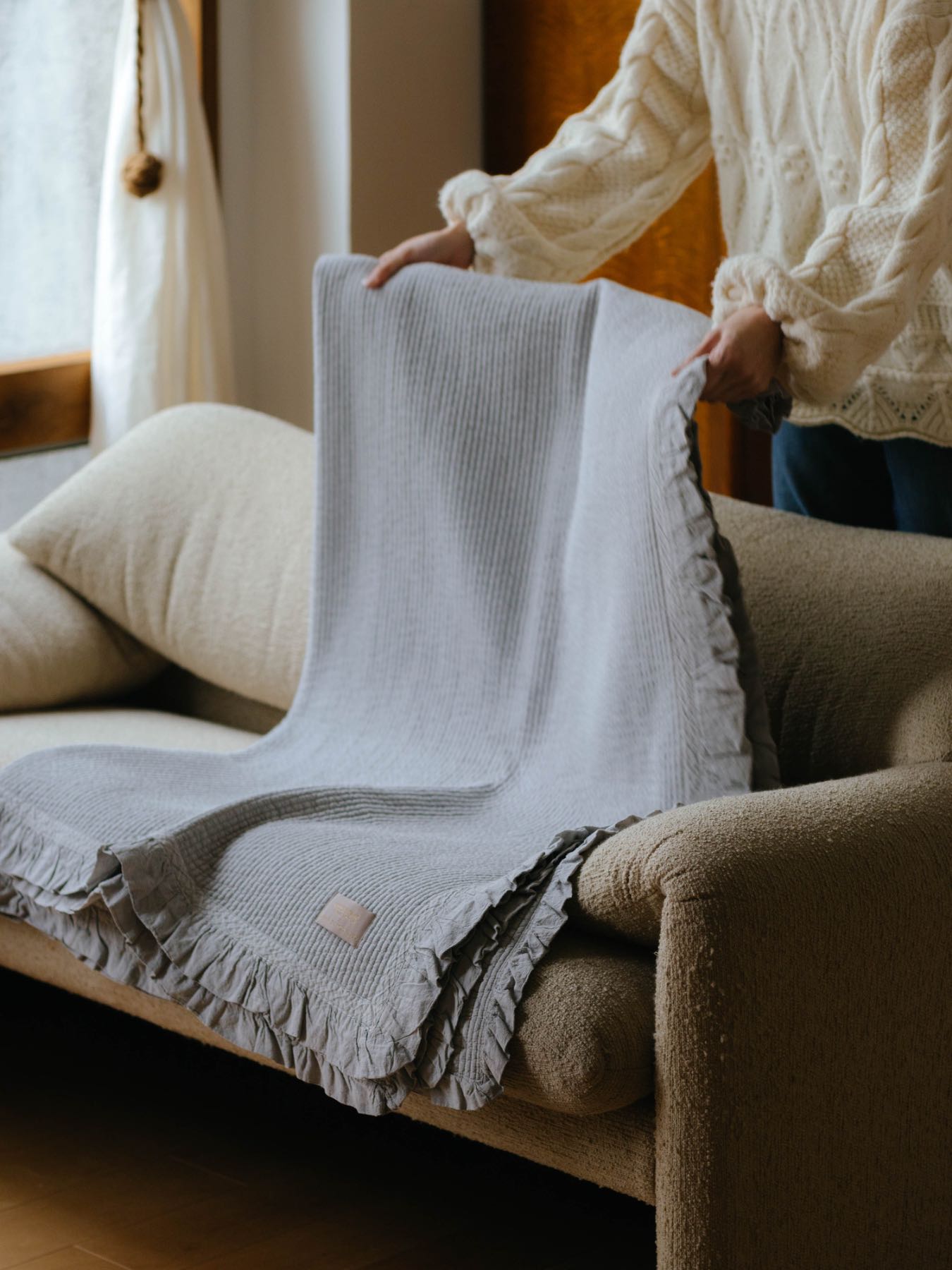 フチを囲むエレガントなフリルが、空間に静かな洗練を添えるデザイン。心地よい肌ざわりで、ベッドやソファをゆったりカバーできる大きさに仕上げました。