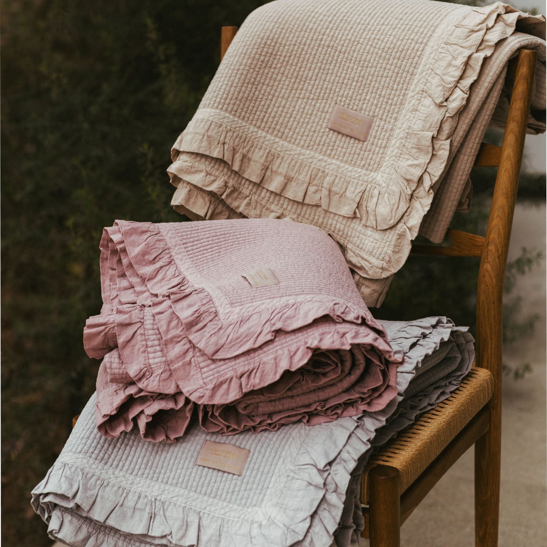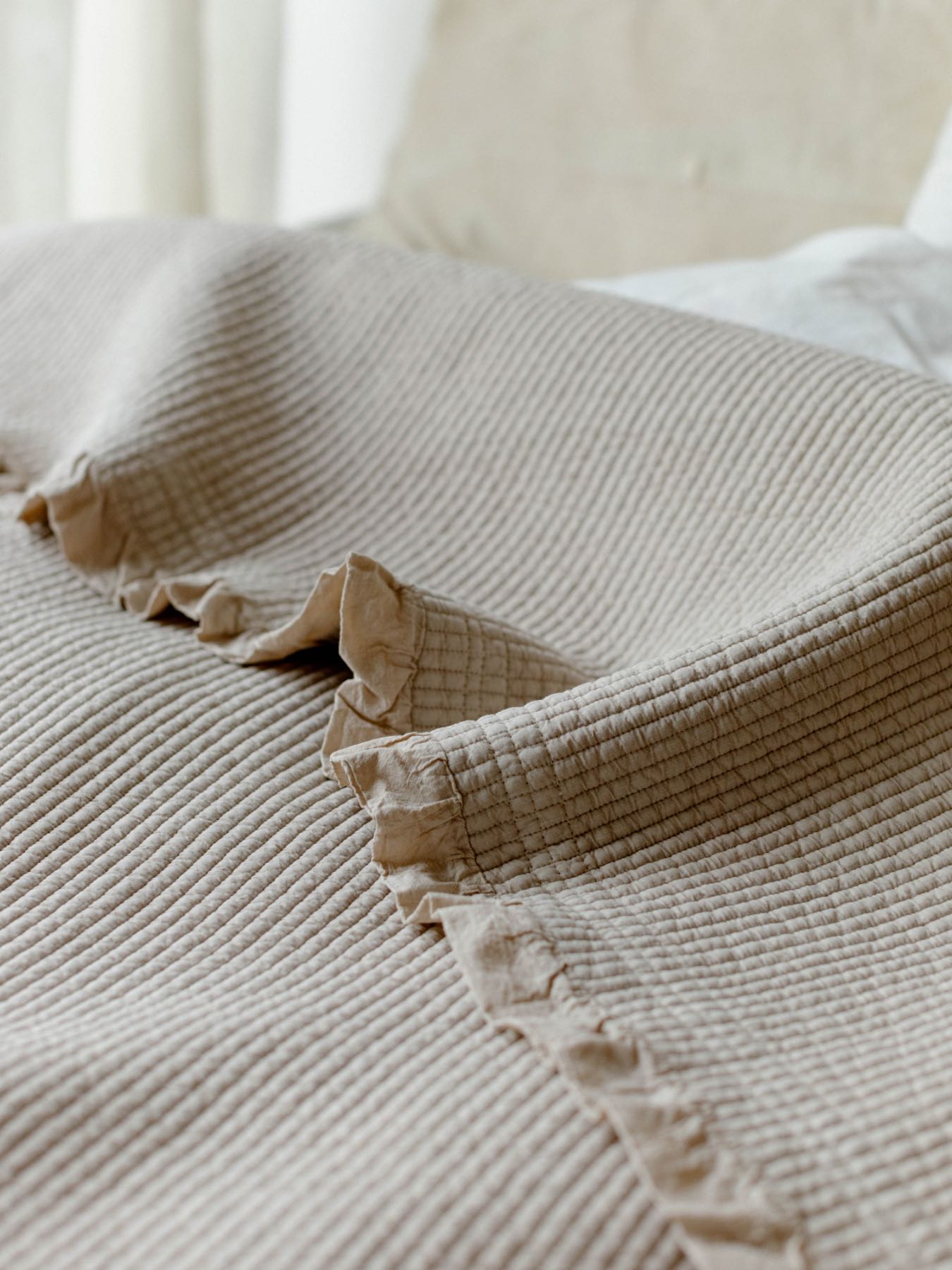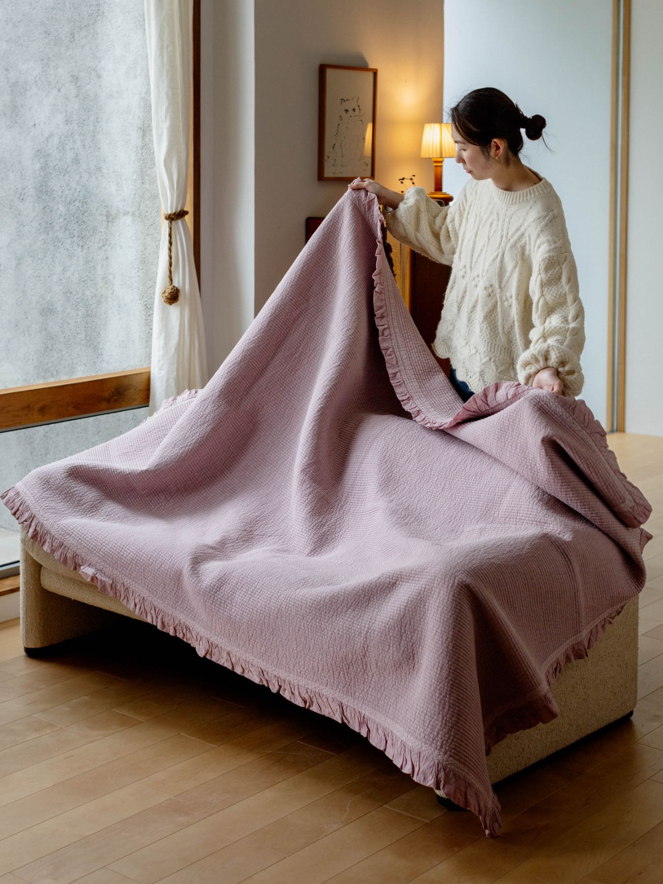 フチを囲むエレガントなフリルが、空間に静かな洗練を添えるデザイン。心地よい肌ざわりで、ベッドやソファをゆったりカバーできる大きさに仕上げました。