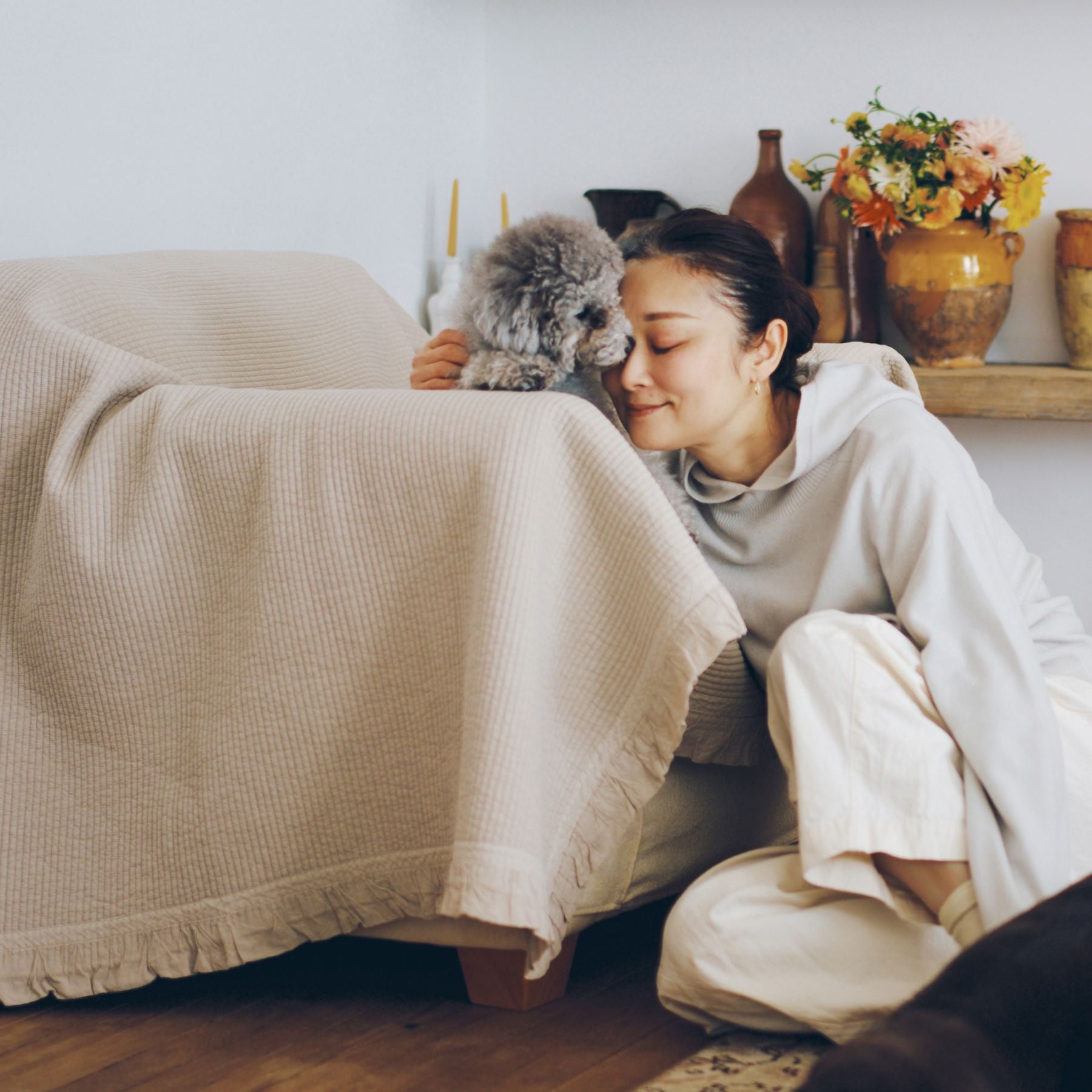 「キルティングの目が細かいので、丈夫で洗っても型崩れしにくいんです。それに乾燥も意外と早くて。家の中だけでなく、車でペットと一緒に移動するときにも、とっても重宝しています。」