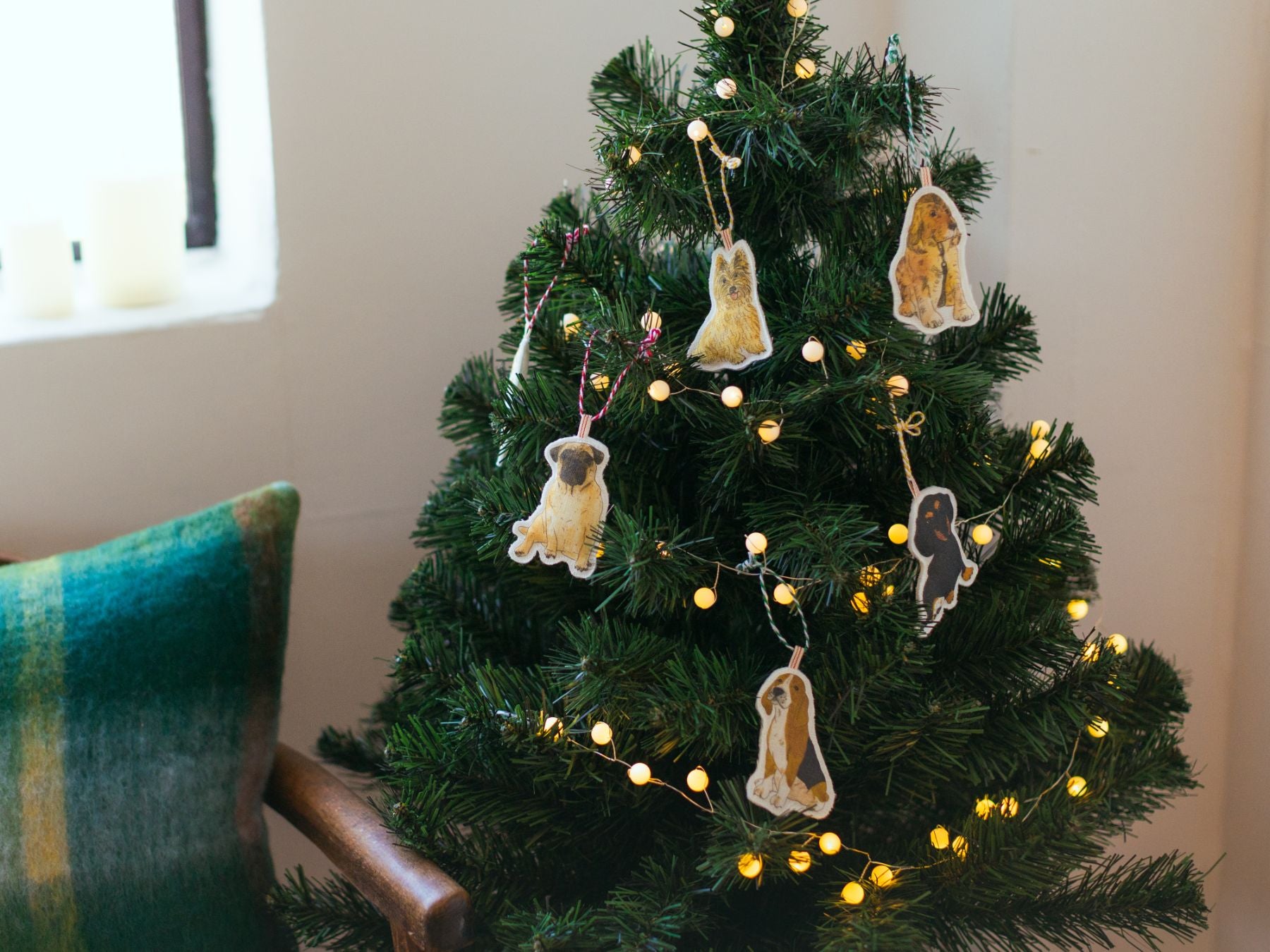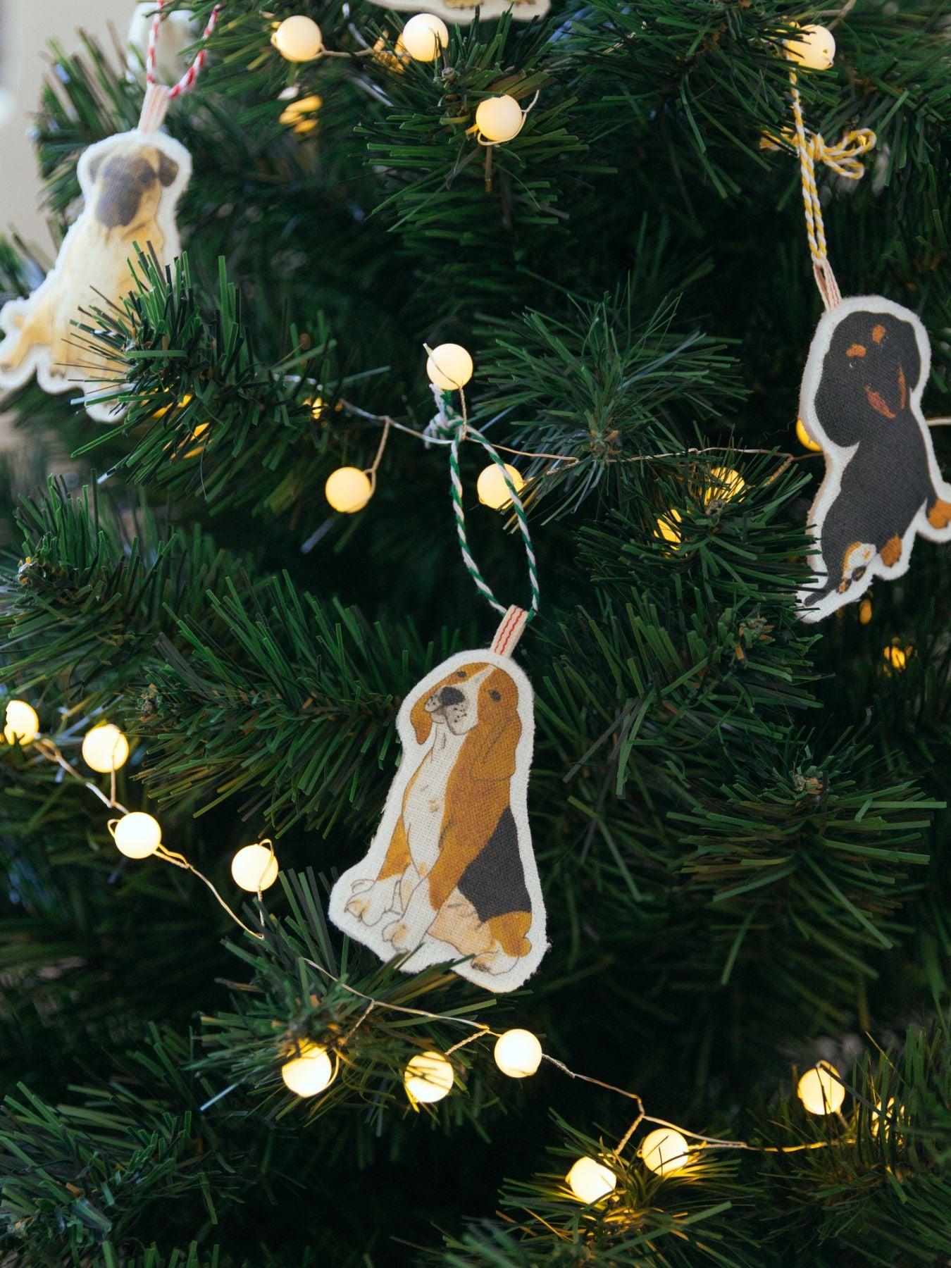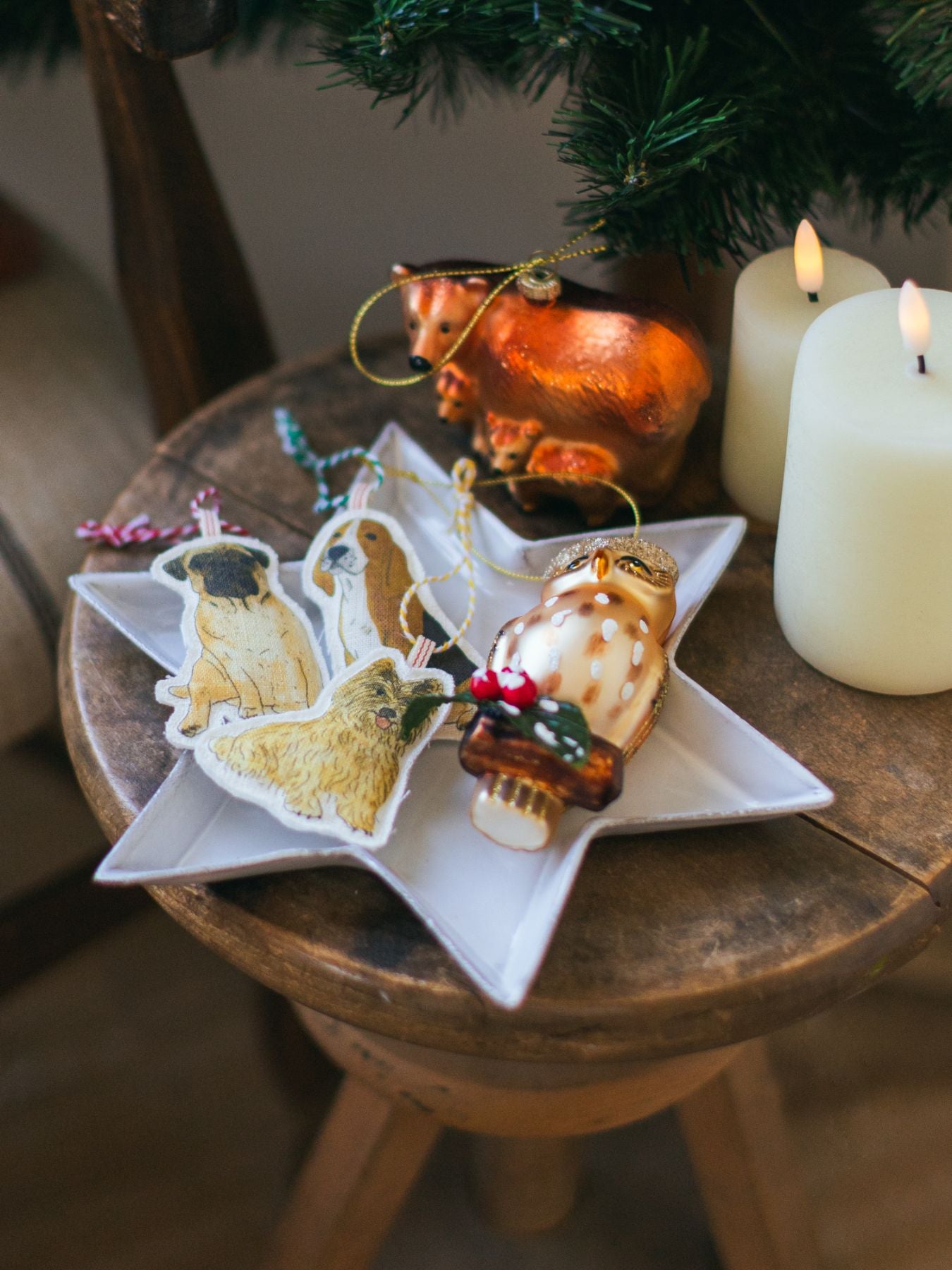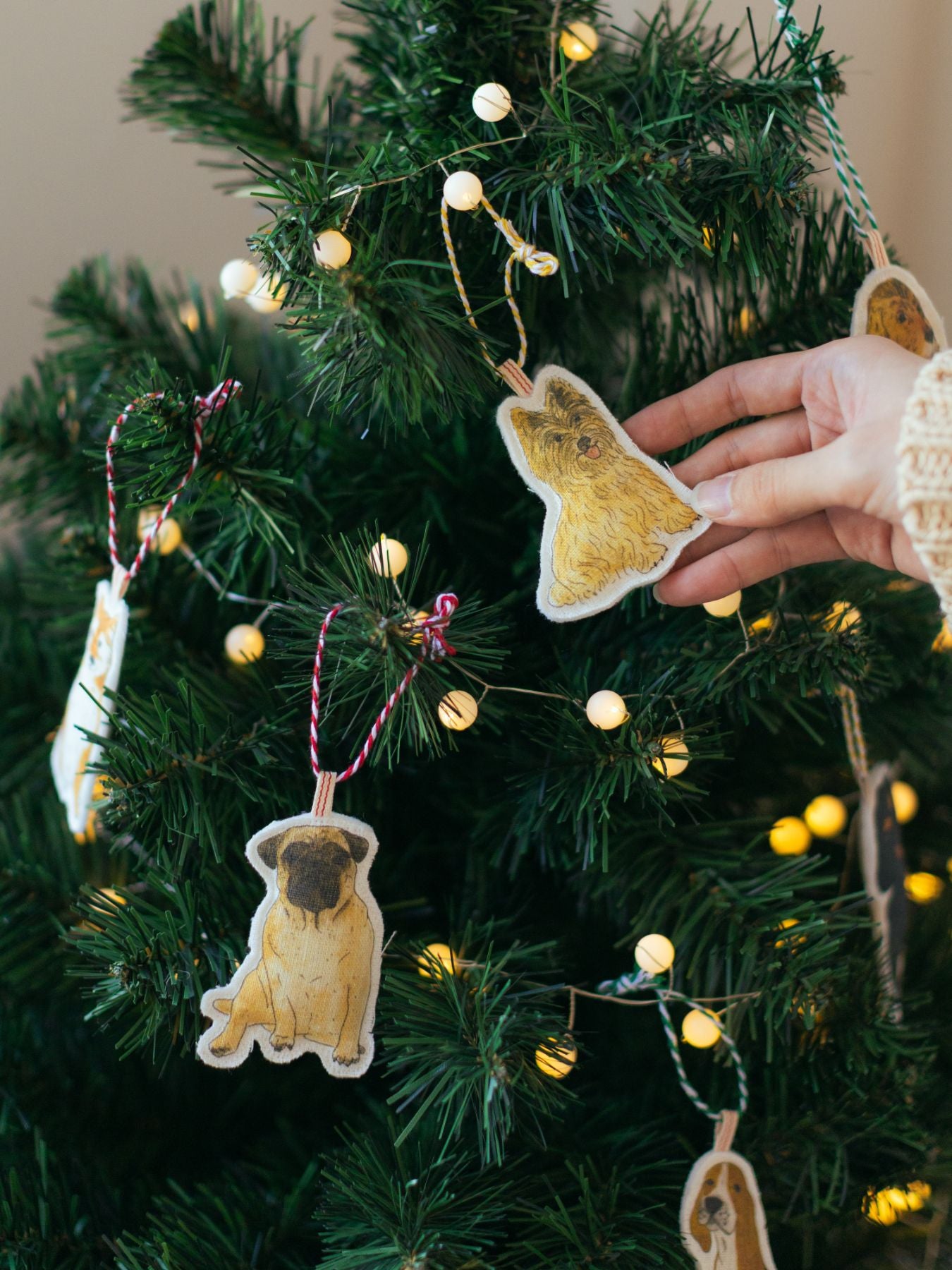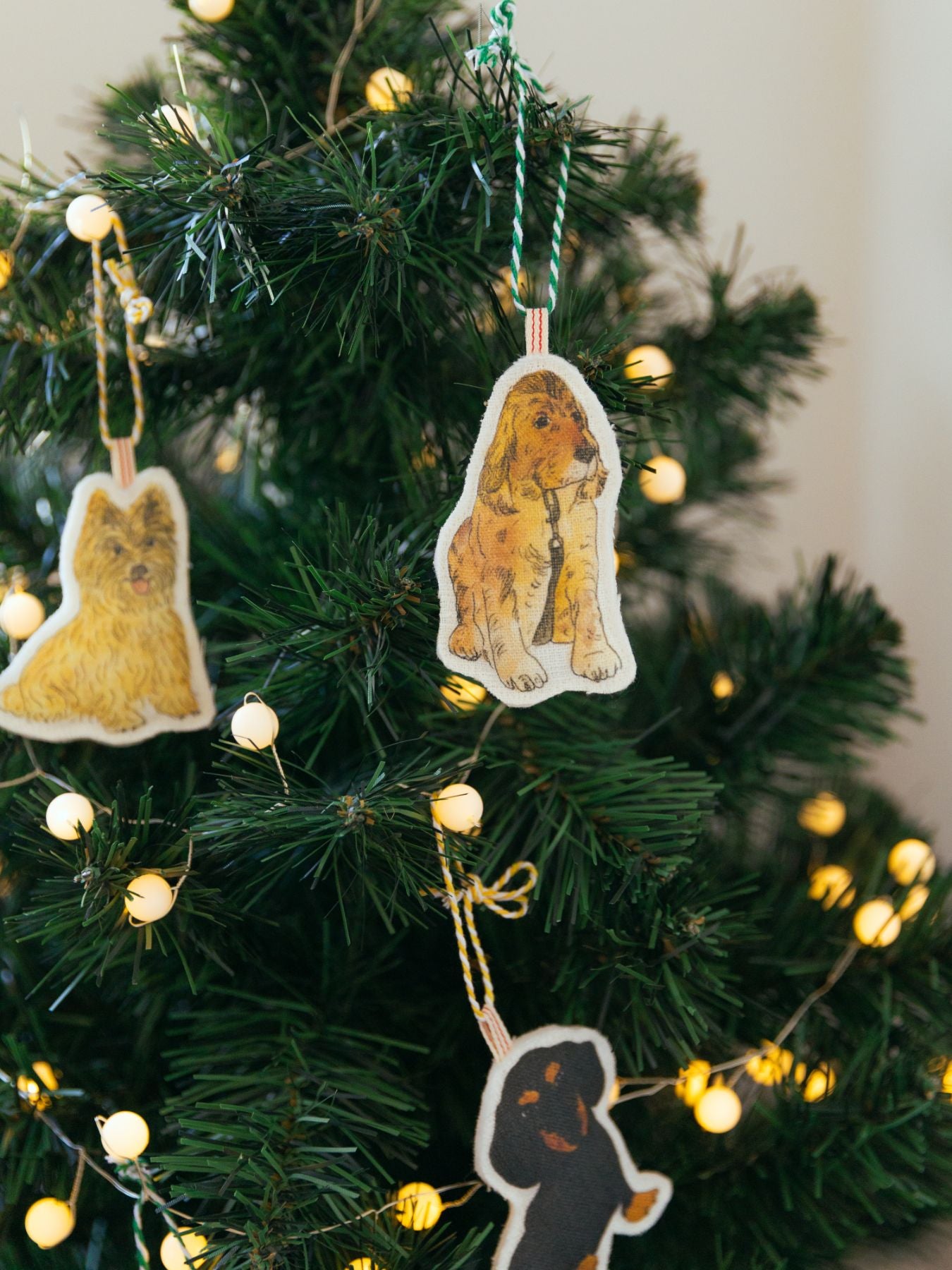 同じくイザベルさんに描き下ろしていただいた、クリスマスタペストリー(別売り)にオーナメントを飾っても素敵です。