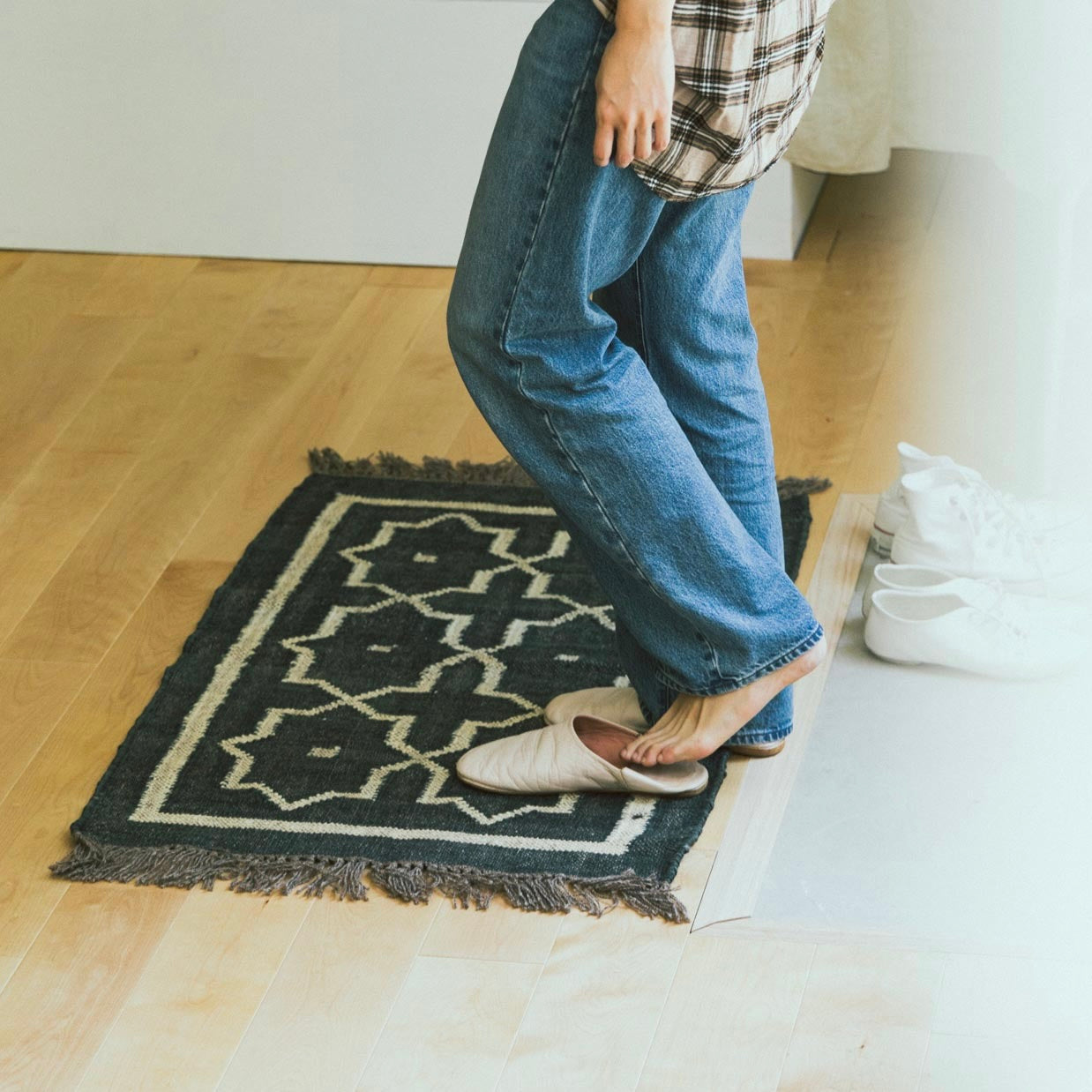 60×90cmのサイズは玄関マットにピッタリ。家の第一印象を決める玄関先に、ぬくもりと個性をプラスします。玄関以外でも、お部屋の小さなコーナーづくりに取り入れれば、よいアクセントになりますよ。