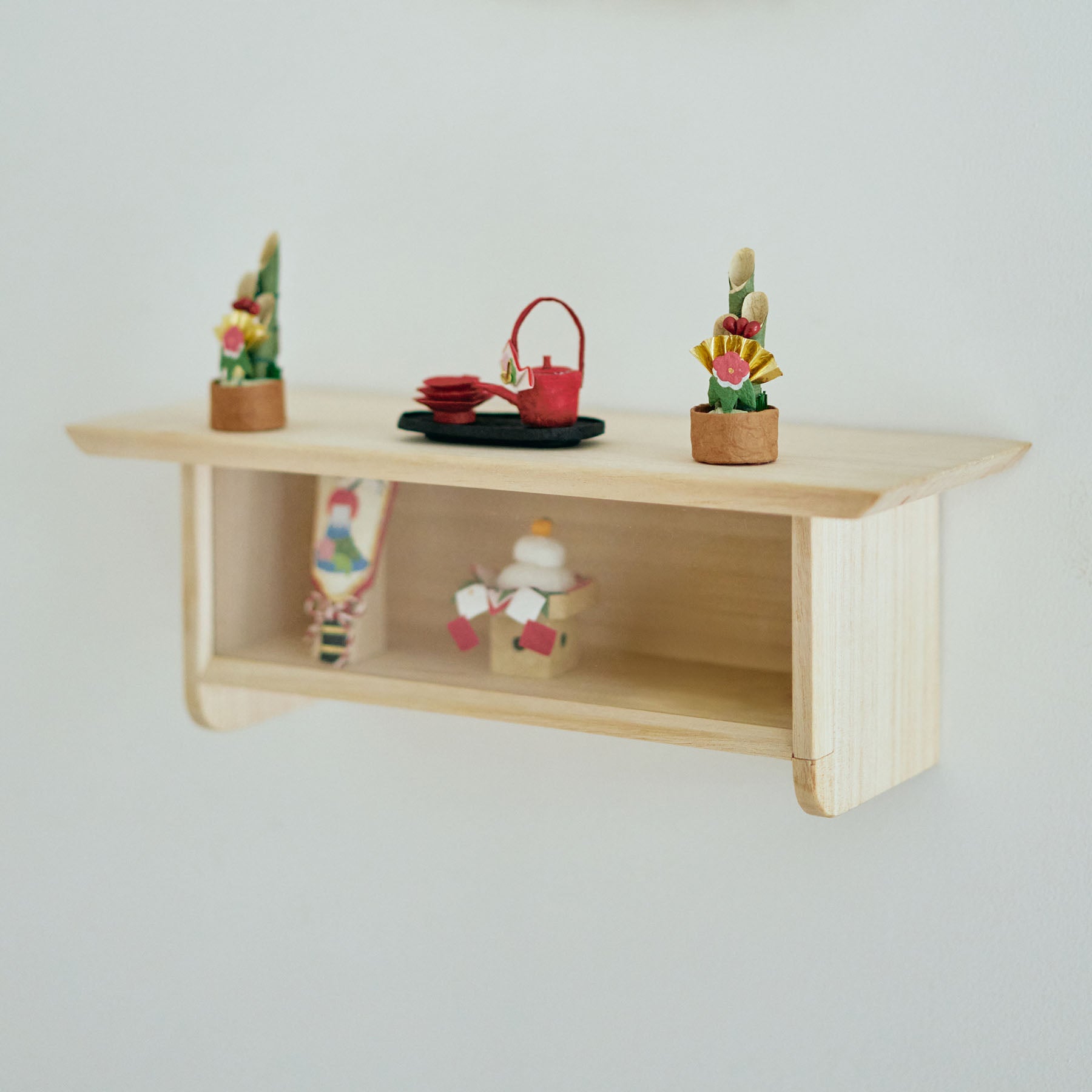 桐の風合いが映えるクリーンな佇まい。どこか鳥居も連想させ、お部屋になじむ神棚として使っていただけます。