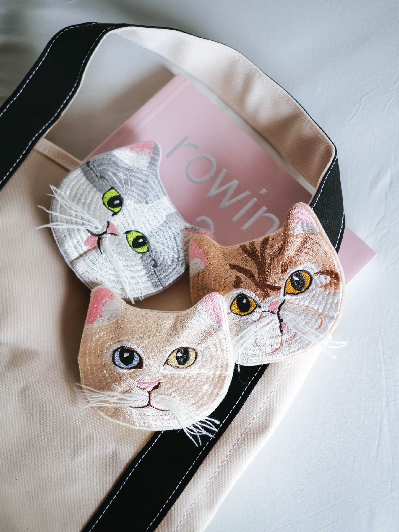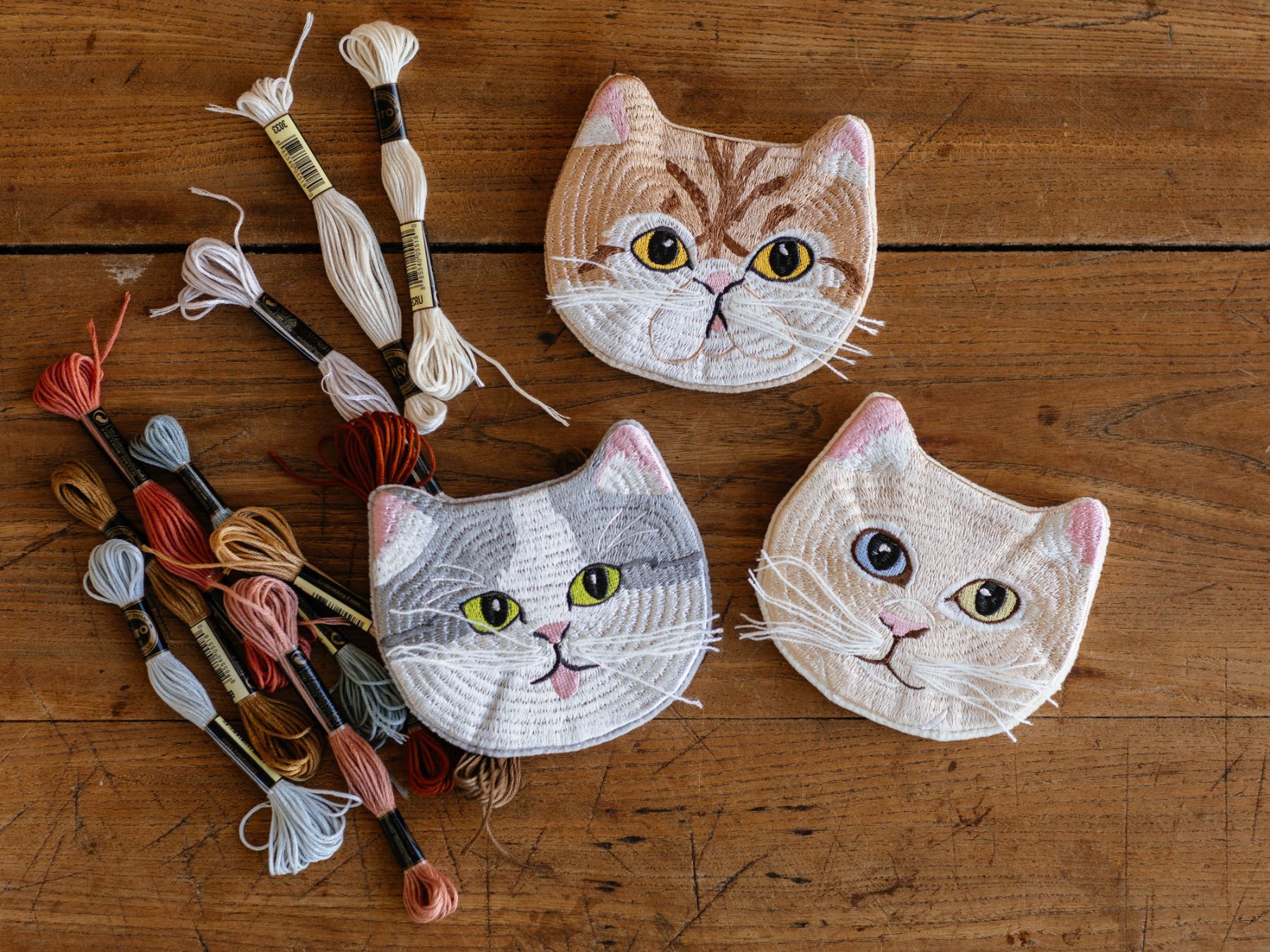生き生きとした猫たちの表情や、手刺繍ならではの立体的であたたかな毛並み。その魅力あふれるディテールを大切になぞりながら、機械刺繍で再現しました。