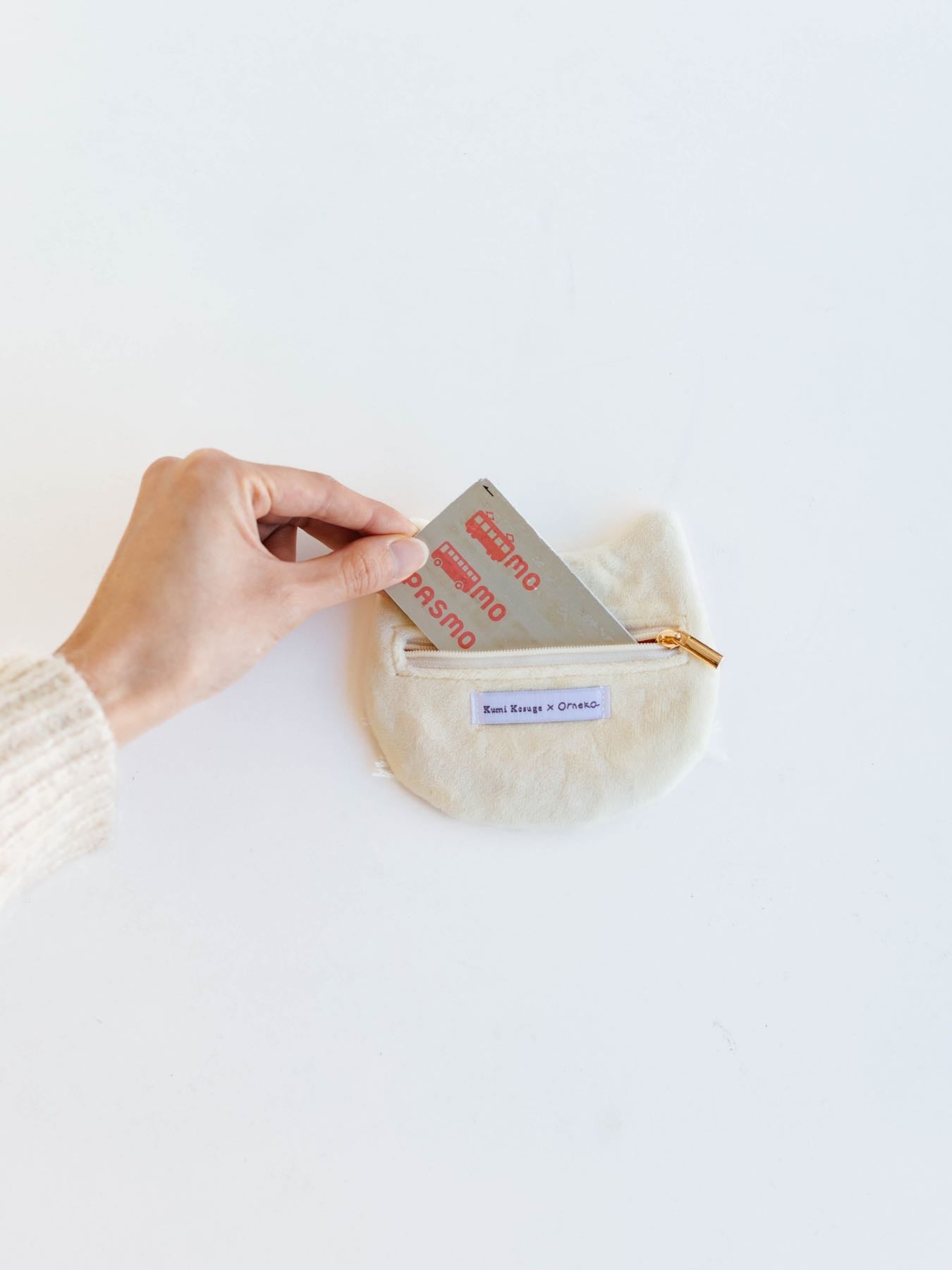 ポーチ裏側にファスナーと、「Kumi Kosuge × Orneko」のタグ付き。