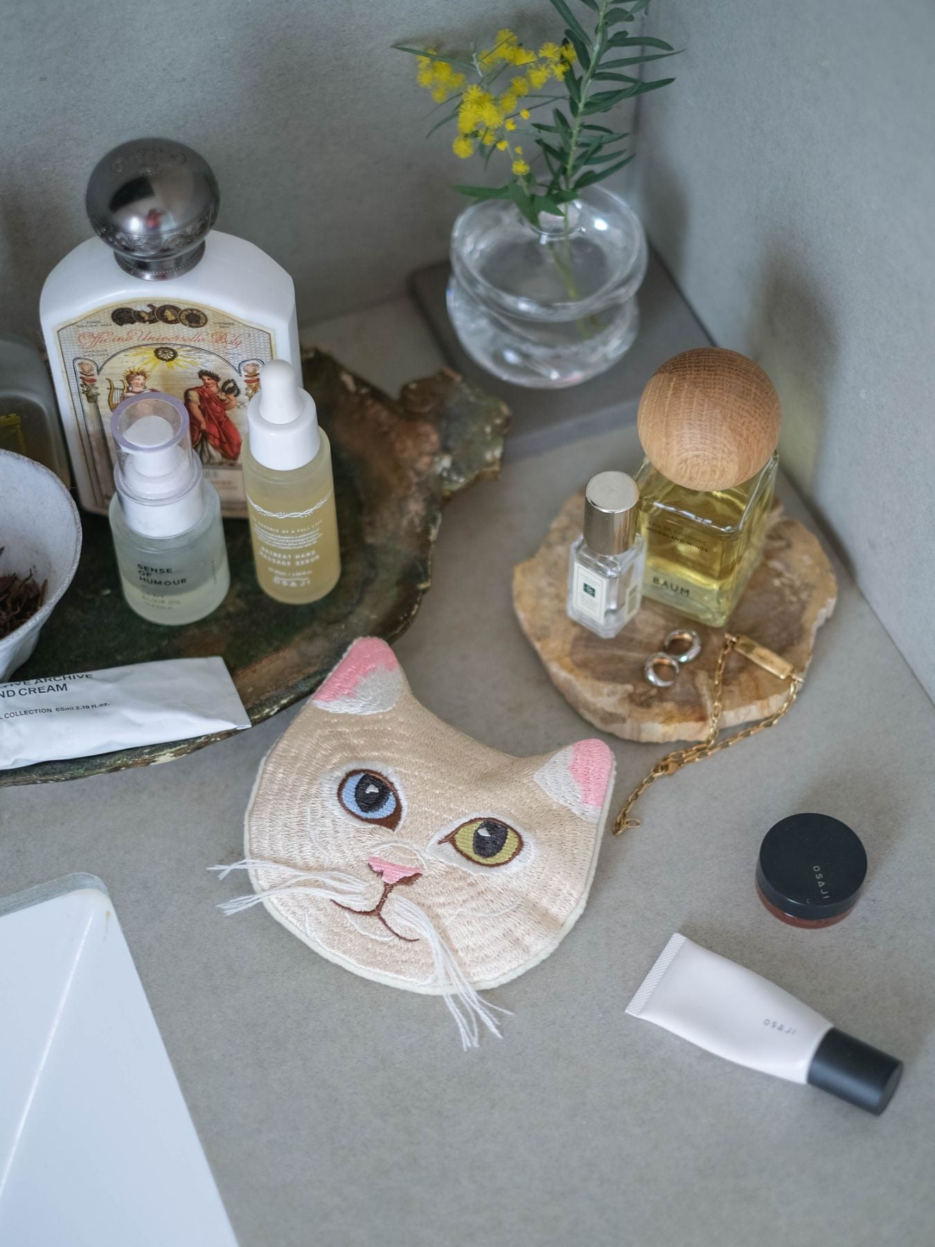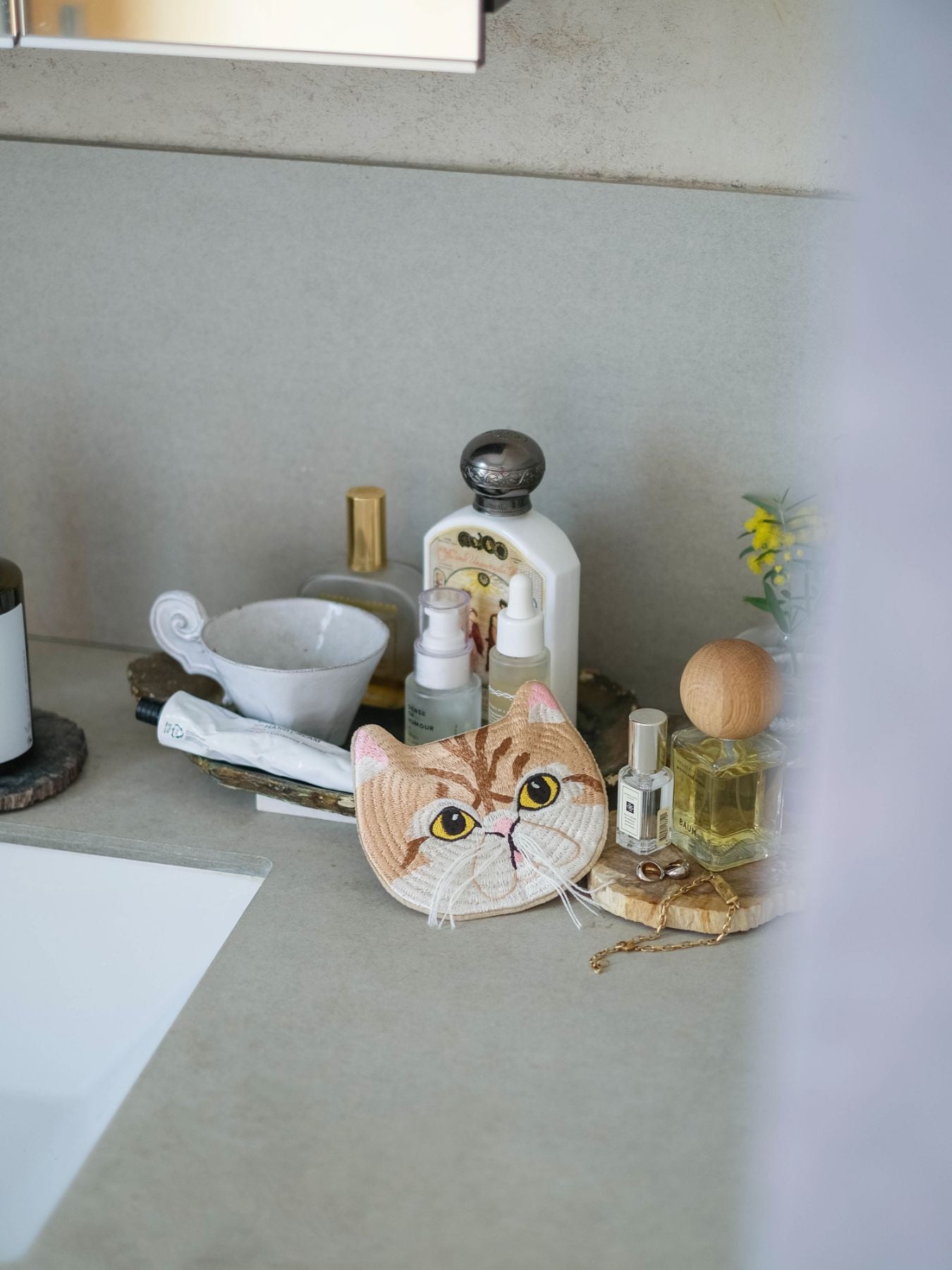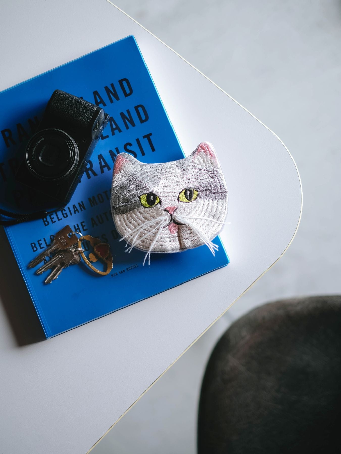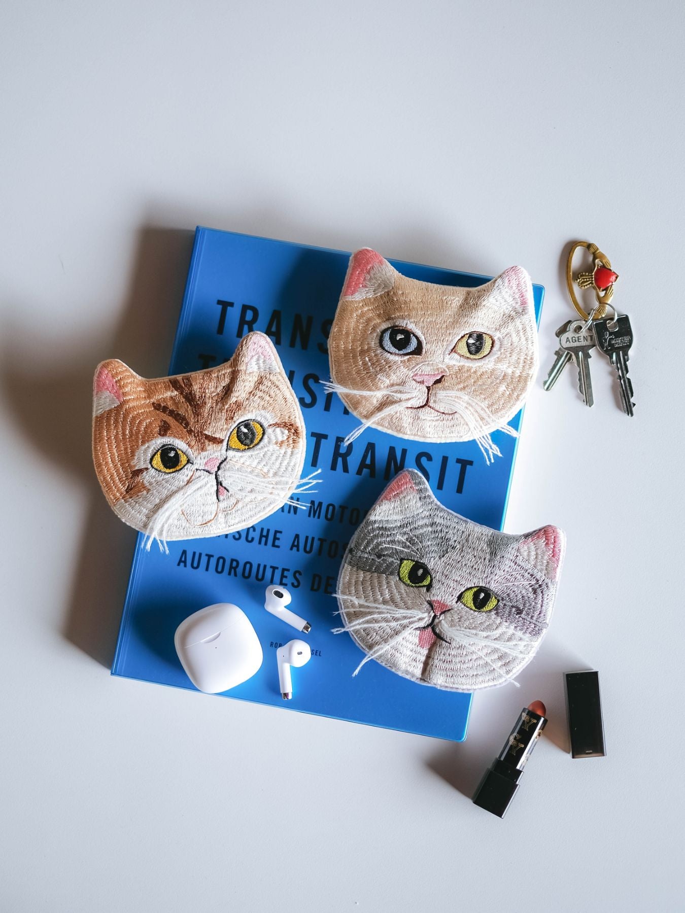 小菅さんの猫を、機械刺繍でていねいに再現。手刺繍の温かみをどこかに感じながらも、毎日気軽に使えるポーチになりました。ここでしか手に入らない遊び心あふれる3匹を、ぜひおでかけに連れ出してくださいね。
