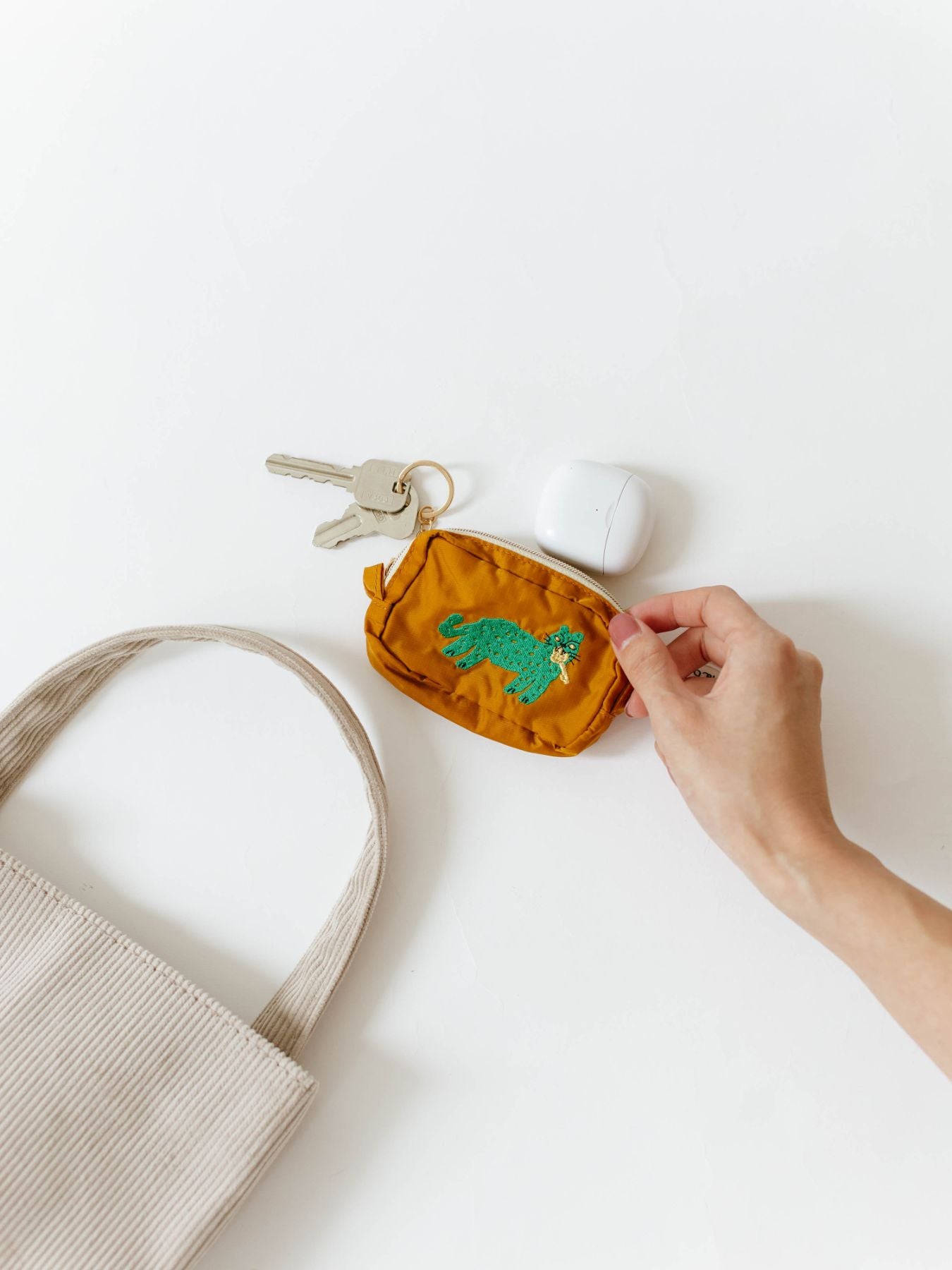内側はキーリング付きで、ポケットから顔を出した猫がポーチの中身をしっかり見守ってくれています。