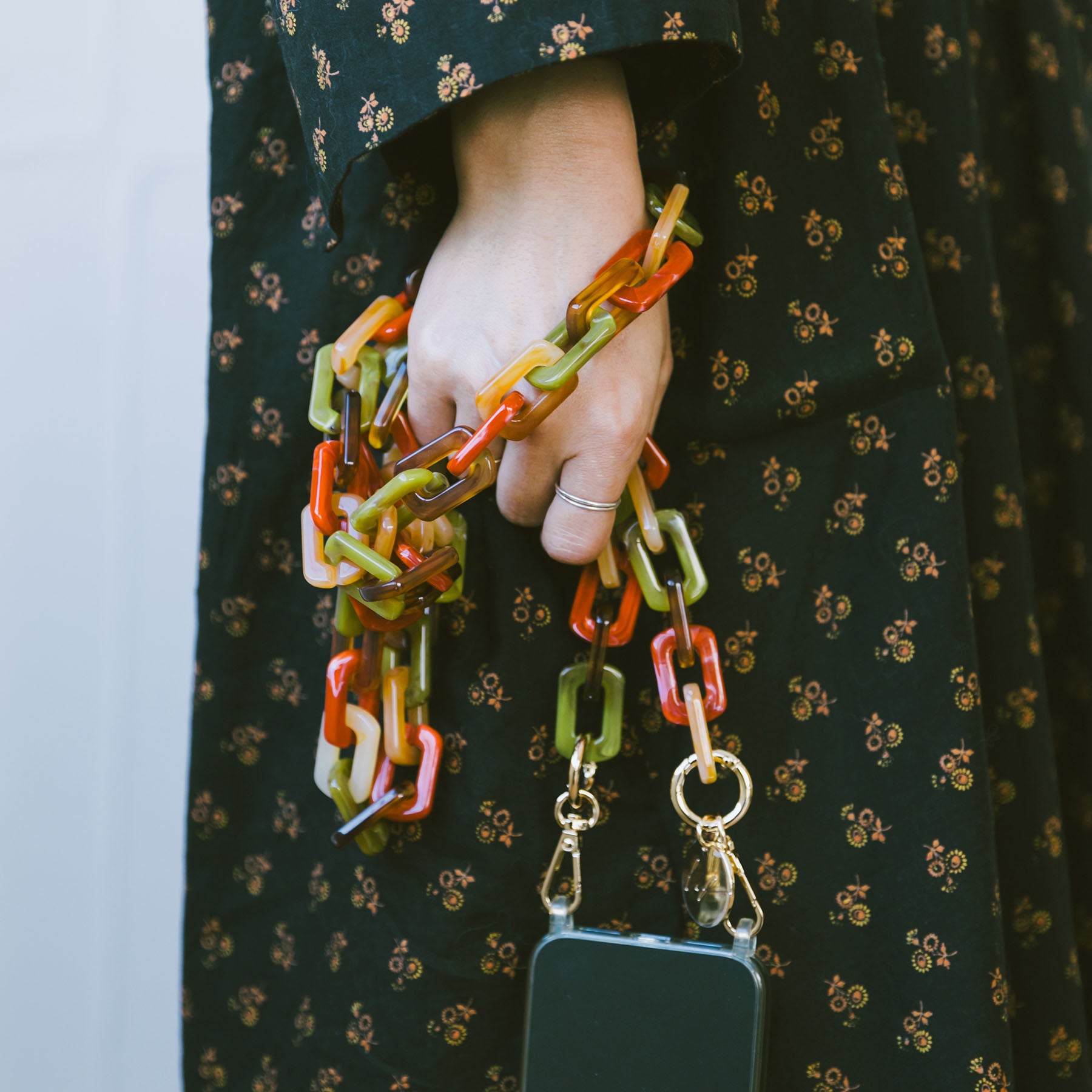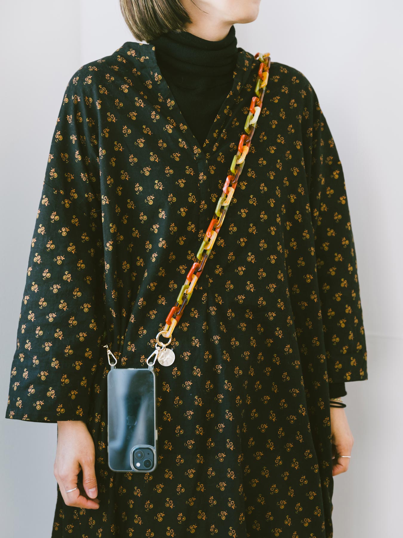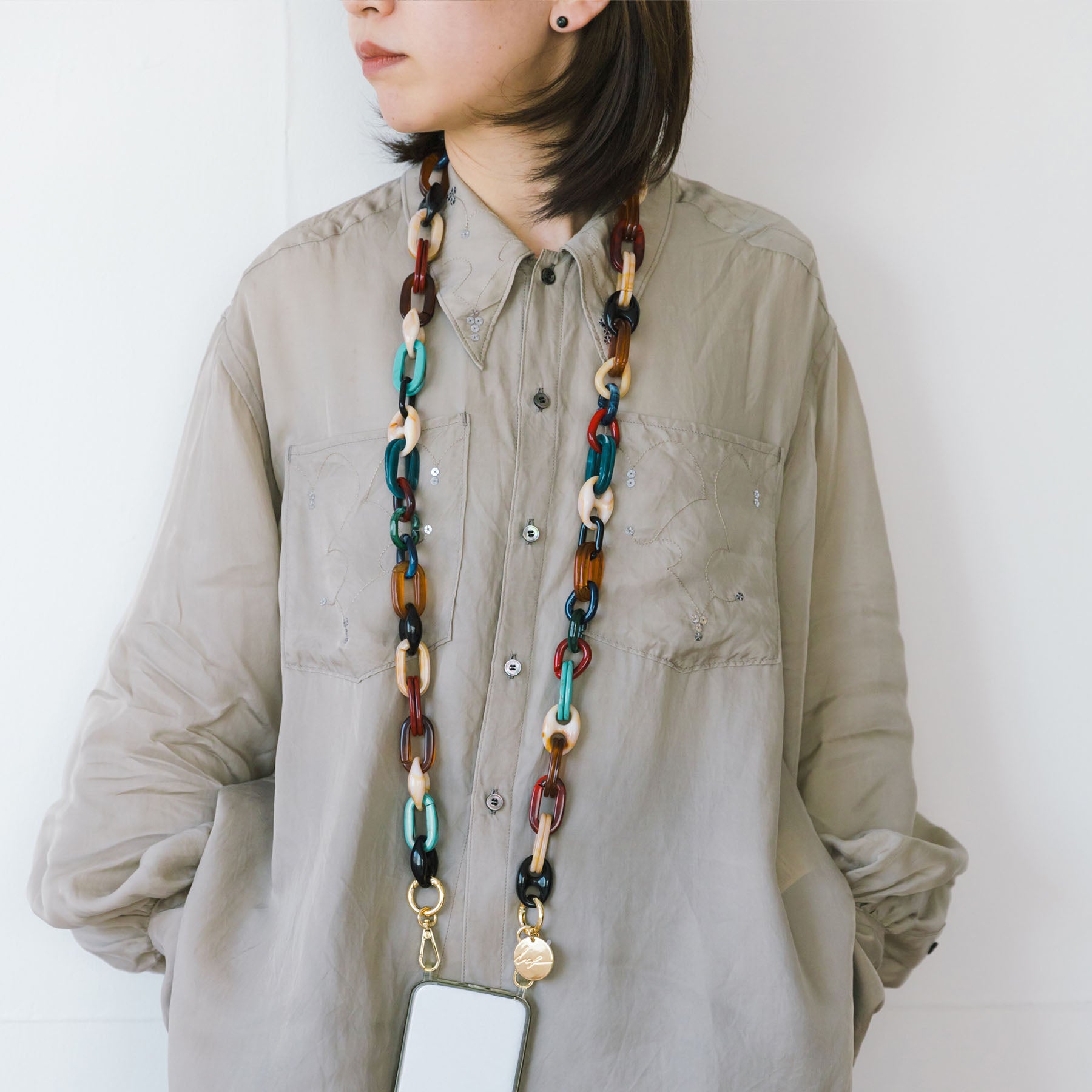 樹脂素材ならではの軽やかさと、カラフルでボリューム感のあるじゃらじゃらデザインが魅力のアイテムです。スマホを肩や首から提げるだけで、アクセサリーのような華やかさをプラス。シンプルなコーディネートのアクセントにもぴったりです。
