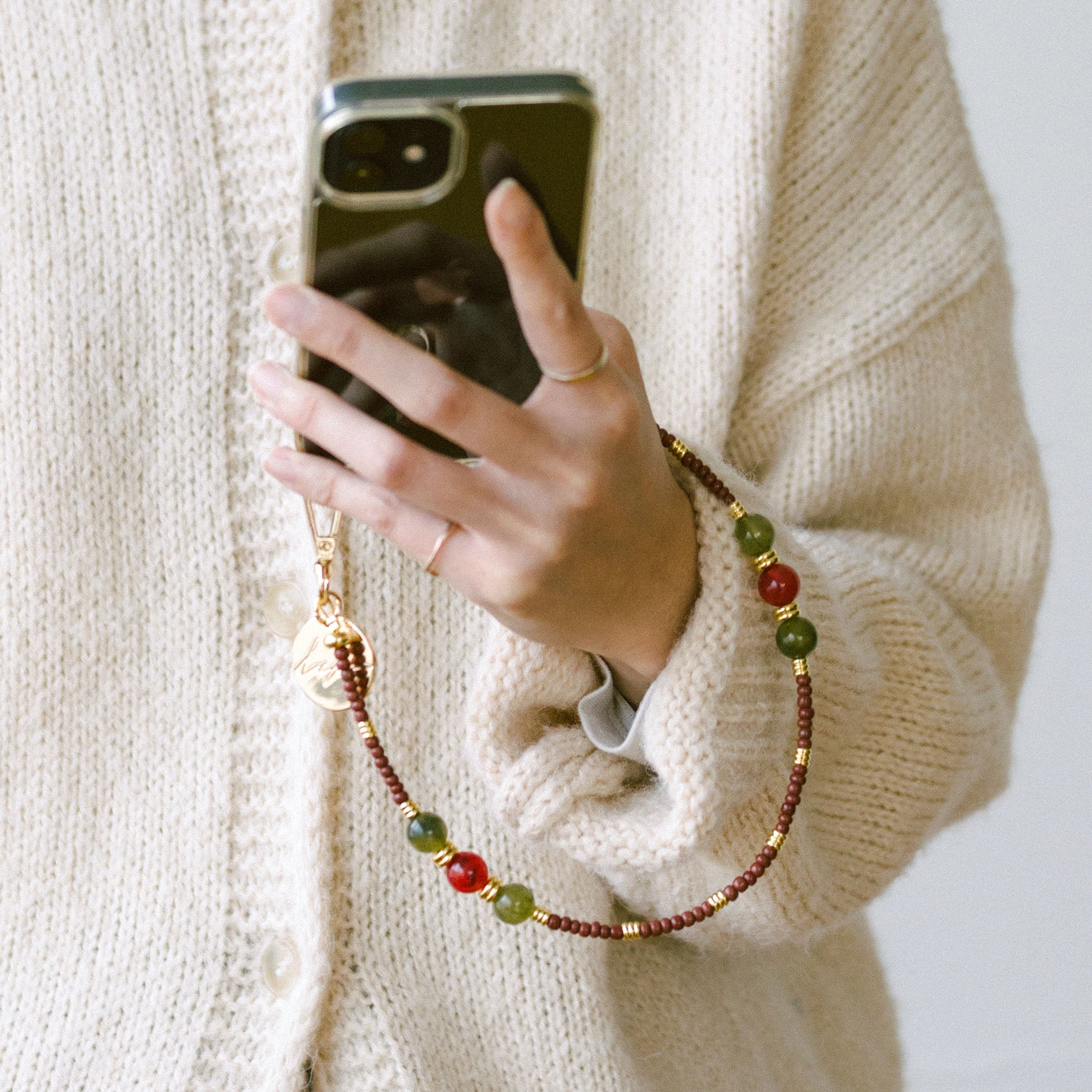 樹脂素材ならではの軽やかさと、カラフルでファッショナブルなデザインが魅力のアイテムです。スマホを手に持ったり腕にかけるだけで、アクセサリーのような華やかさをプラス。シンプルなコーディネートのアクセントにもぴったりです。