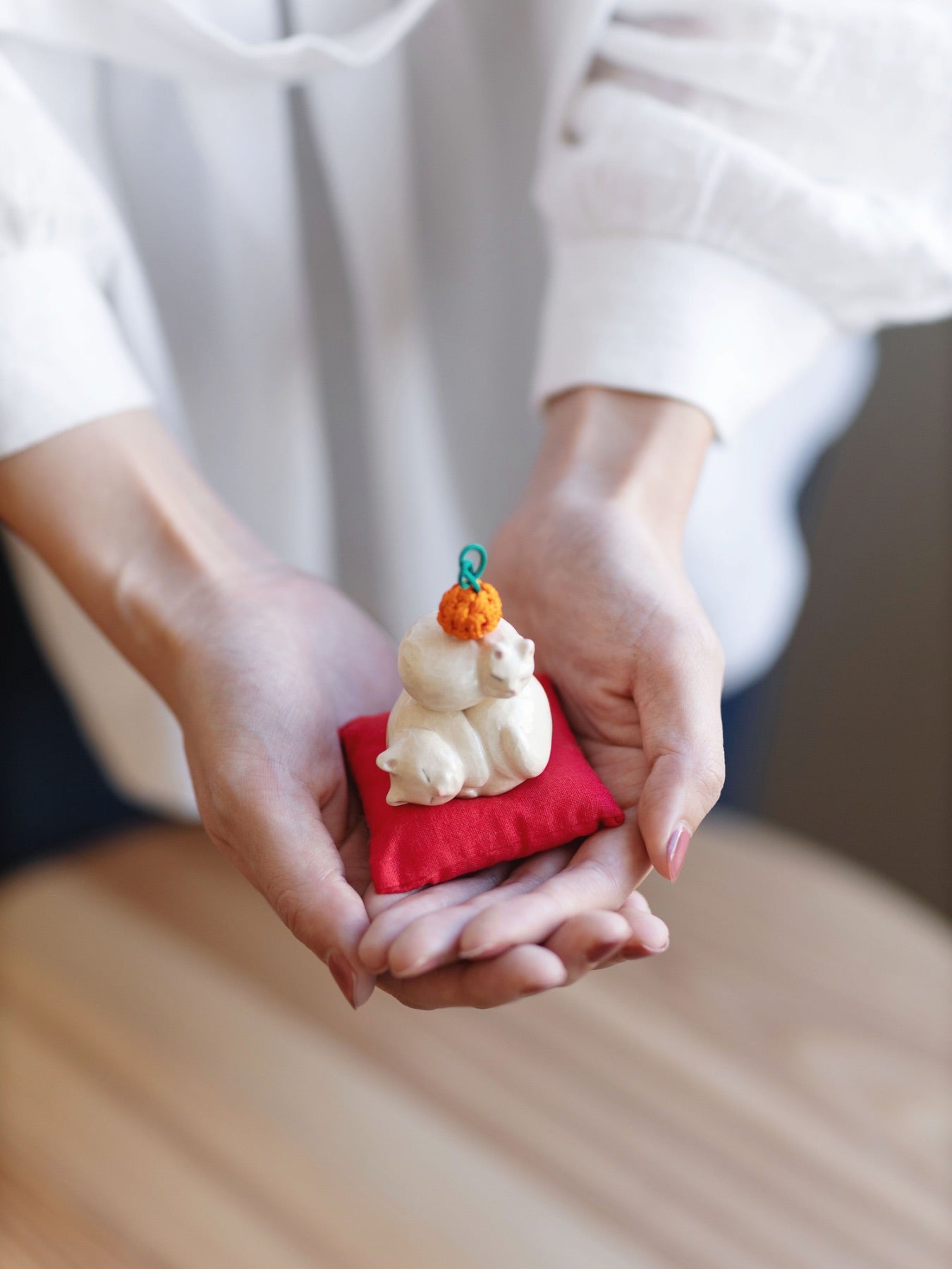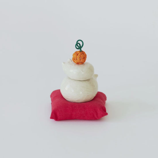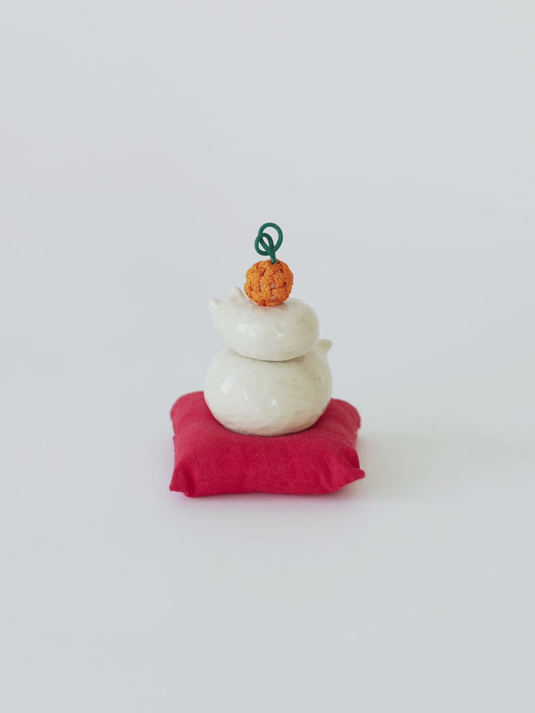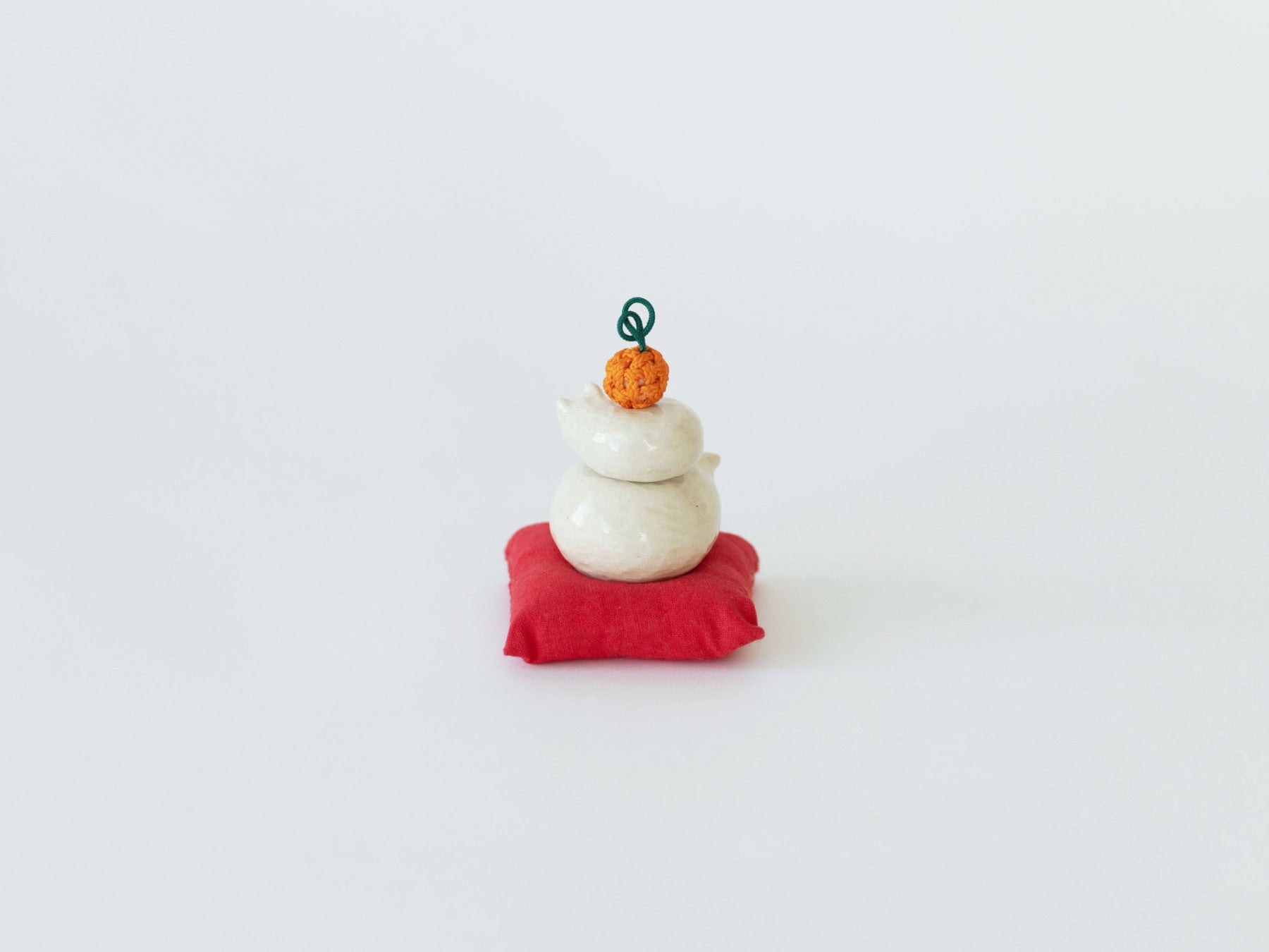 一見すると鏡餅ですが、よく見るとネコ。そんな、ユーモアたっぷりの美濃焼の鏡餅を、ま工房さんと作りました。