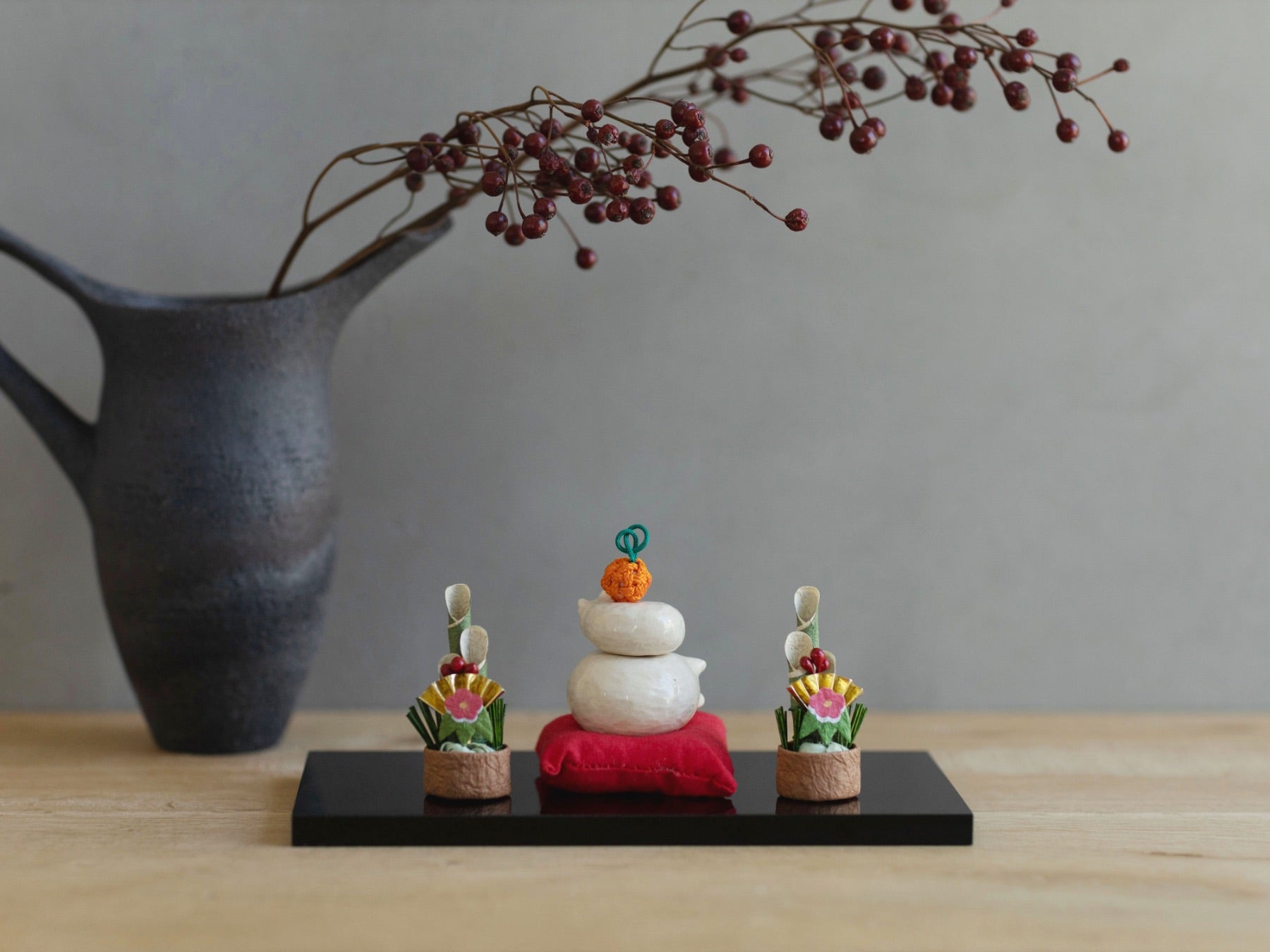 写真で合わせているのは、和紙のお正月飾り(門松と黒塗り台)。