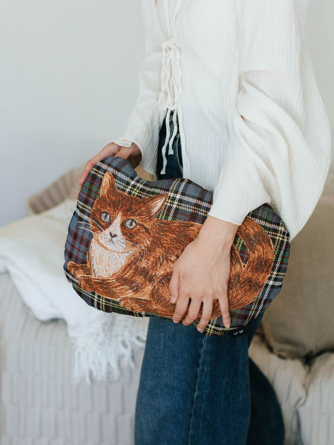 個性豊かな4匹の猫たち。イラストの雰囲気そのままに、表情や毛並みまで細やかにゴブラン織で表現されています。背面には「m.matsuo」の文字も。