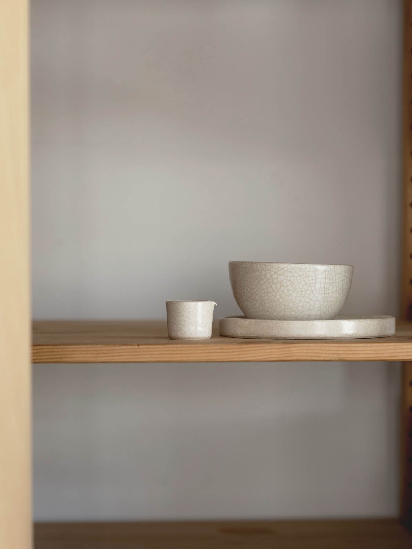 合わせたトレイは、貫入の模様を籠の網目と見立てて、籠のお盆のようなイメージで作られたもの。