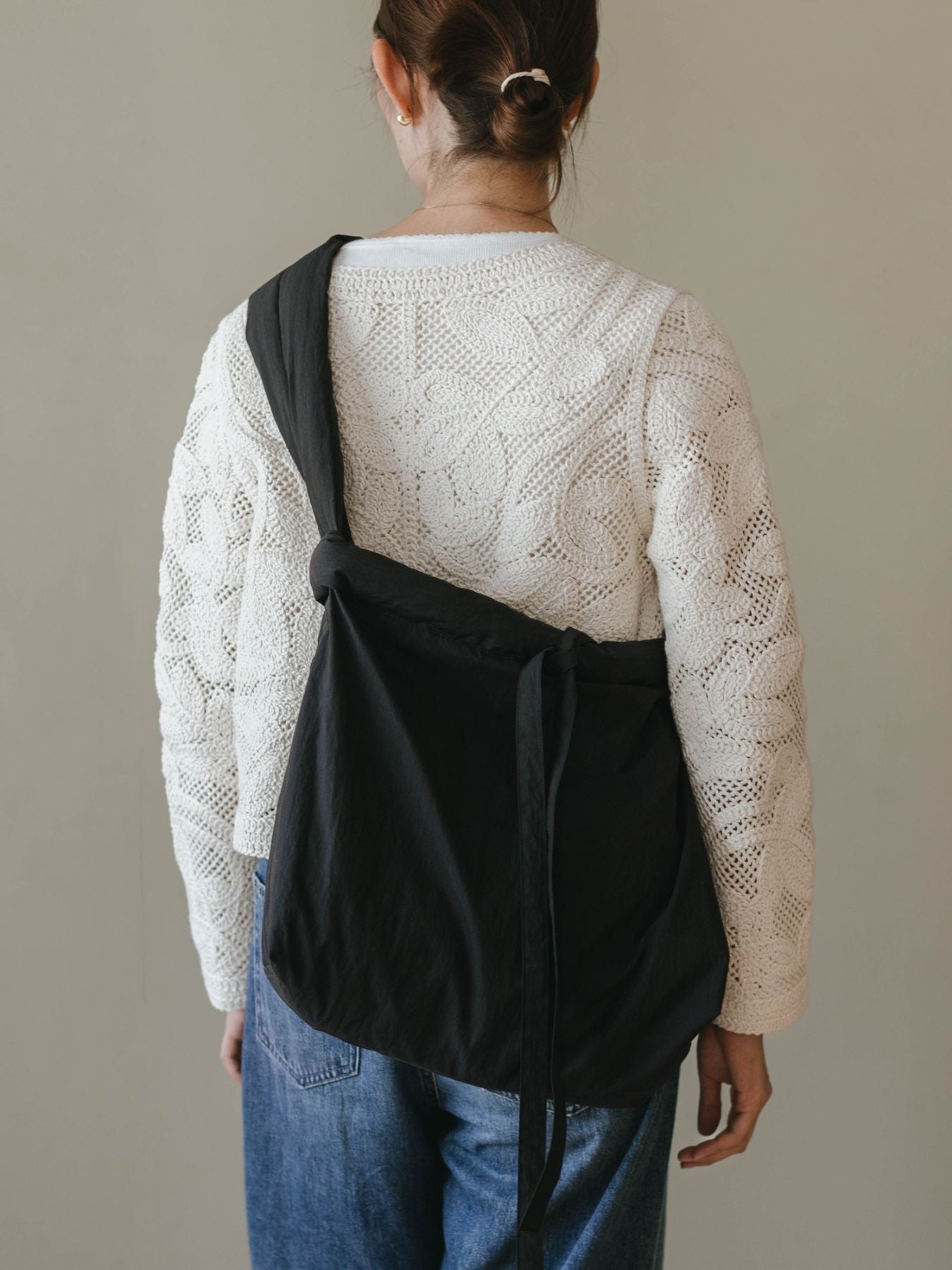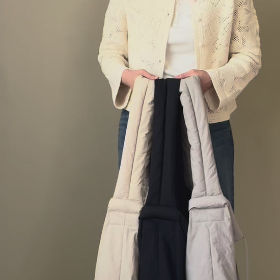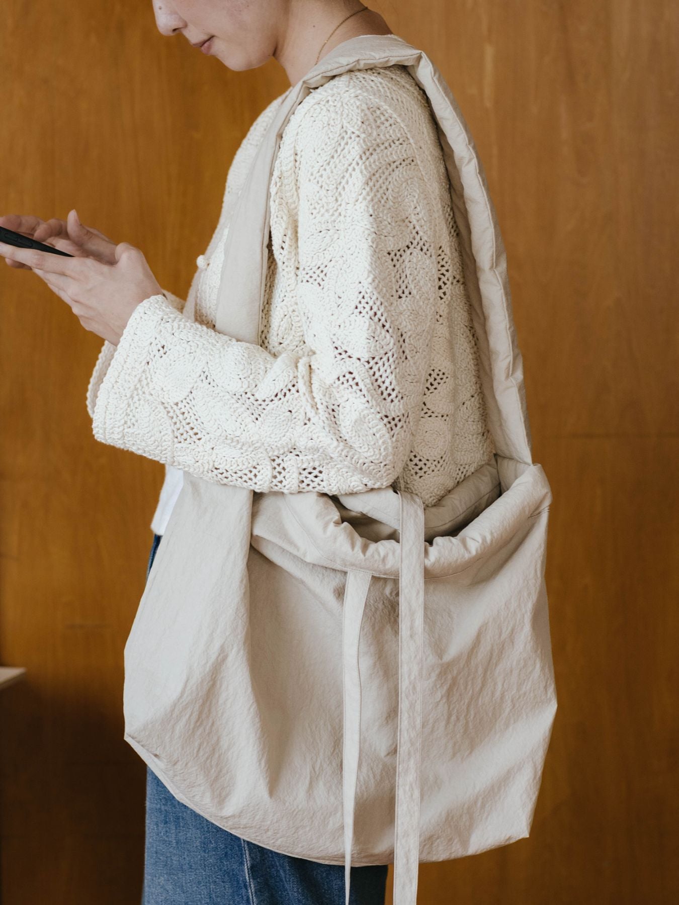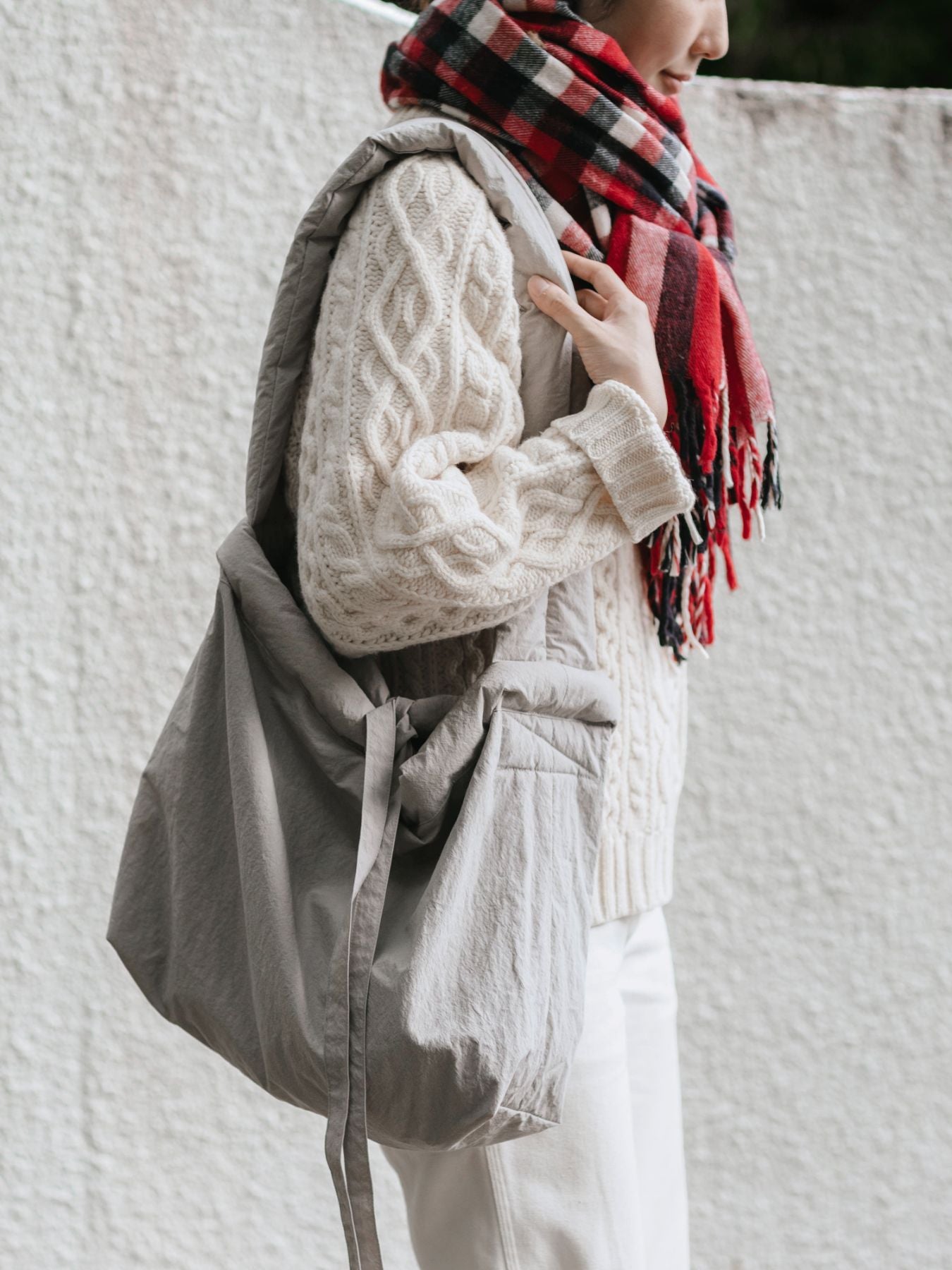 ショルダー部分と開口部には中綿を入れ、ふっくらとしたやさしい手触りに。