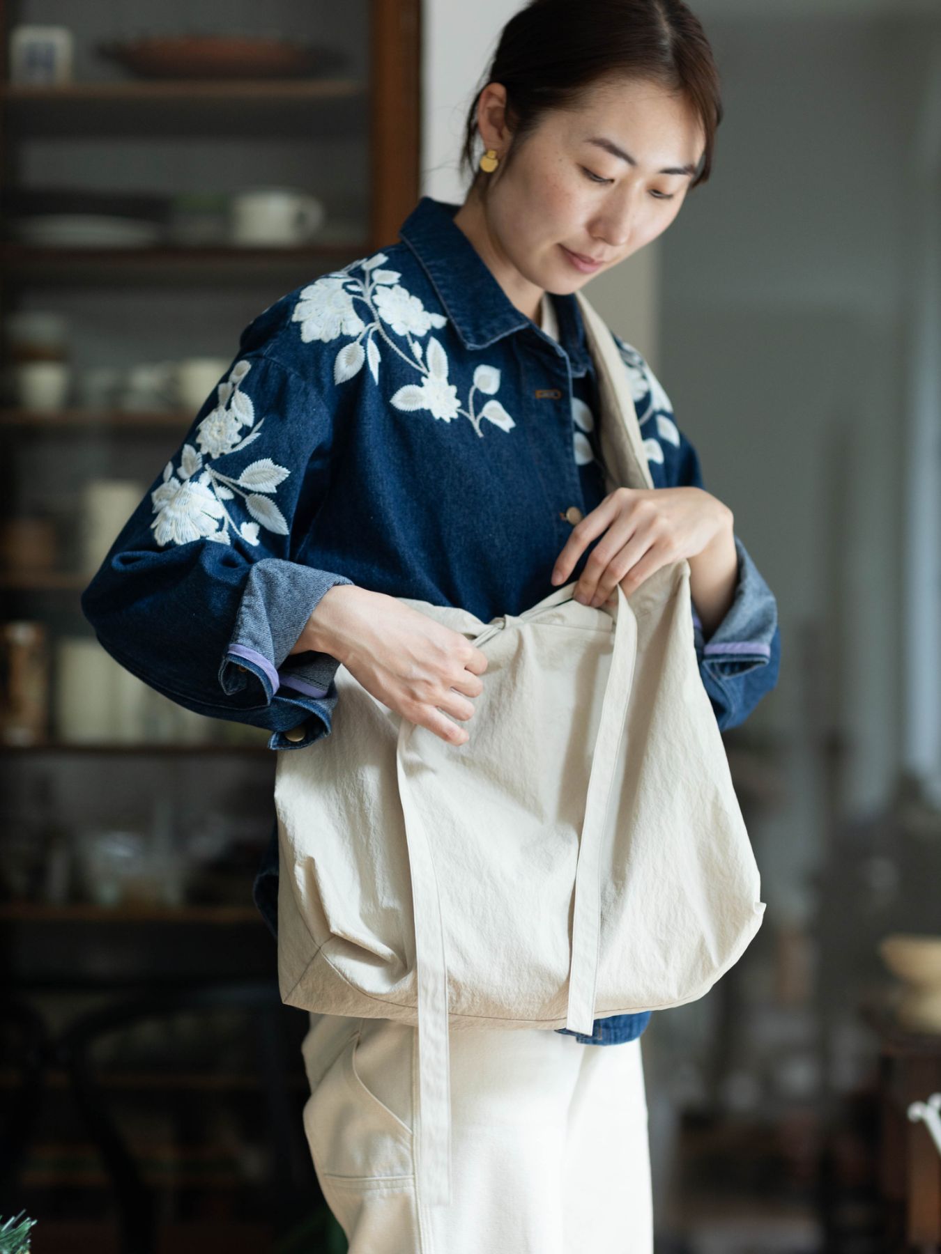 コットンとナイロンを混紡した生地は、程よい厚みと張りがありながらも軽やか。