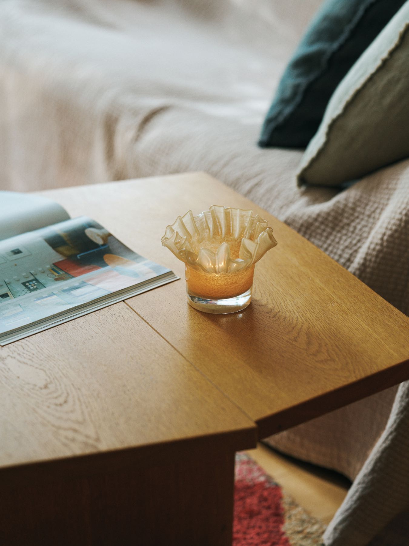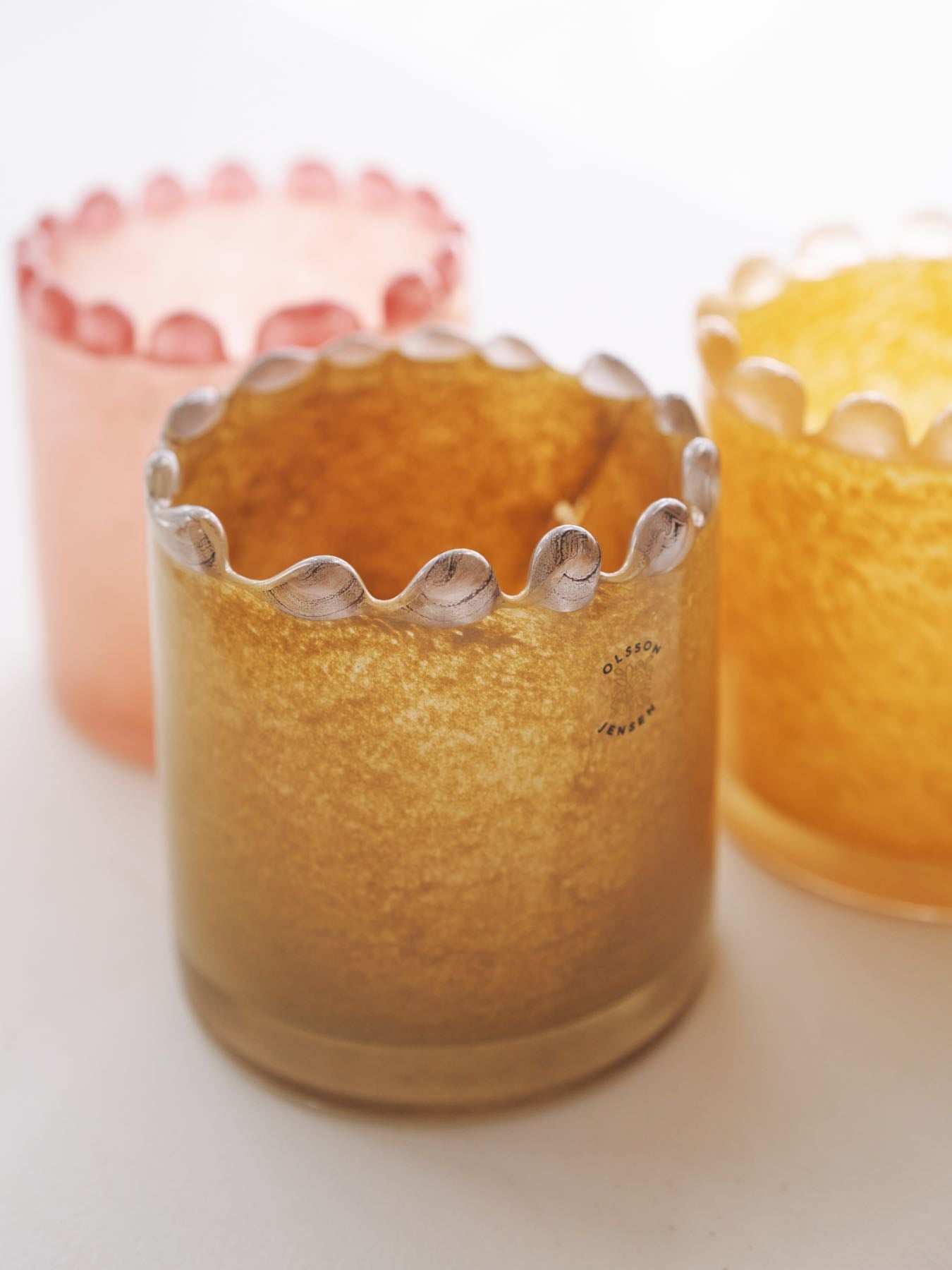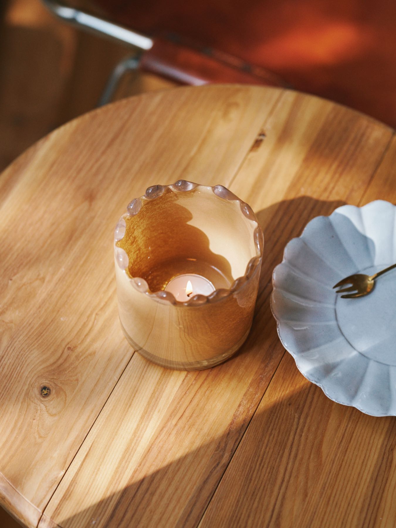 クラシックな美しさのなかに、手しごとならではの柔らかなゆらぎや、造作のユニークさが引き立つデザイン。ぽってりと厚みのあるガラスから広がる灯りが、冬のお部屋にもぴったりな温かなムードを添えてくれます。