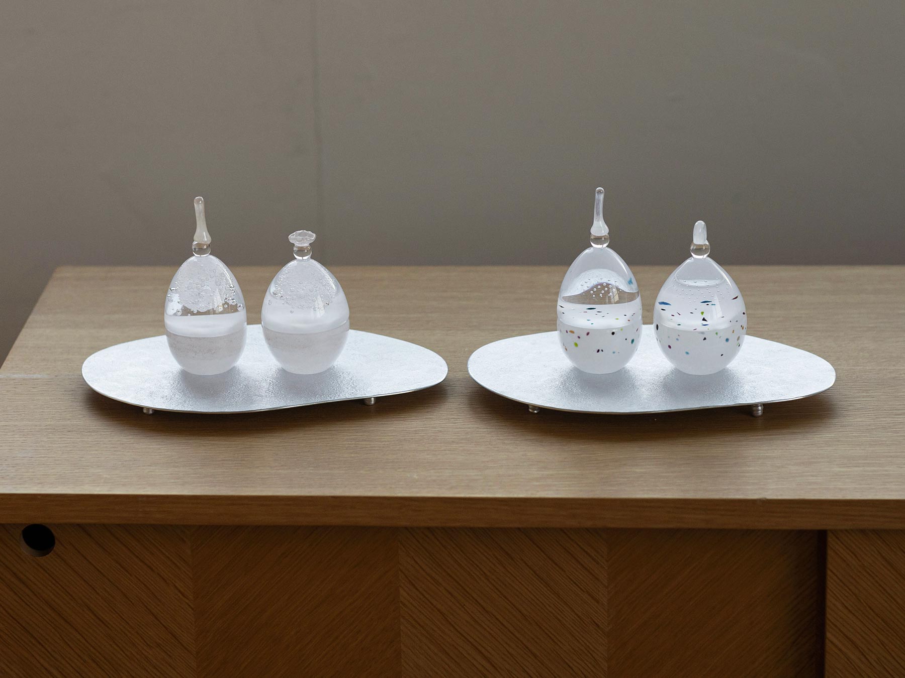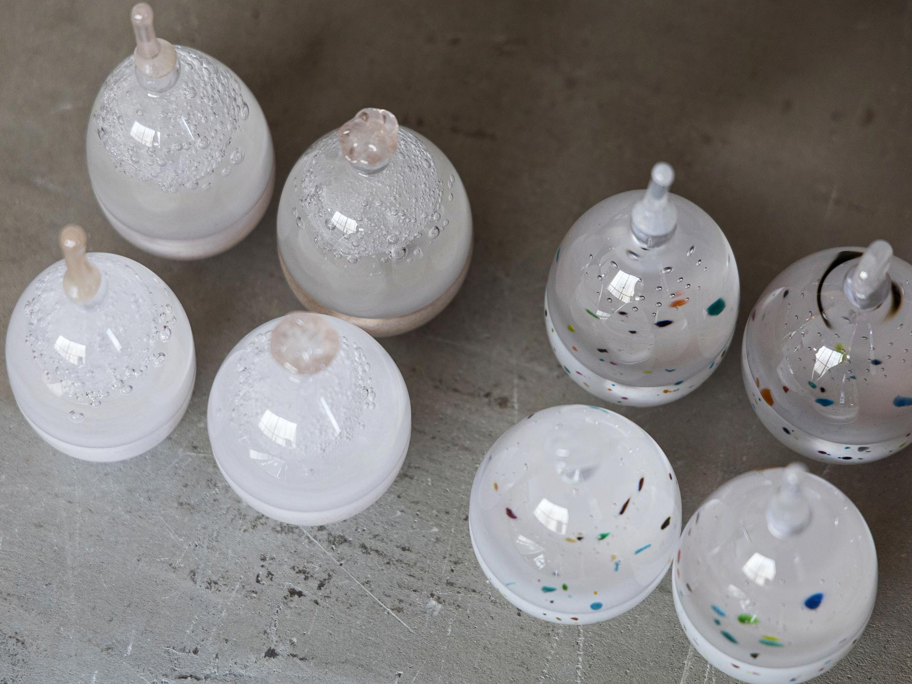 大家さんご自身が思い入れがあるという、卵形(uovo)を採用したデザイン。ガラスなのに冷たい印象はなく、ふっくらとしたフォルムや色づかいが、繊細さとやさしさを感じさせます。