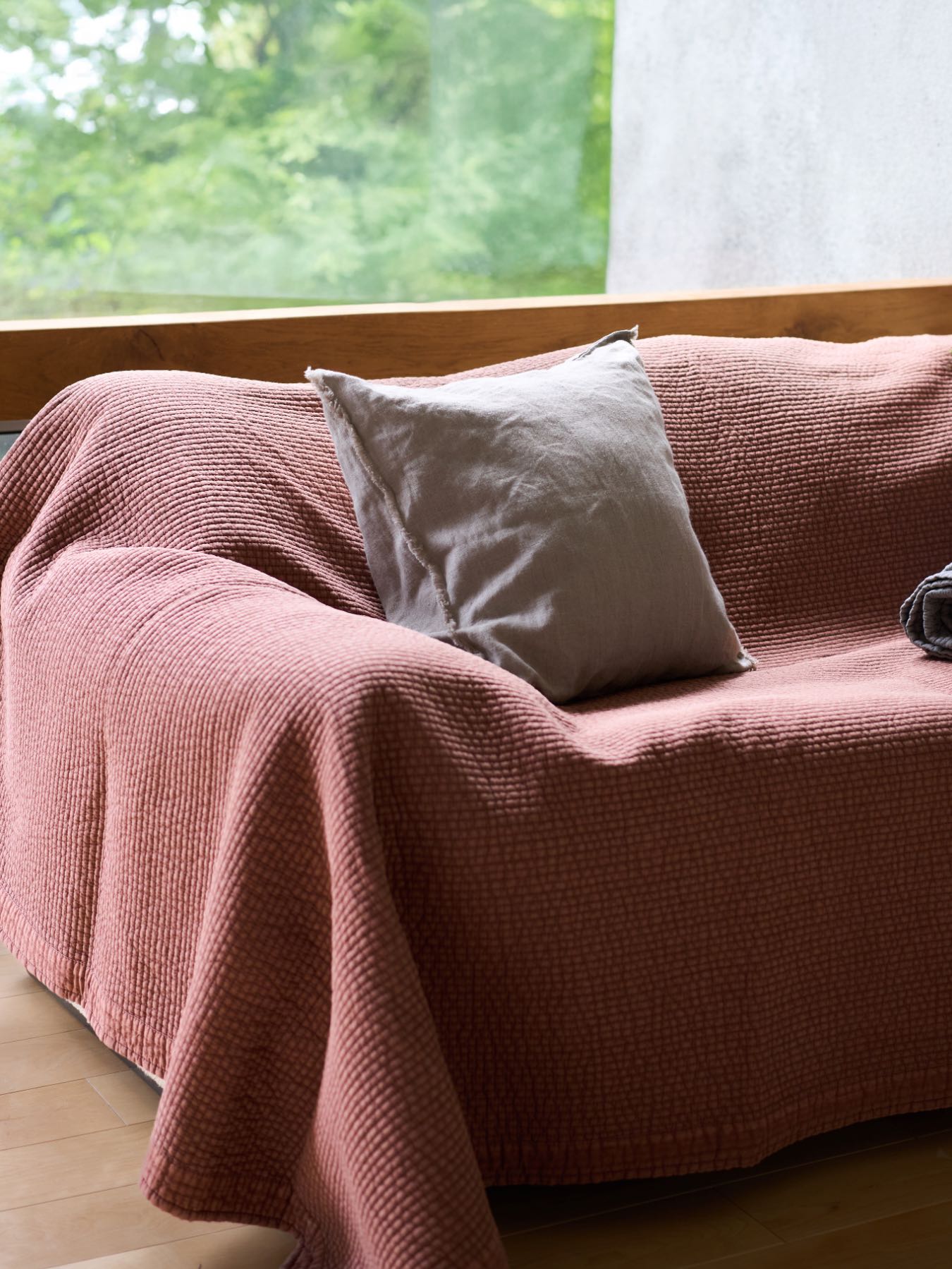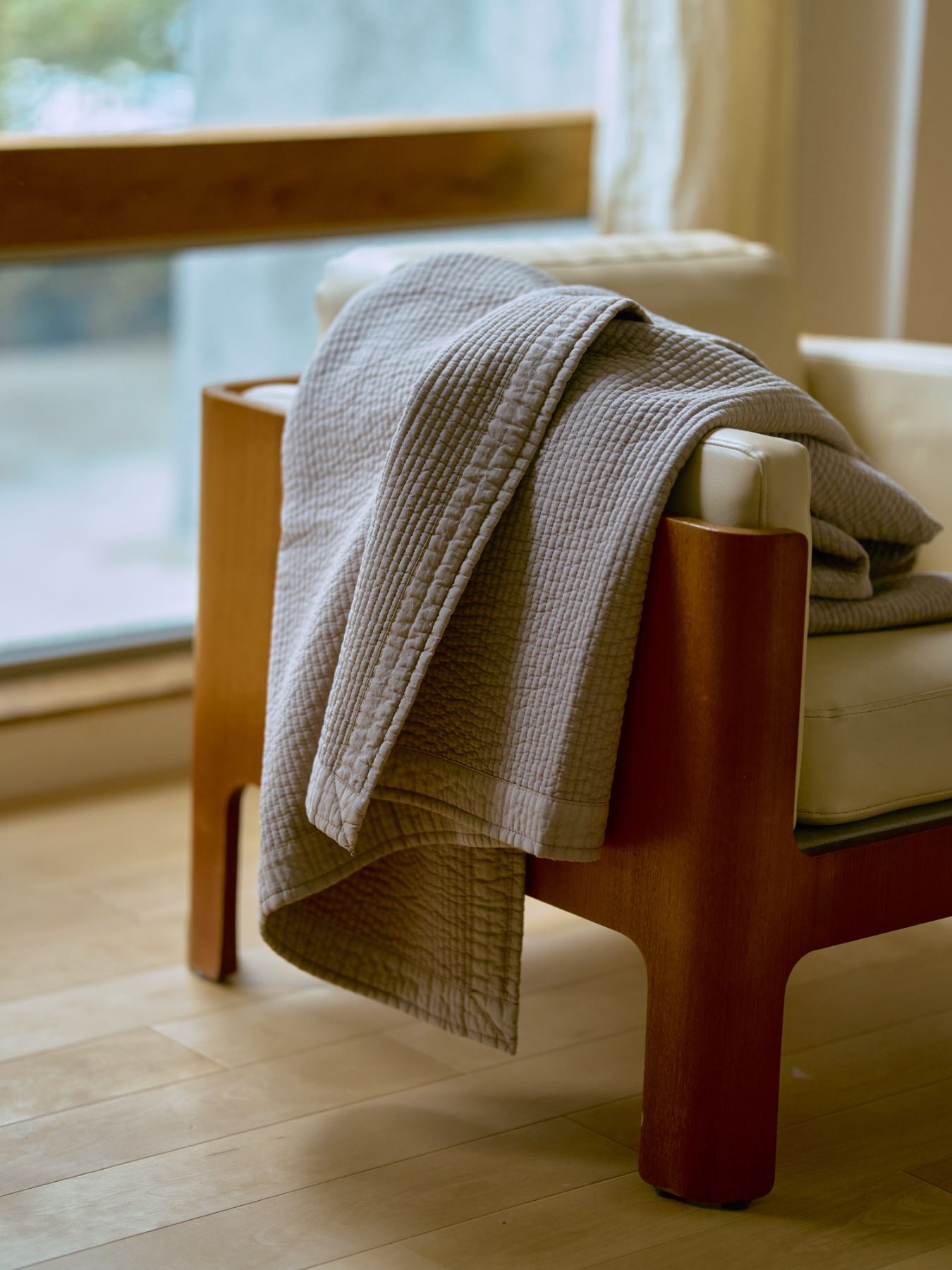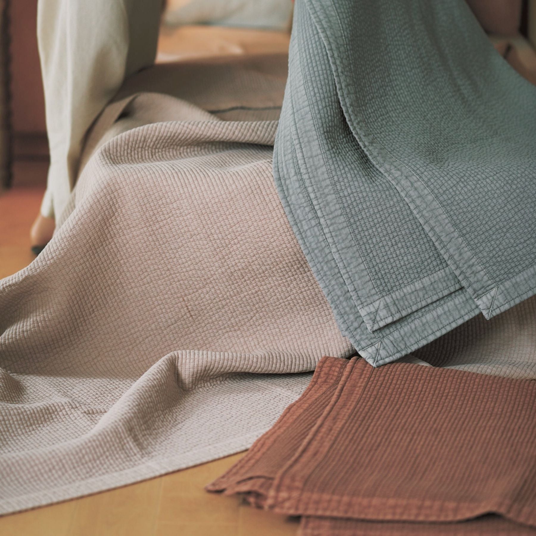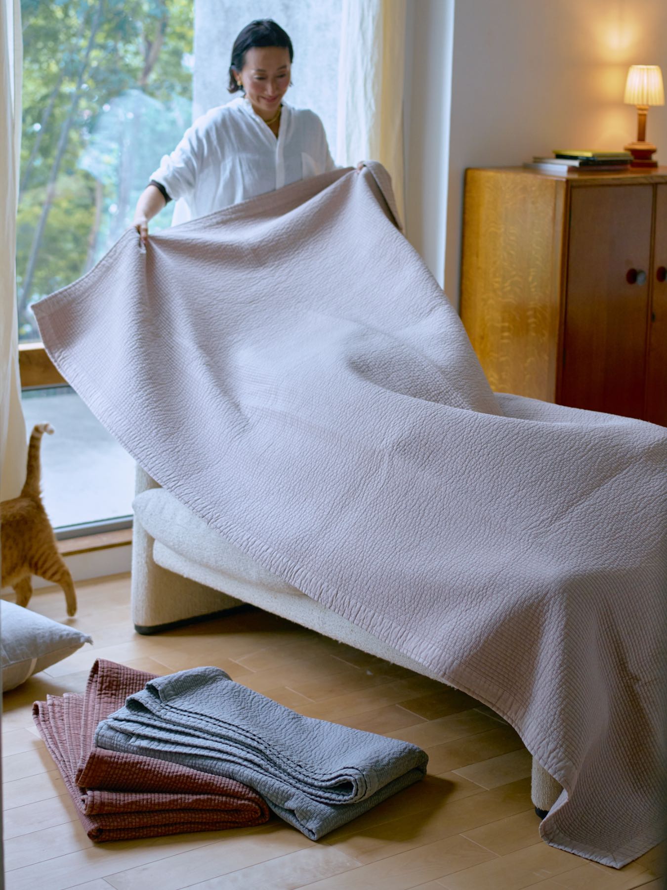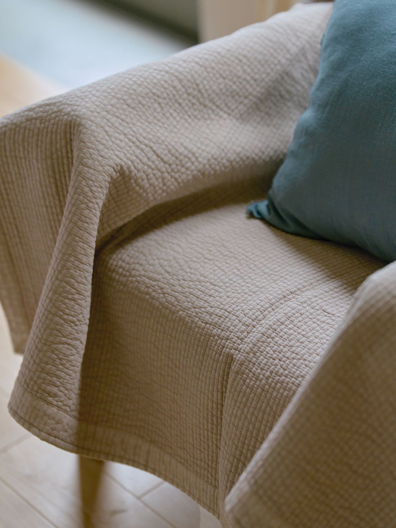 キルトにしてから後染めすることで、ふんわりとした風合いと、オルネらしい奥行きのある色に。使い始めからこなれた雰囲気を演出してくれます。リビングや寝室など、シーンを問わず馴染む、大人の暮らしにちょうど良いイブルです。