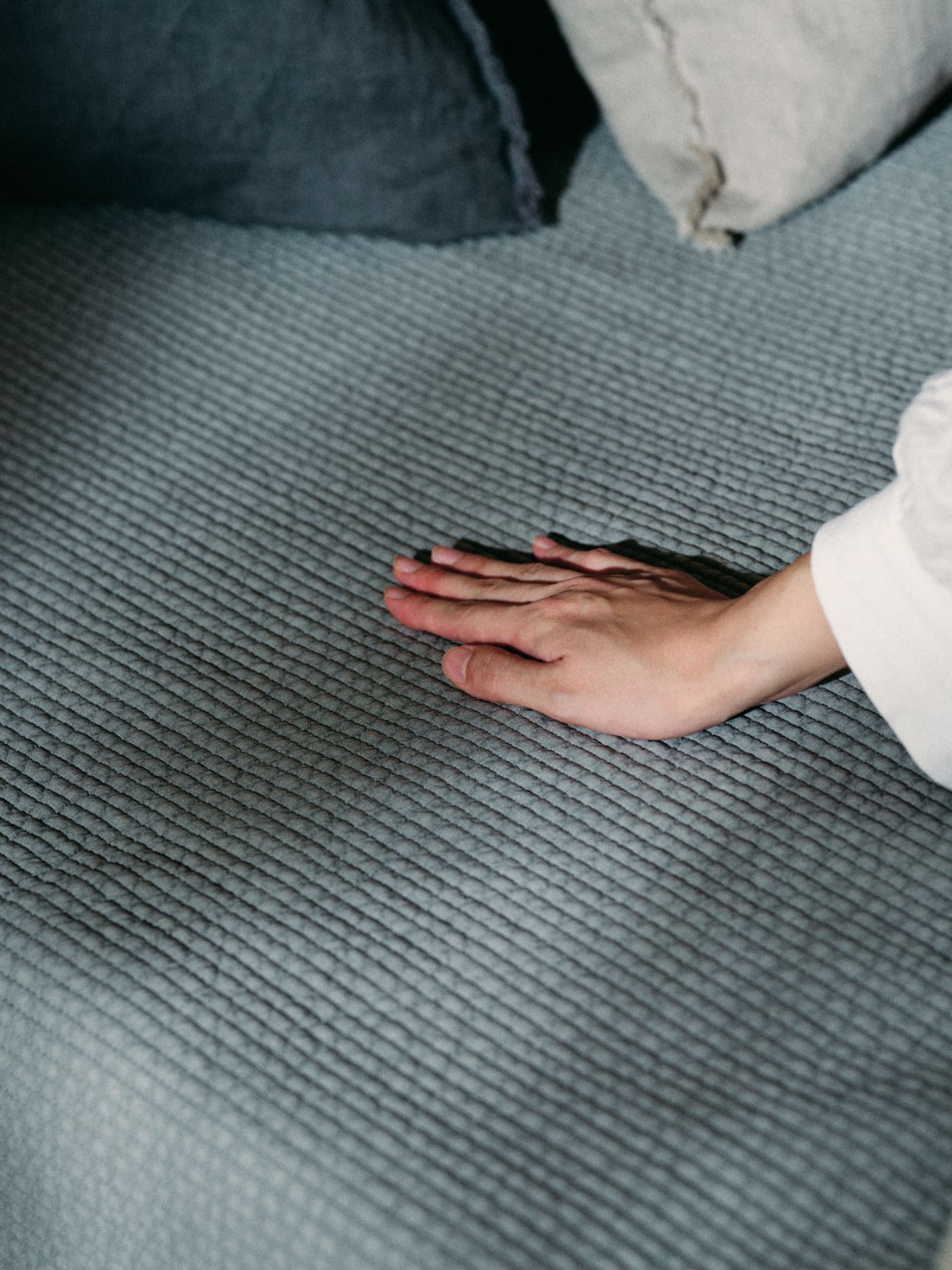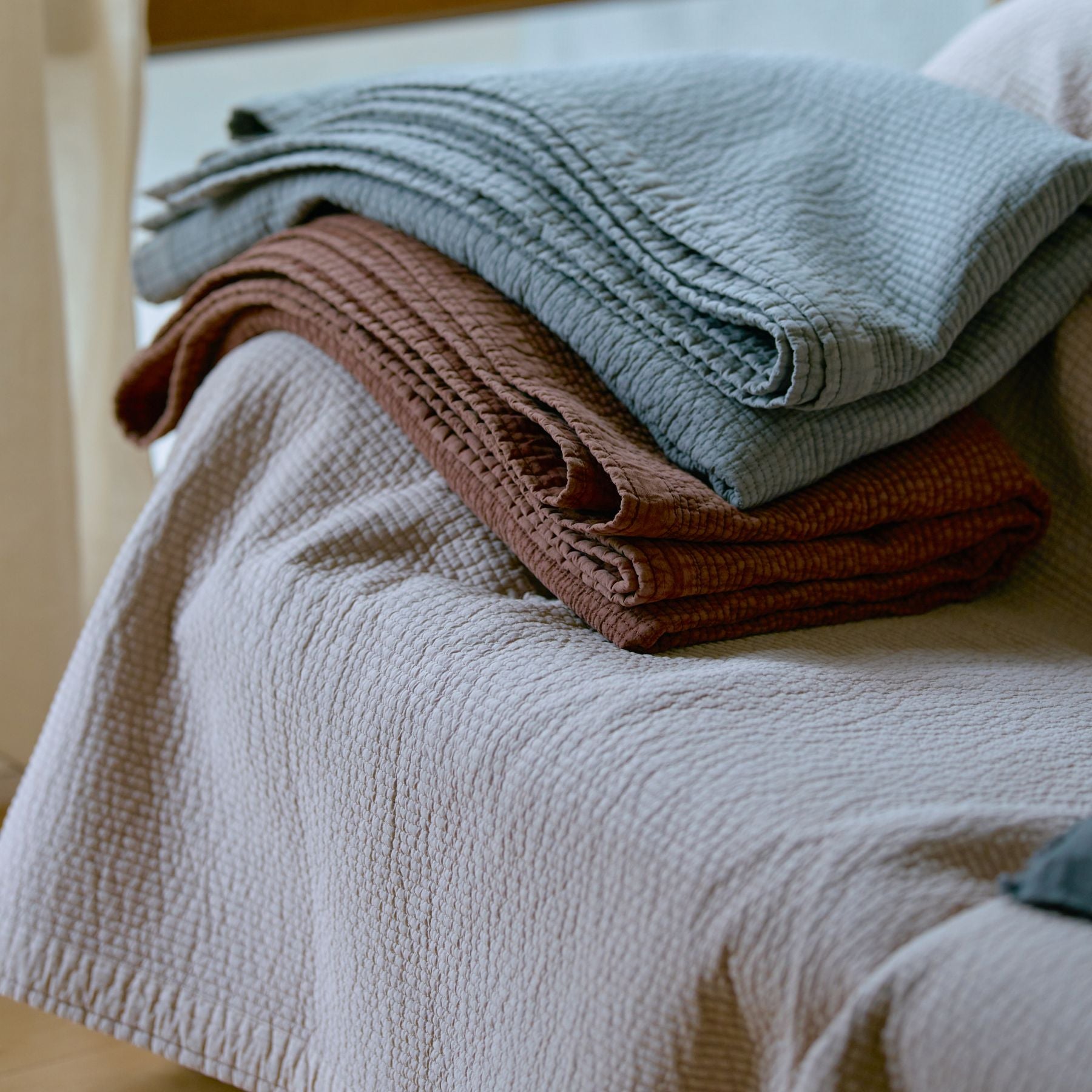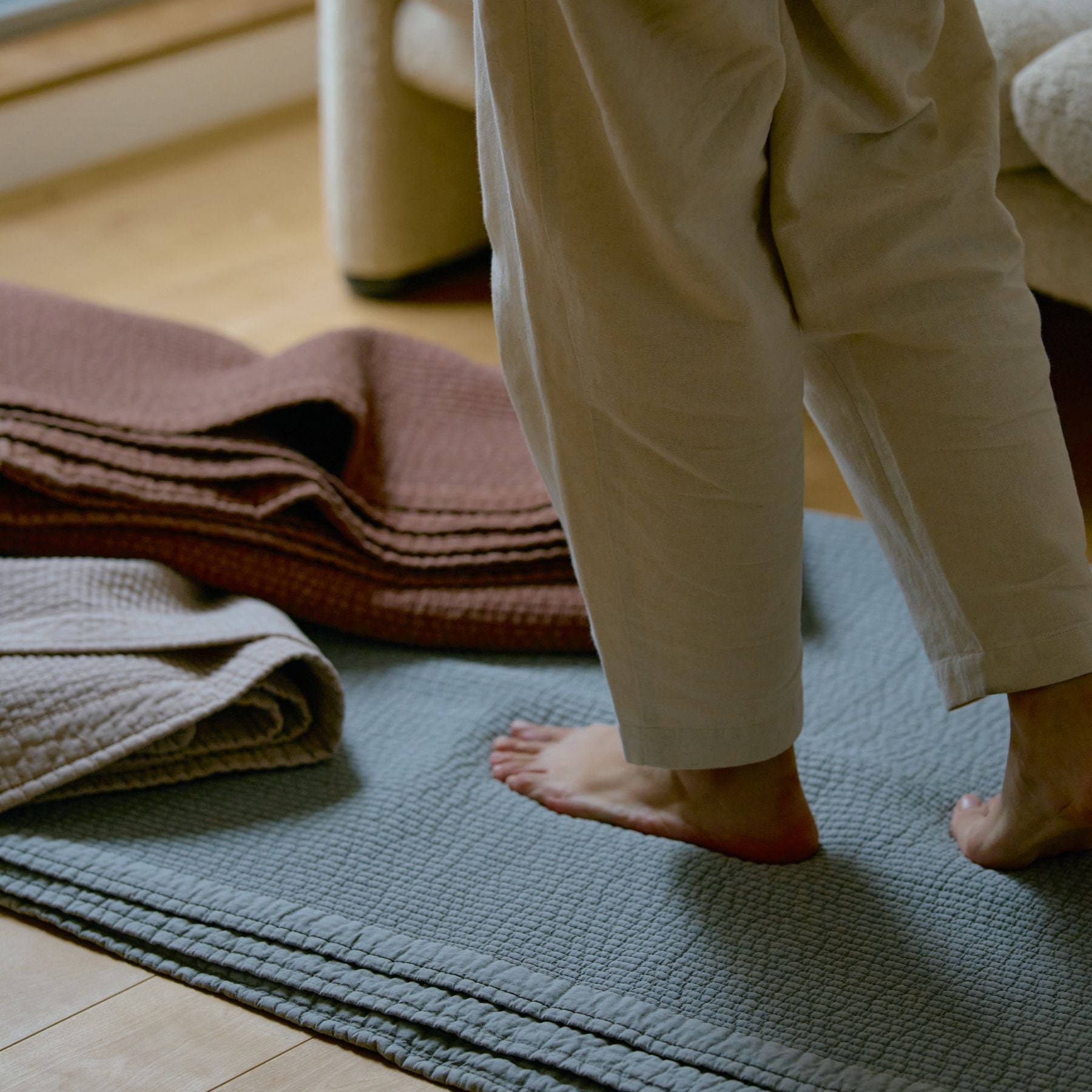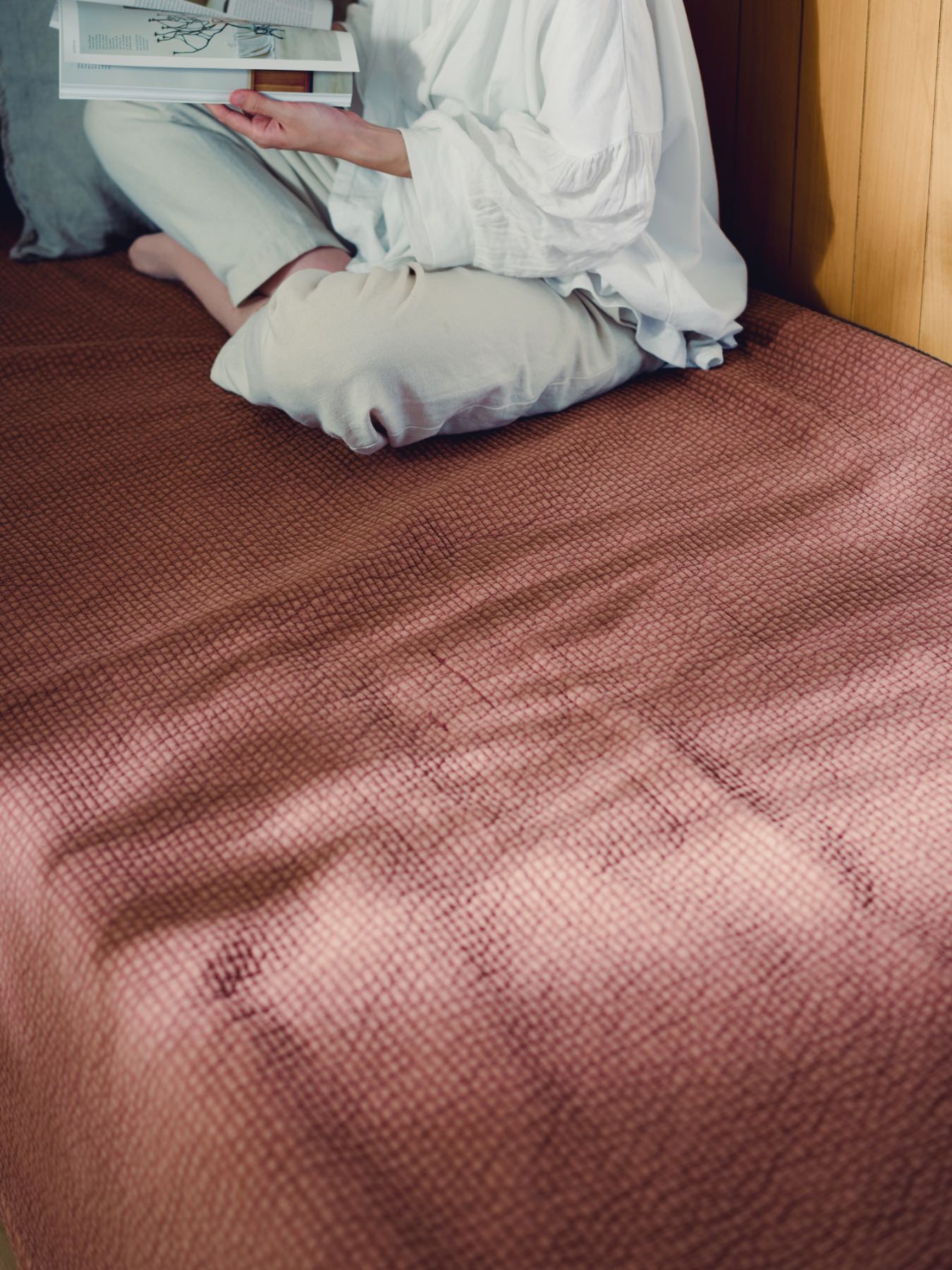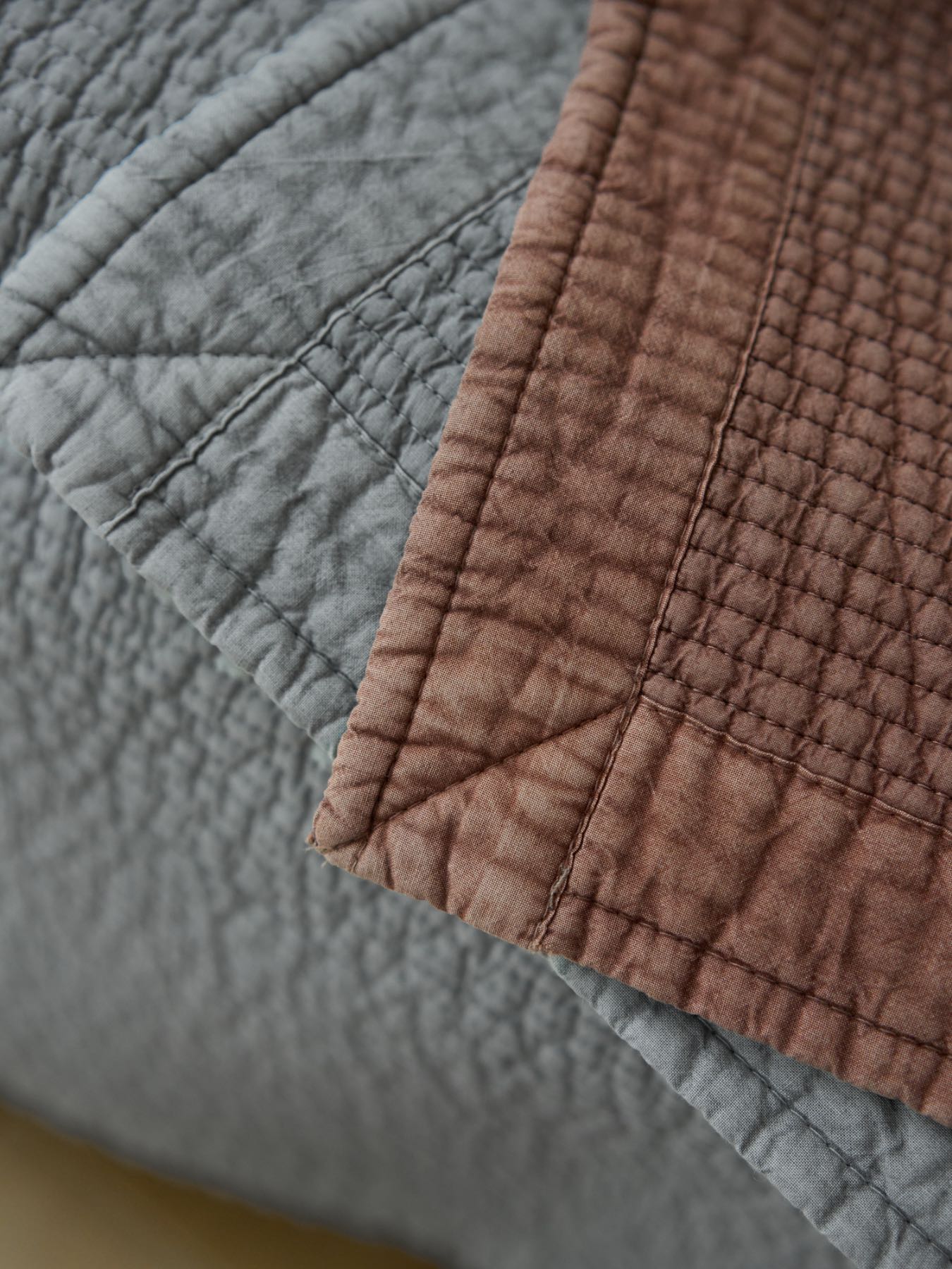 キルトにしてから後染めすることで、ふんわりとした風合いと、オルネらしい奥行きのある色に。使い始めからこなれた雰囲気を演出してくれます。リビングや寝室など、シーンを問わず馴染む、大人の暮らしにちょうど良いイブルです。