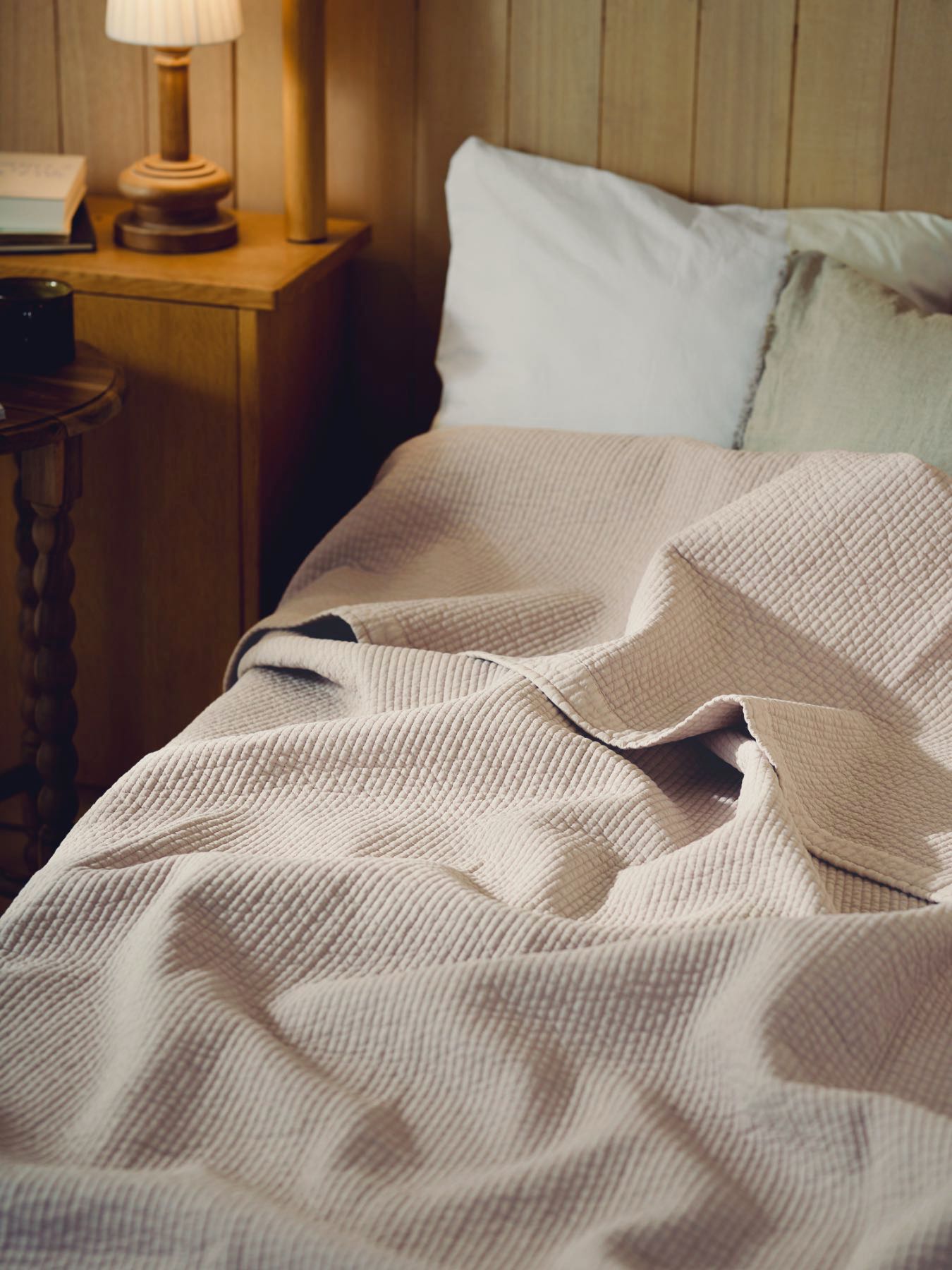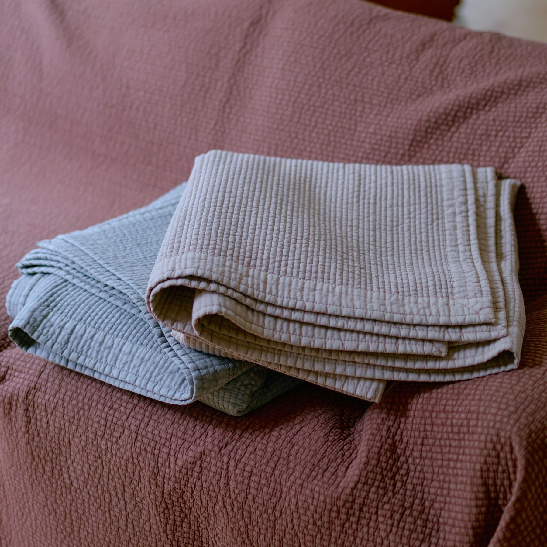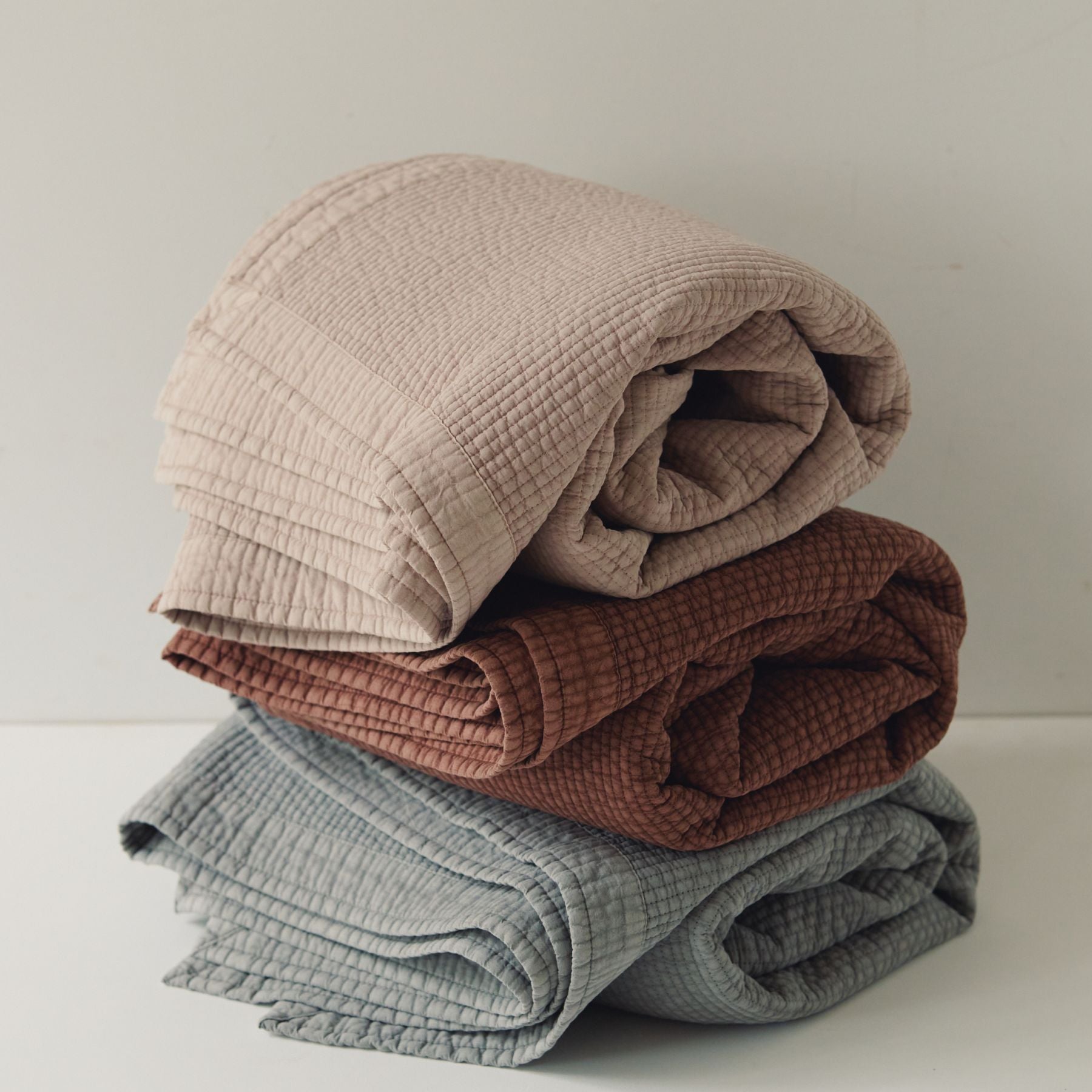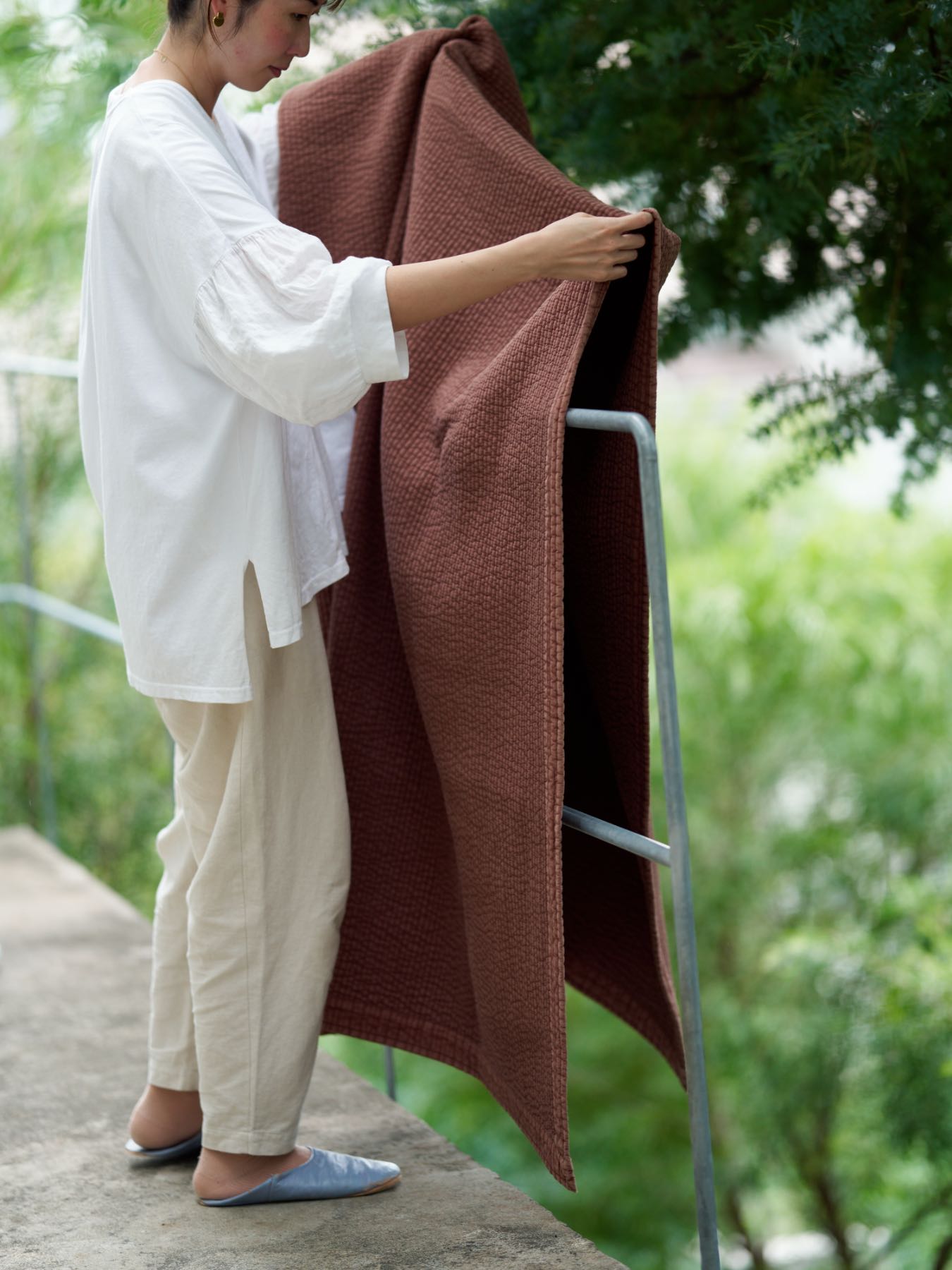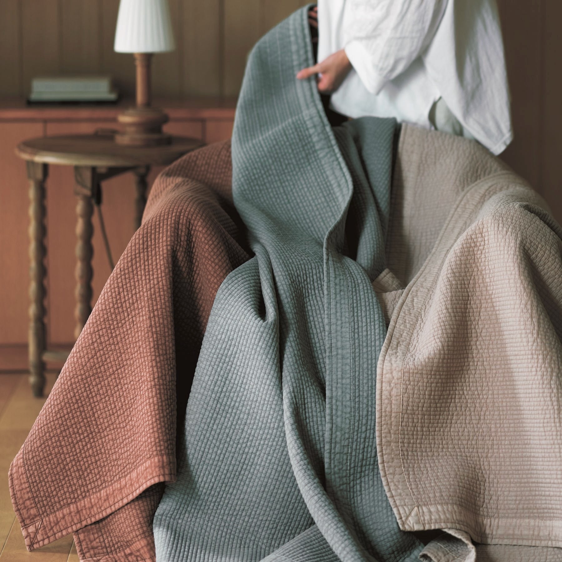 キルトにしてから後染めすることで、ふんわりとした風合いと、オルネらしい奥行きのある色に。使い始めからこなれた雰囲気を演出してくれます。リビングや寝室など、シーンを問わず馴染む、大人の暮らしにちょうど良いイブルです。