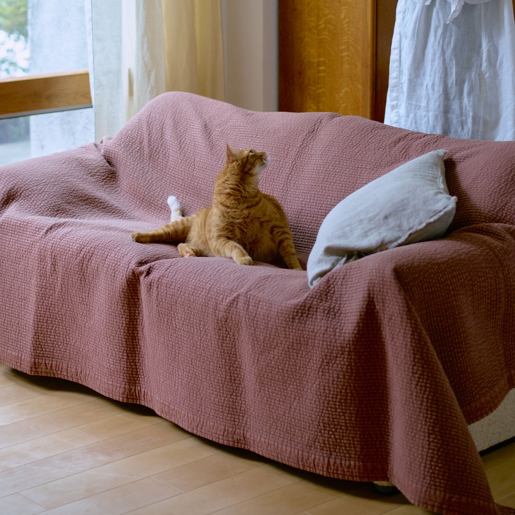 細かなストライプステッチで、すっきりとした見た目。サイズにもこだわって、ソファやシングルベッドを楽にカバーできる大きさに仕上げました。