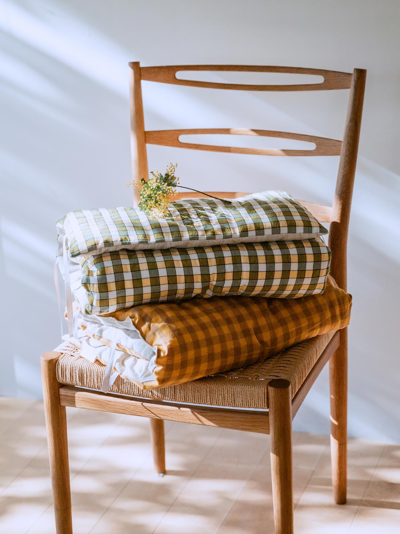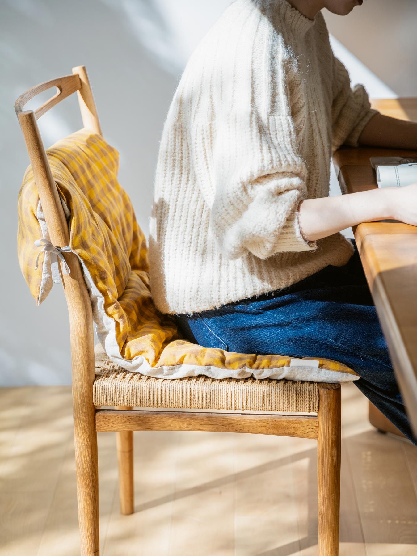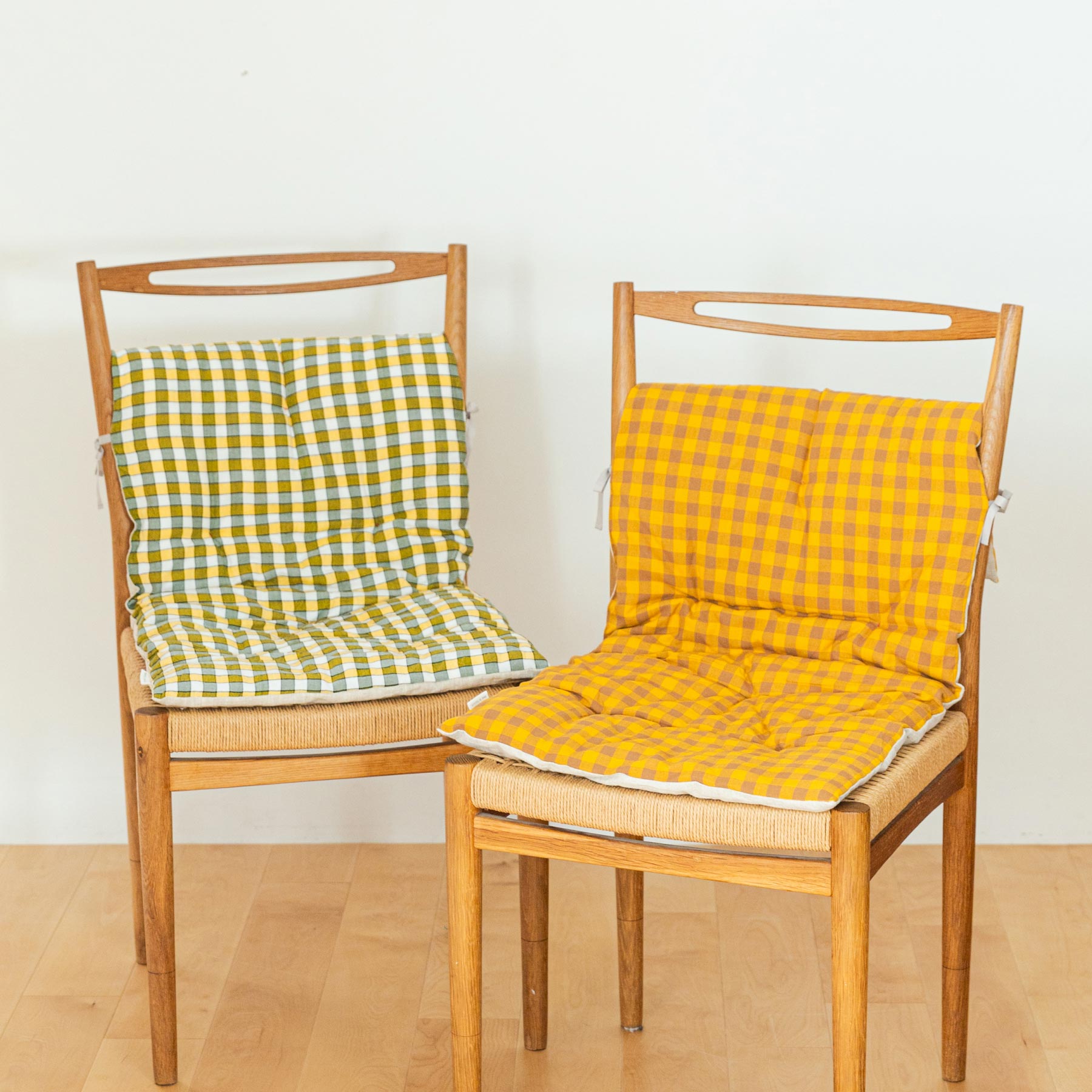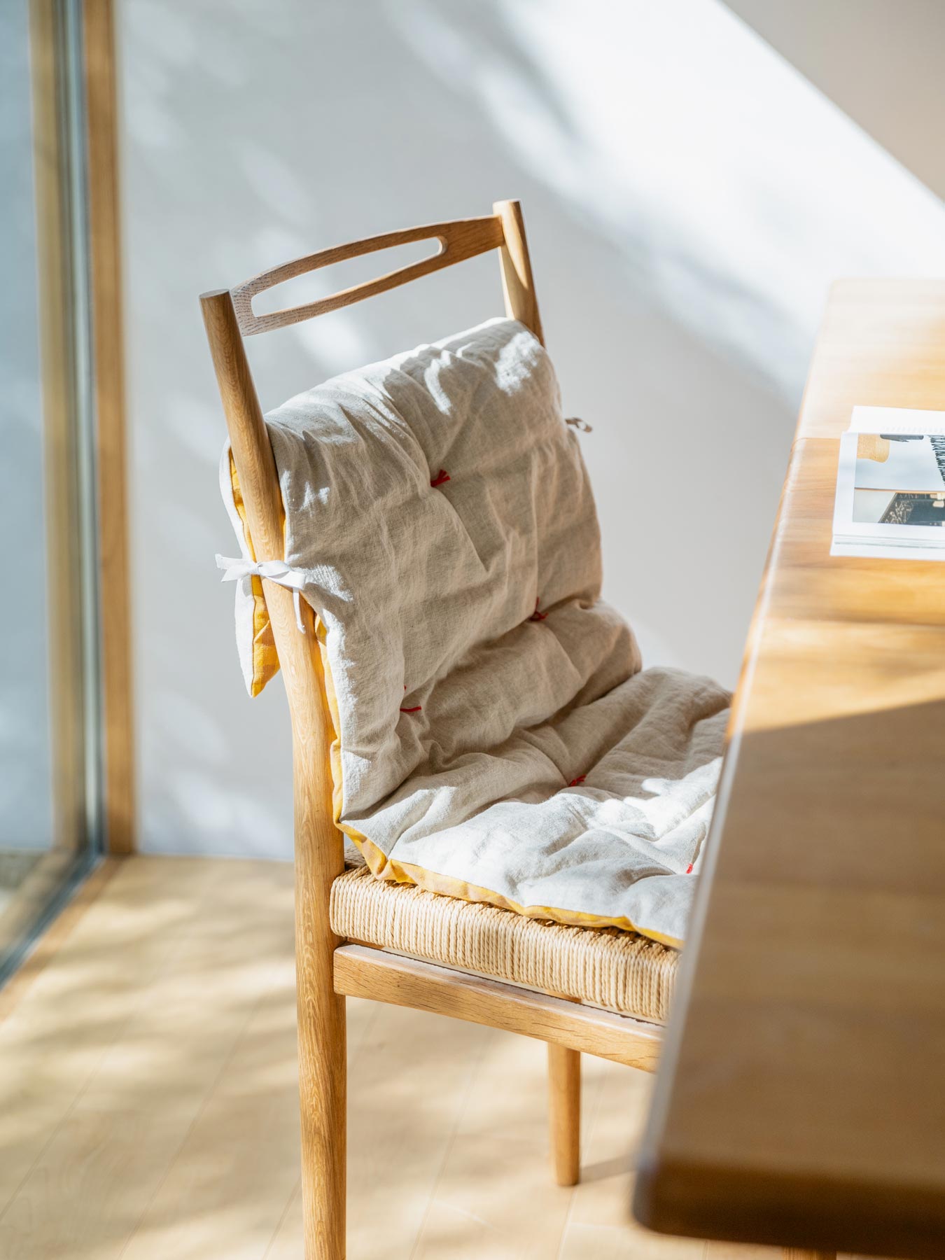 マルチに使えるシートクッションは当店で人気のアイテムですが、今回は小ぶりなサイズに仕立てたのでチェア用にぴったり。座面から背もたれまで覆えるので、いつもの椅子がもっと快適になります。