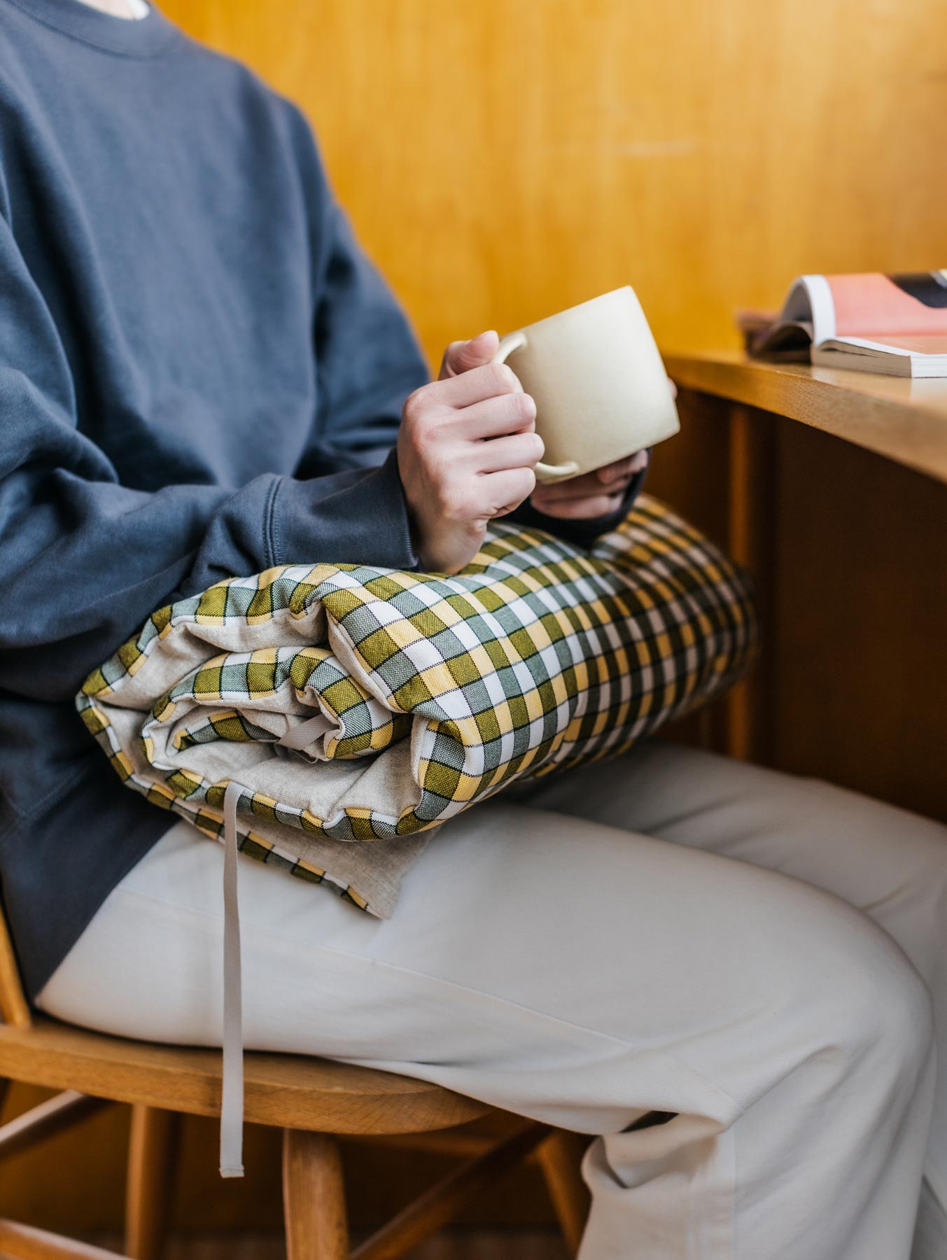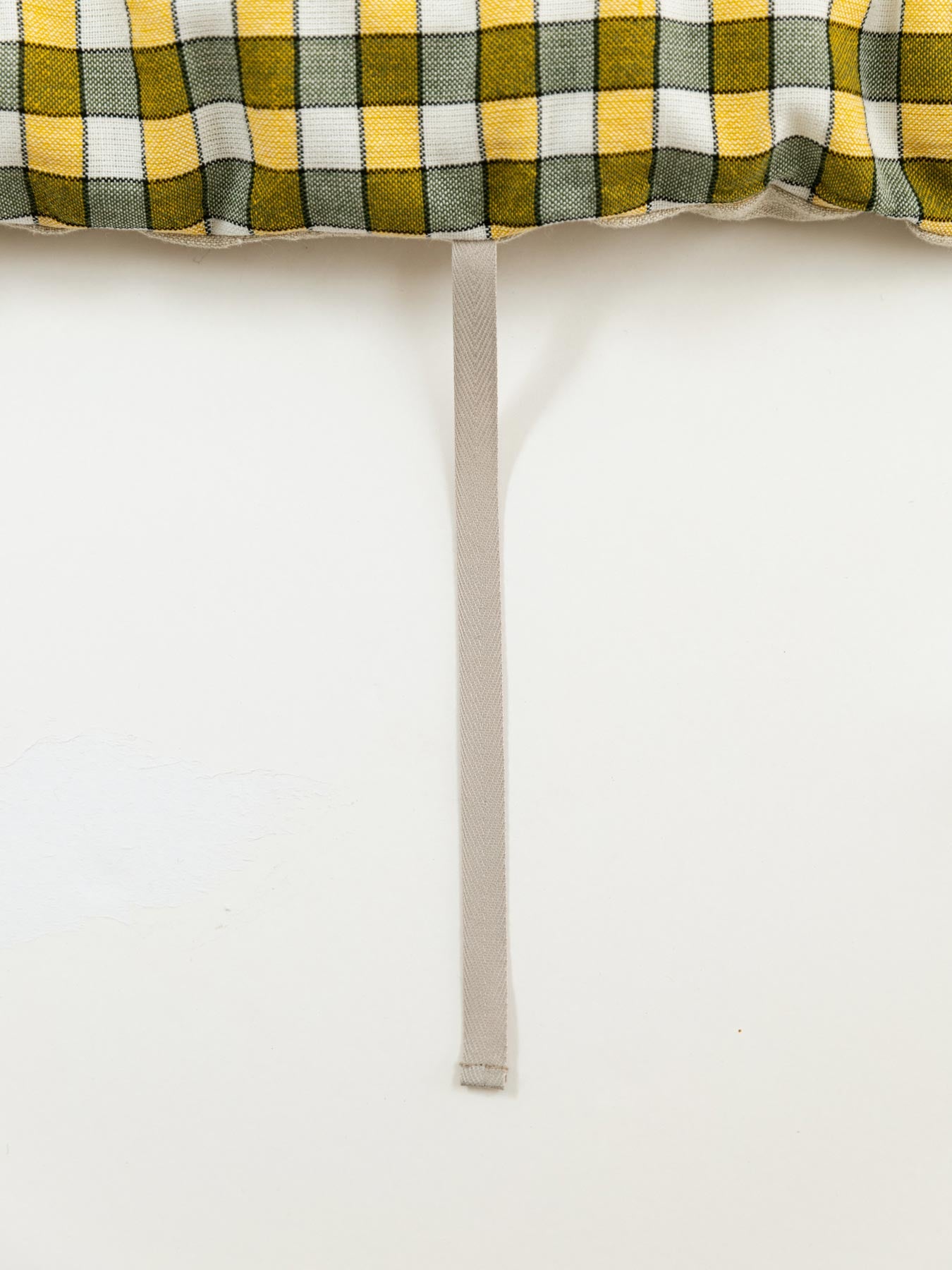 | 素材 | 表地(チェック):コットン100% 裏地(無地):リネン80%、コットン20% 中綿:コットン80%、ポリエステル20% |