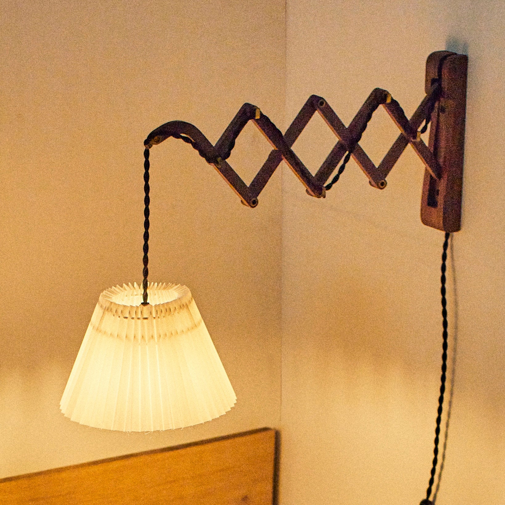 ウォールナットを使用したシザー状のアームは、しっとりと落ち着いた雰囲気。プリーツシェードは半年程かけて工場と何度もやりとりを重ね、フォルムにこだわりました。