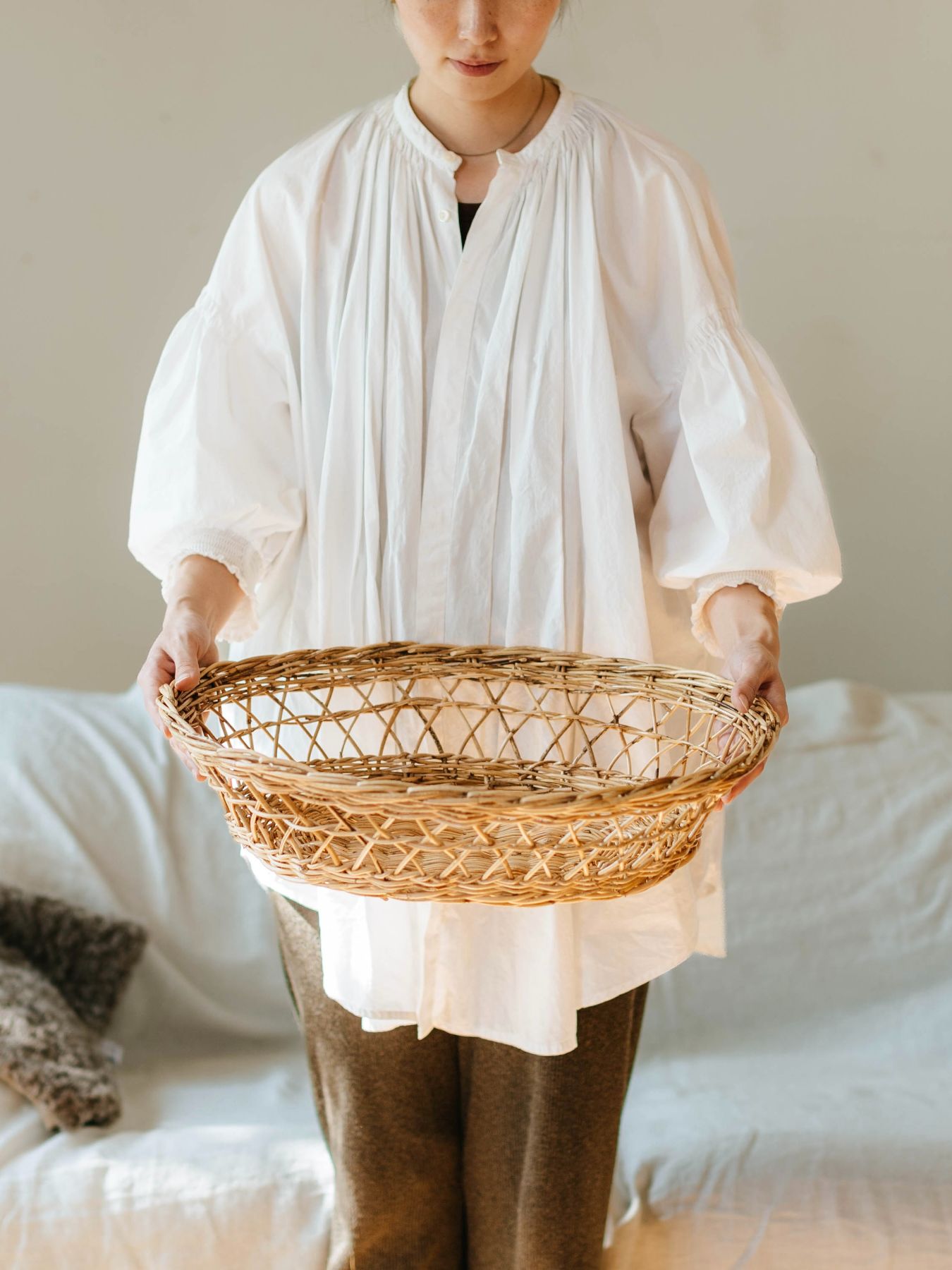 猫を観察していると「すっぽり包まれるように入るのも好きだけど、ちょっとした凹みも好き」「深すぎるベッドはハードルになるのか、なかなか気軽に入らないことが多い」ということに気づきました。 そこで、できるだけ浅く、かつインテリアに溶け込むように、フランスのヴィンテージのカゴをモチーフにしてデザインしてみました。