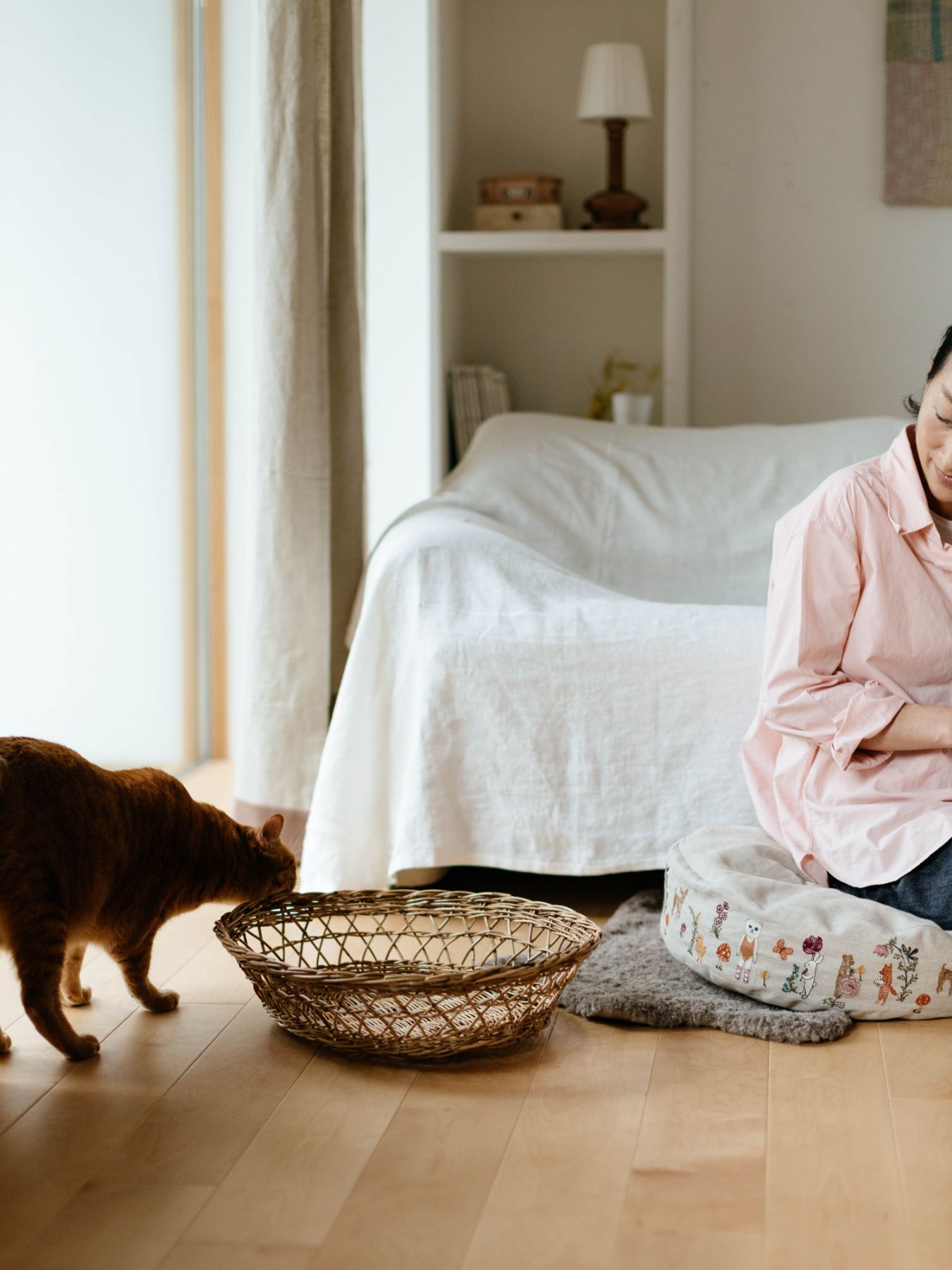 インテリアに溶け込む、そんなキャットバスケット。何も入れなくとも、絵になる佇まいです。
