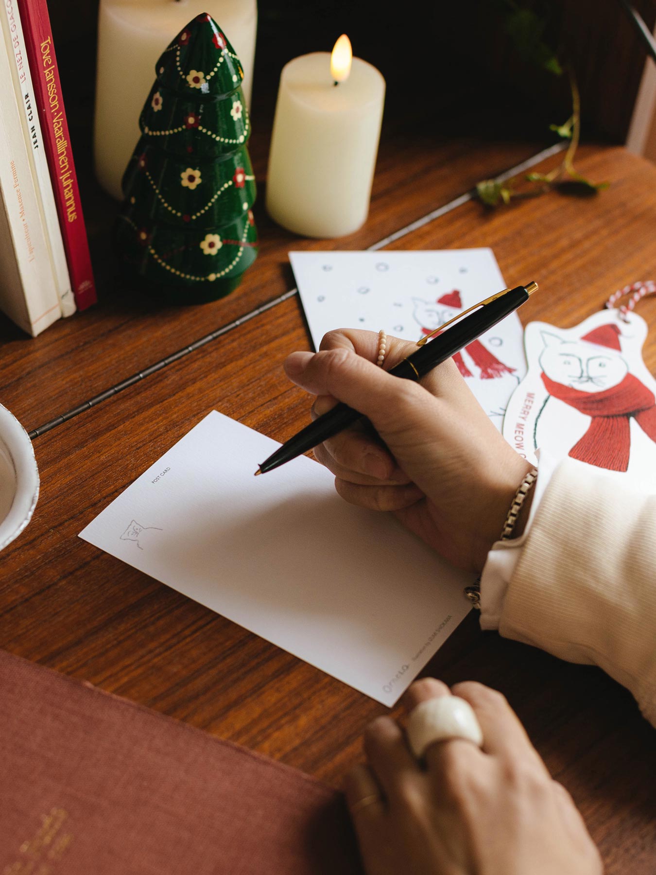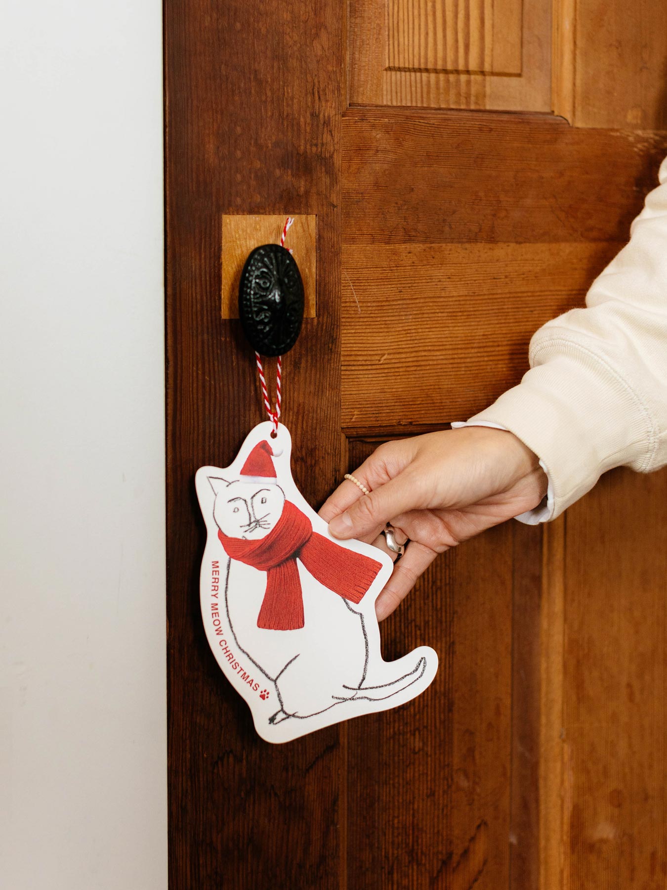 もう一つのダイカットカードは、オルネコの形にくり抜かれた変形カード。こちらのオルネコは、サンタ帽をかぶっています。紐がついているのでオーナメントのように飾ることもできますよ。