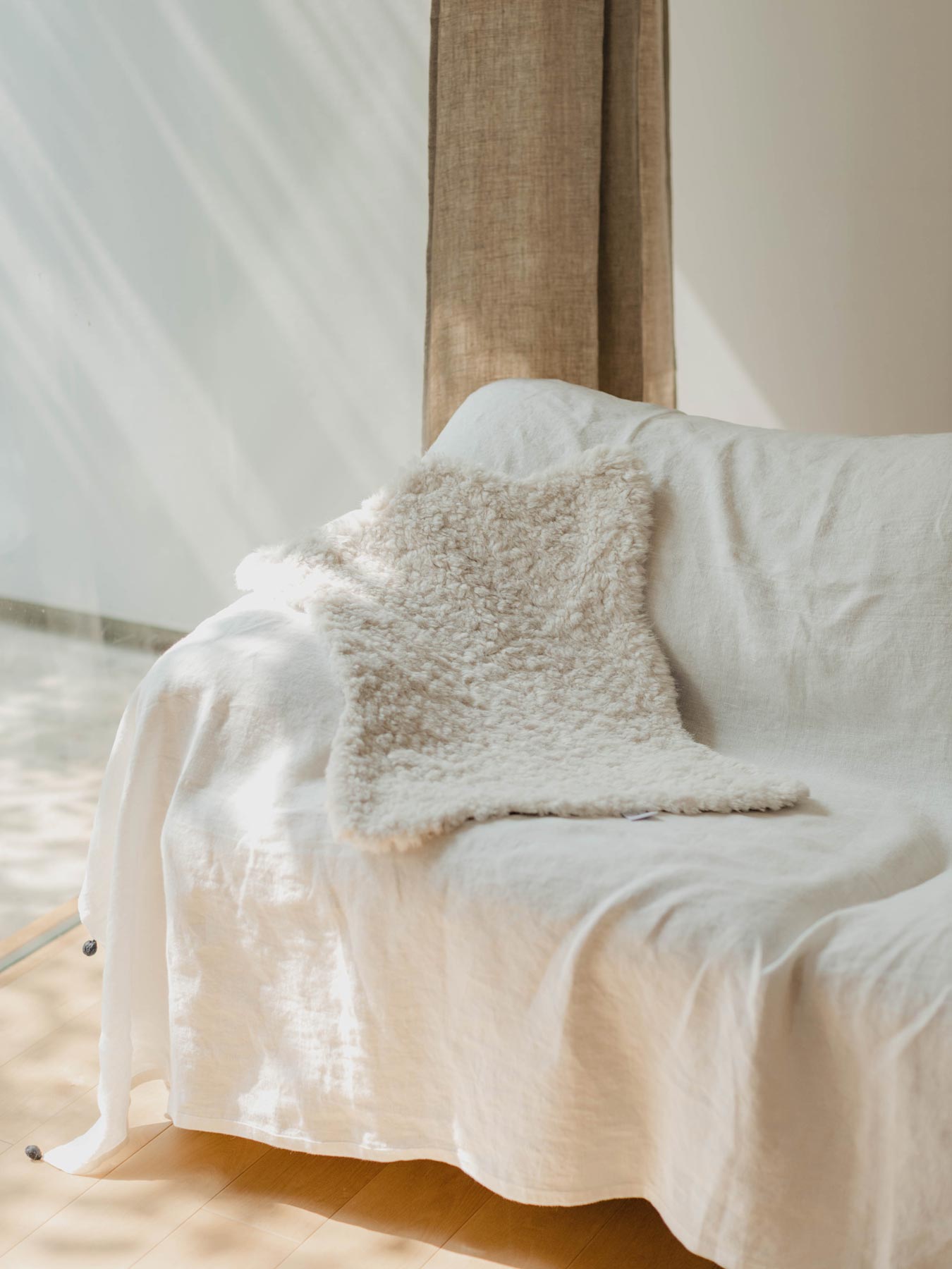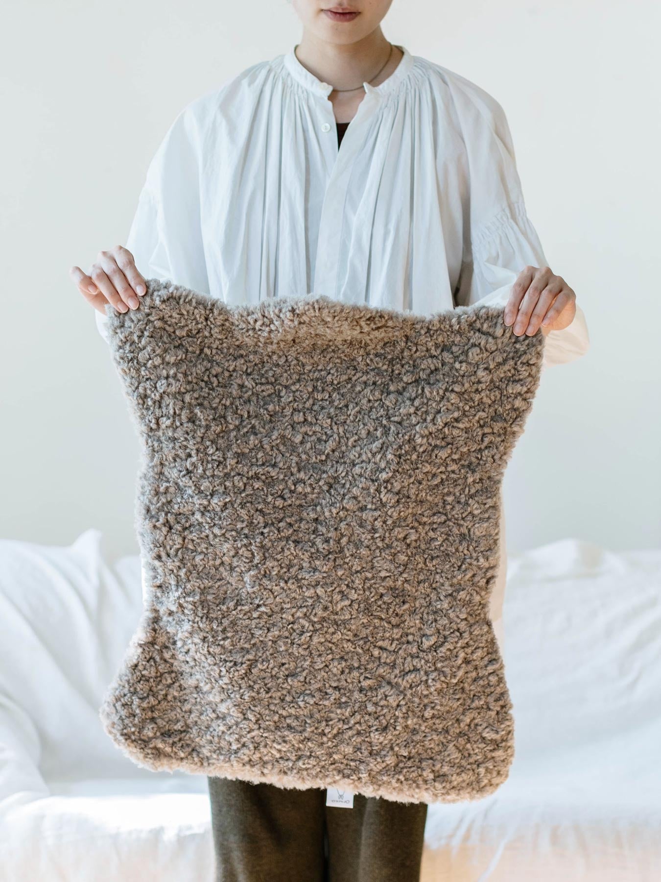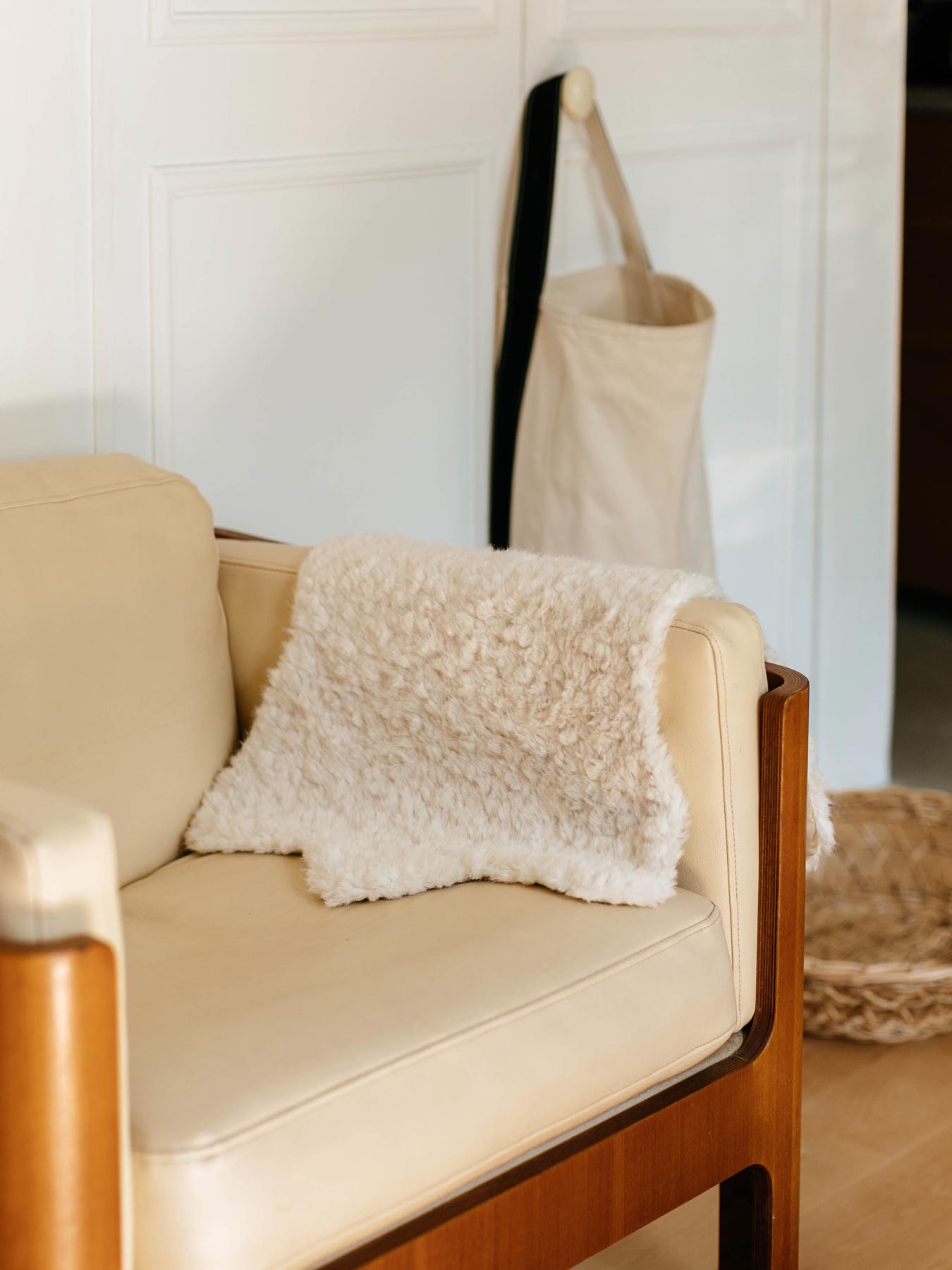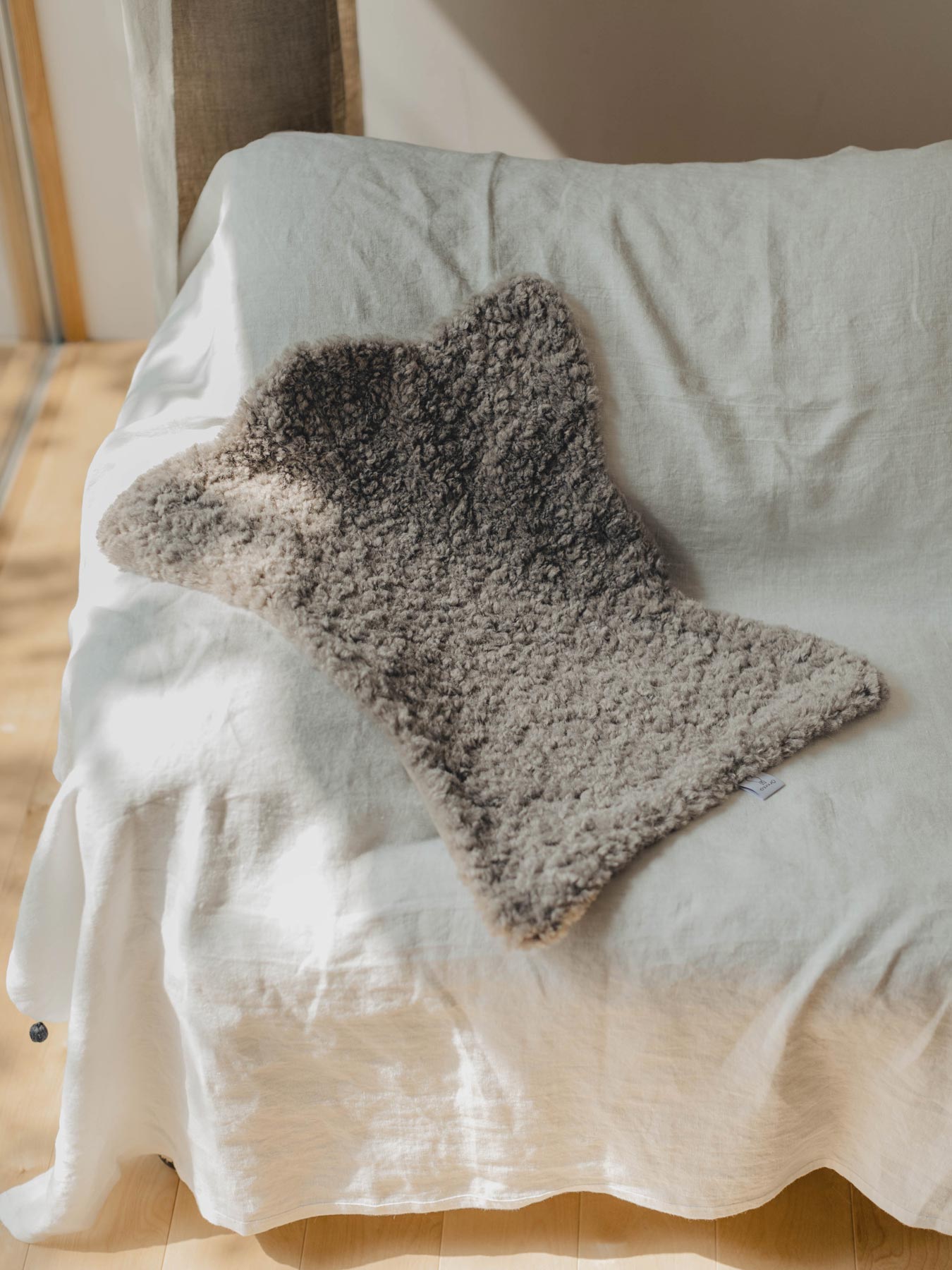 もこもこしたフェイクファーのボア生地は、手触りも見た目もあったかで、きっとネコの特等席になるはず。自然なカーブのある形は、フロアに敷いたときにもおしゃれに見えます。