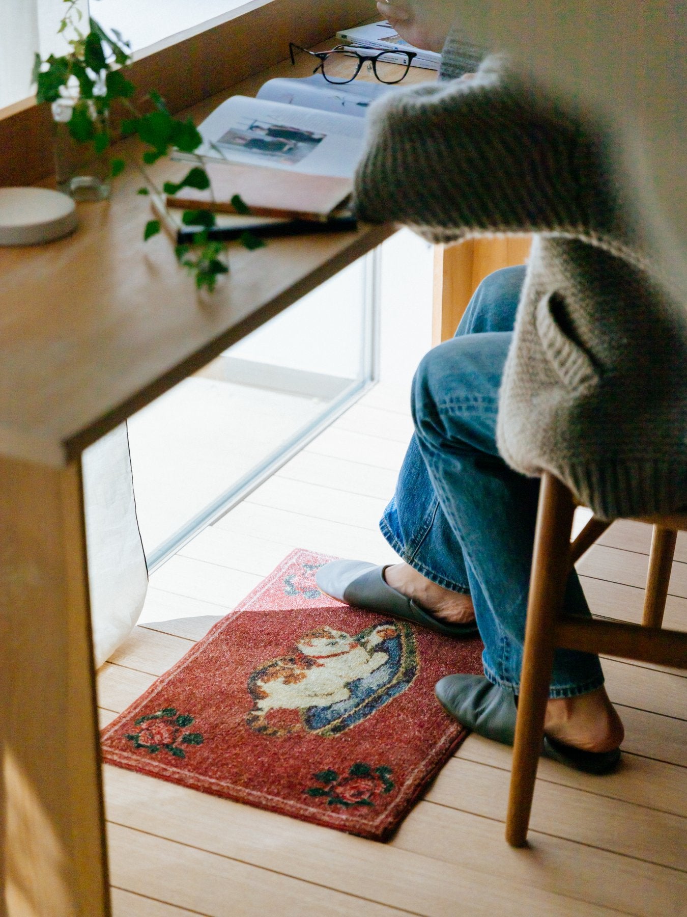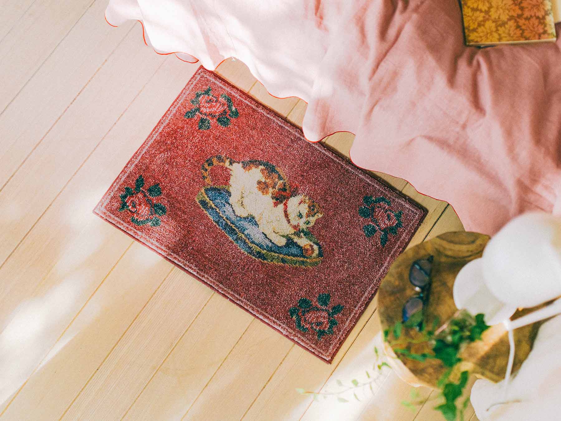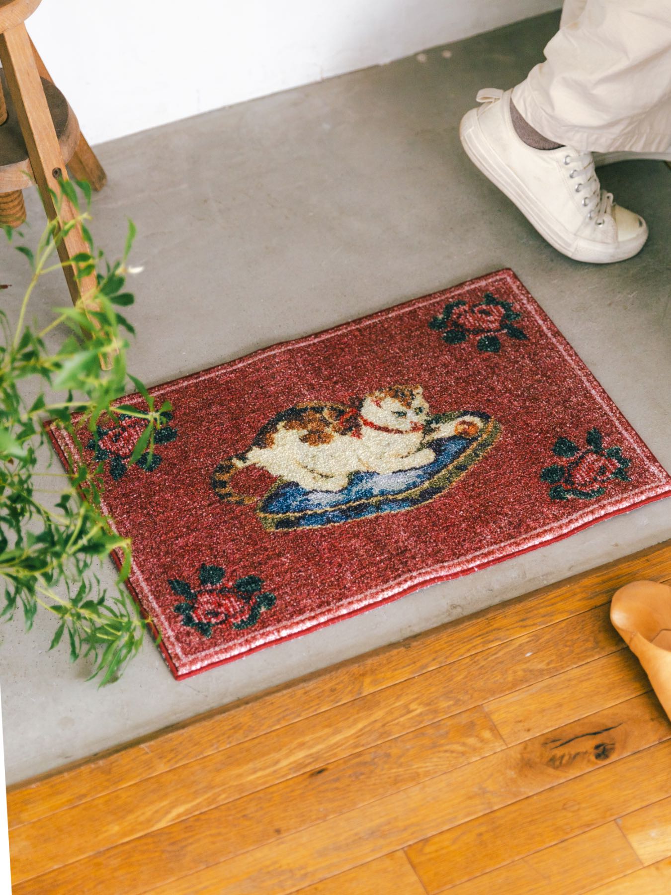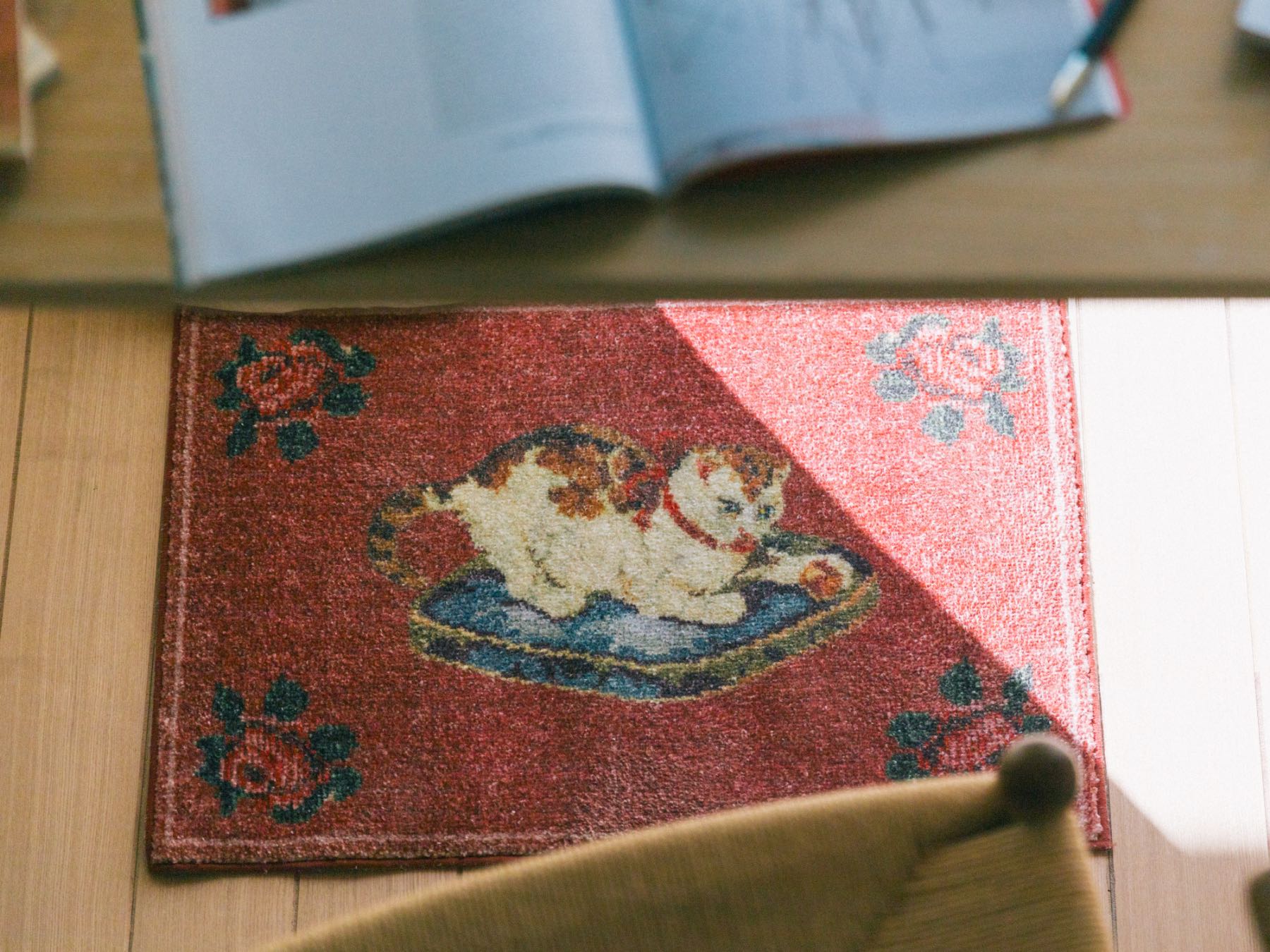 オーナーが所有する古い布コレクションの中で出会った、優雅なネコ。このロマンチックでレトロなムードを着想源に、ミニサイズのラグマットを作りました。