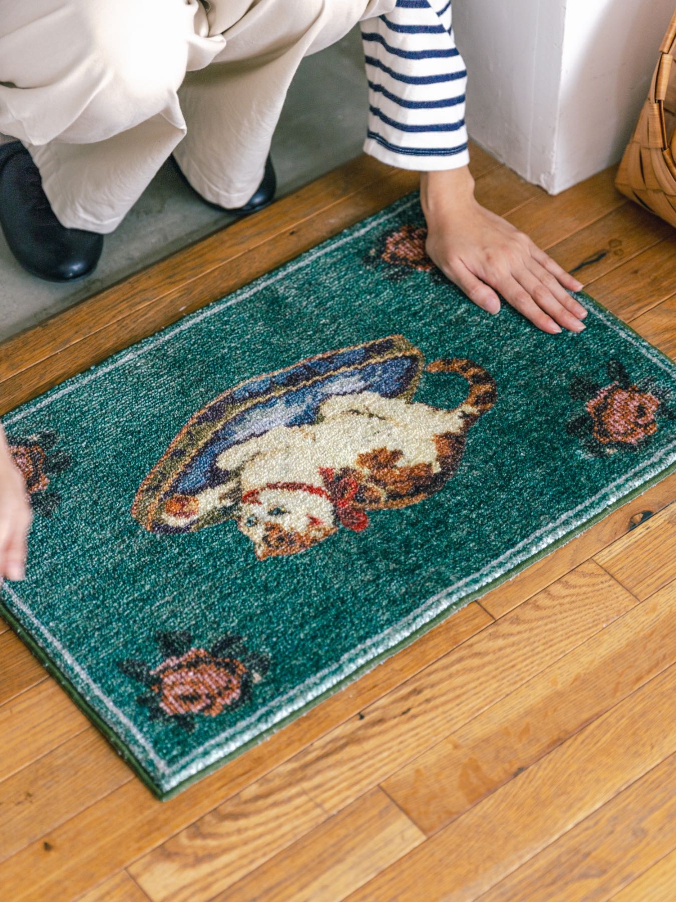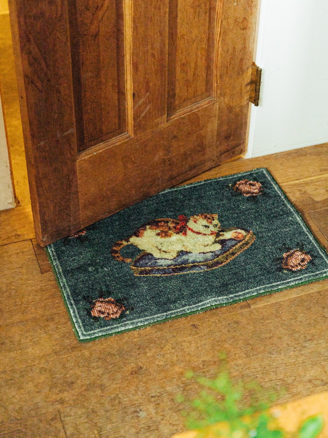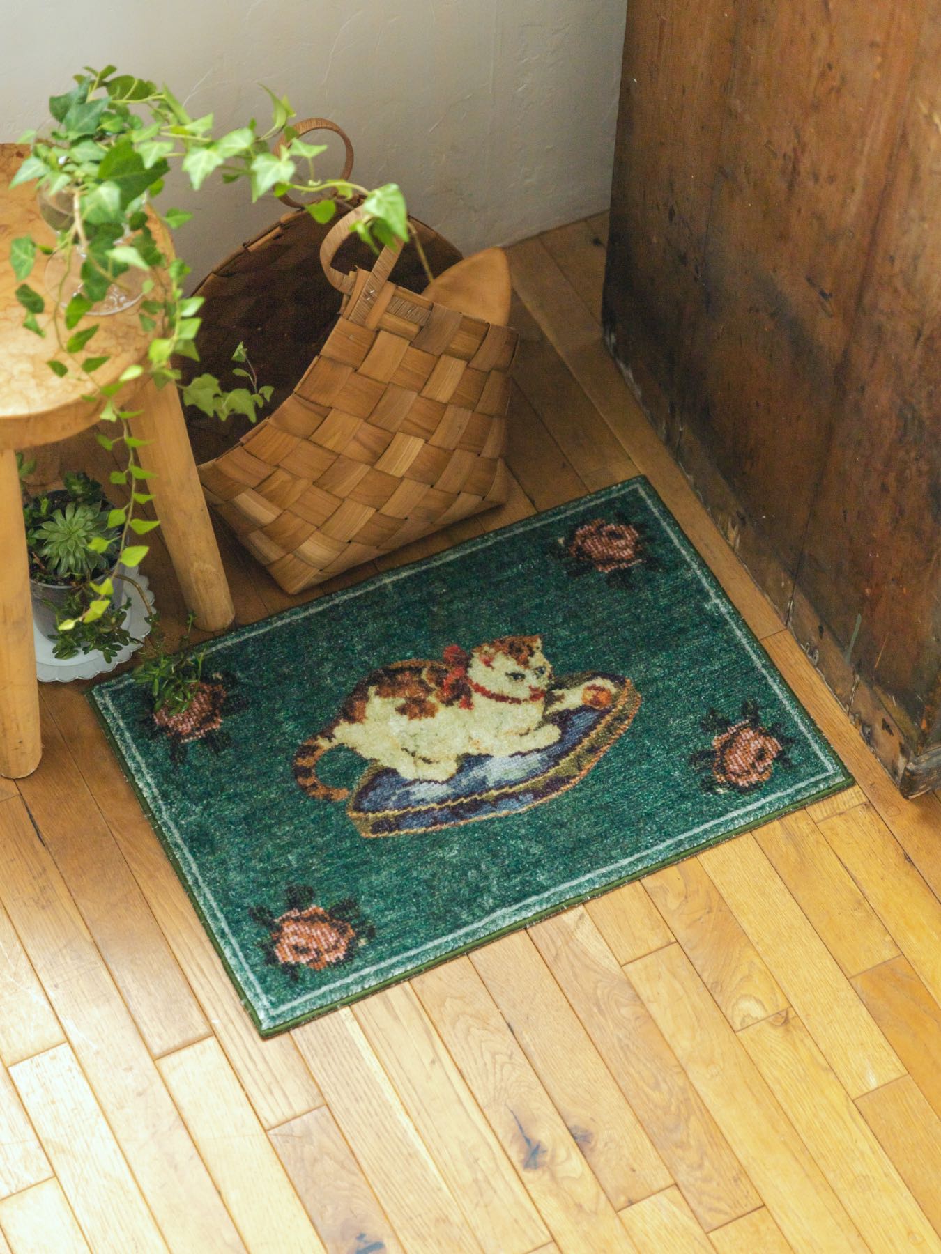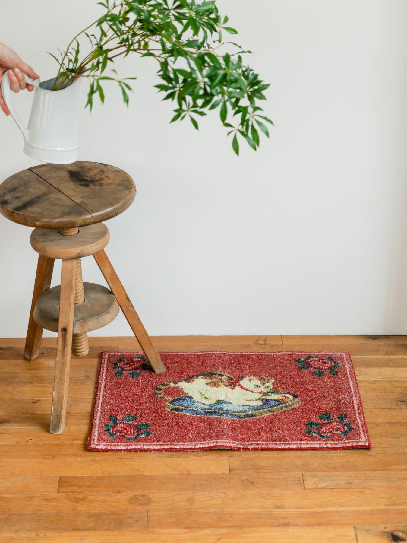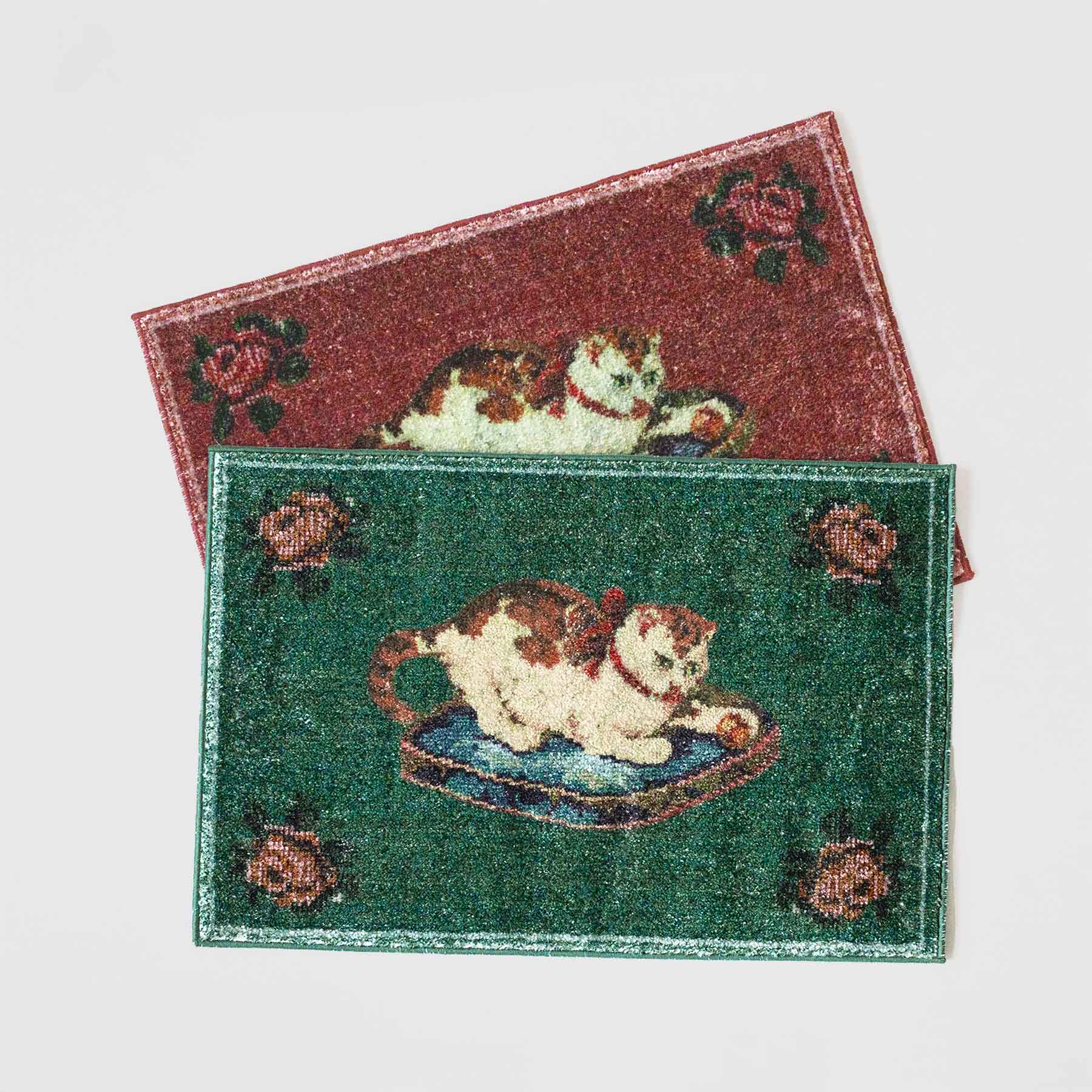 オーナーが所有する古い布コレクションの中で出会った、優雅なネコ。このロマンチックでレトロなムードを着想源に、ミニサイズのラグマットを作りました。
