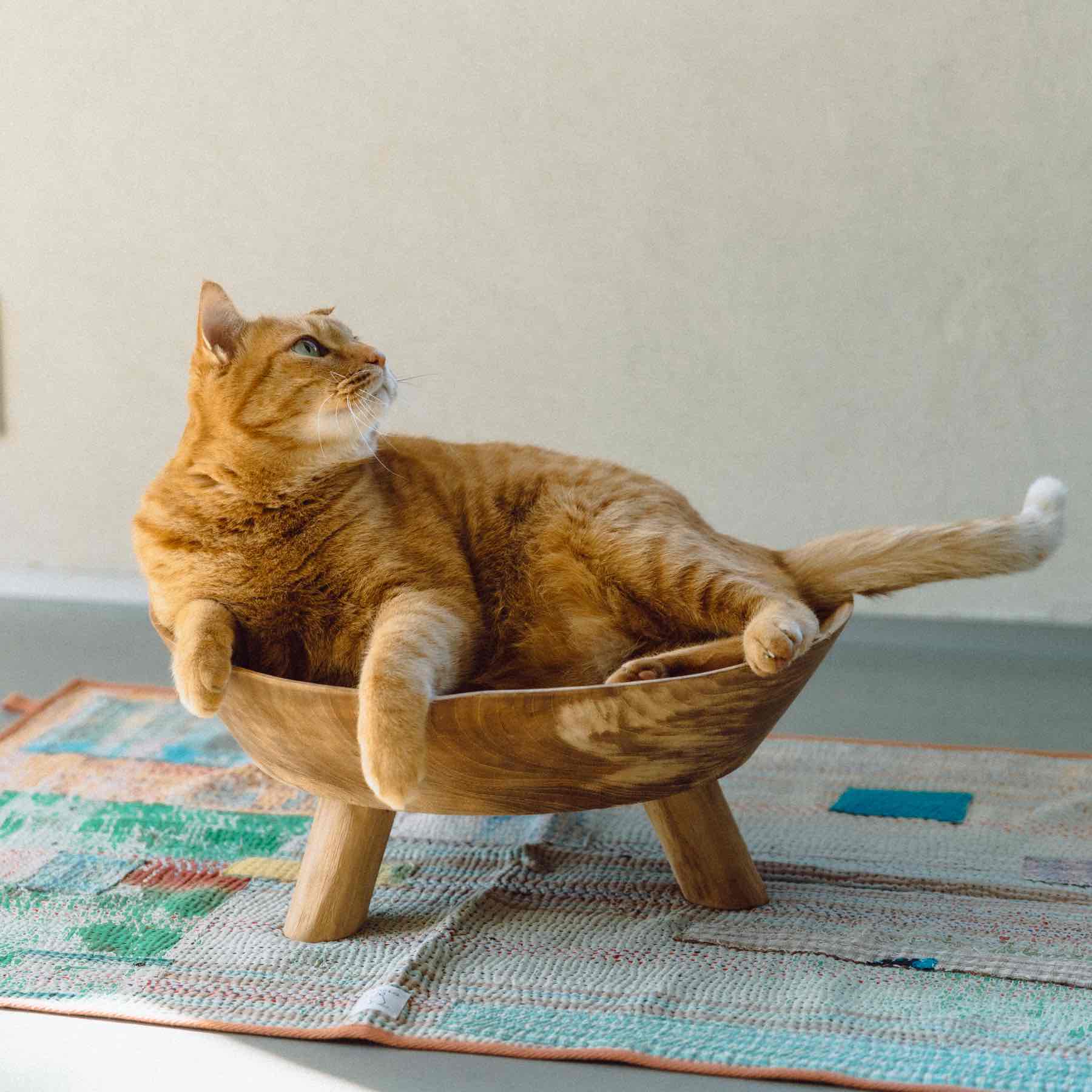 希少なサイズの木材を使って、インドネシアの職人の手によってひとつずつ丁寧に削り出された、贅沢な猫ベッドです。