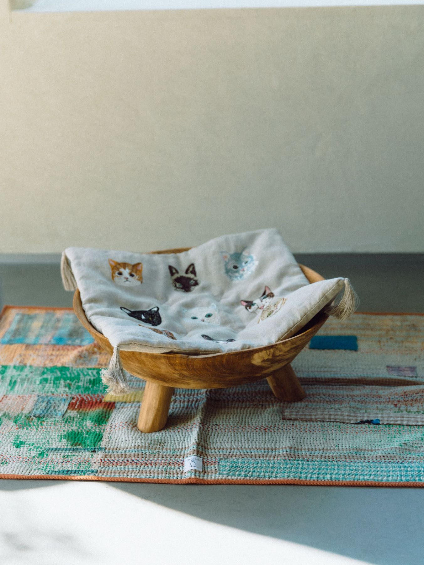 ふわふわ好みの猫ちゃんには、敷物でのカスタマイズも。敷いているのはCoral & Tuskと作ったキルトマット です。