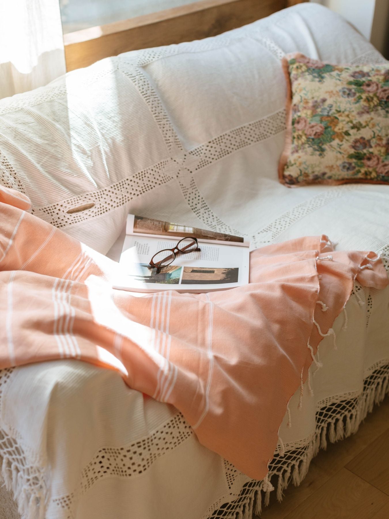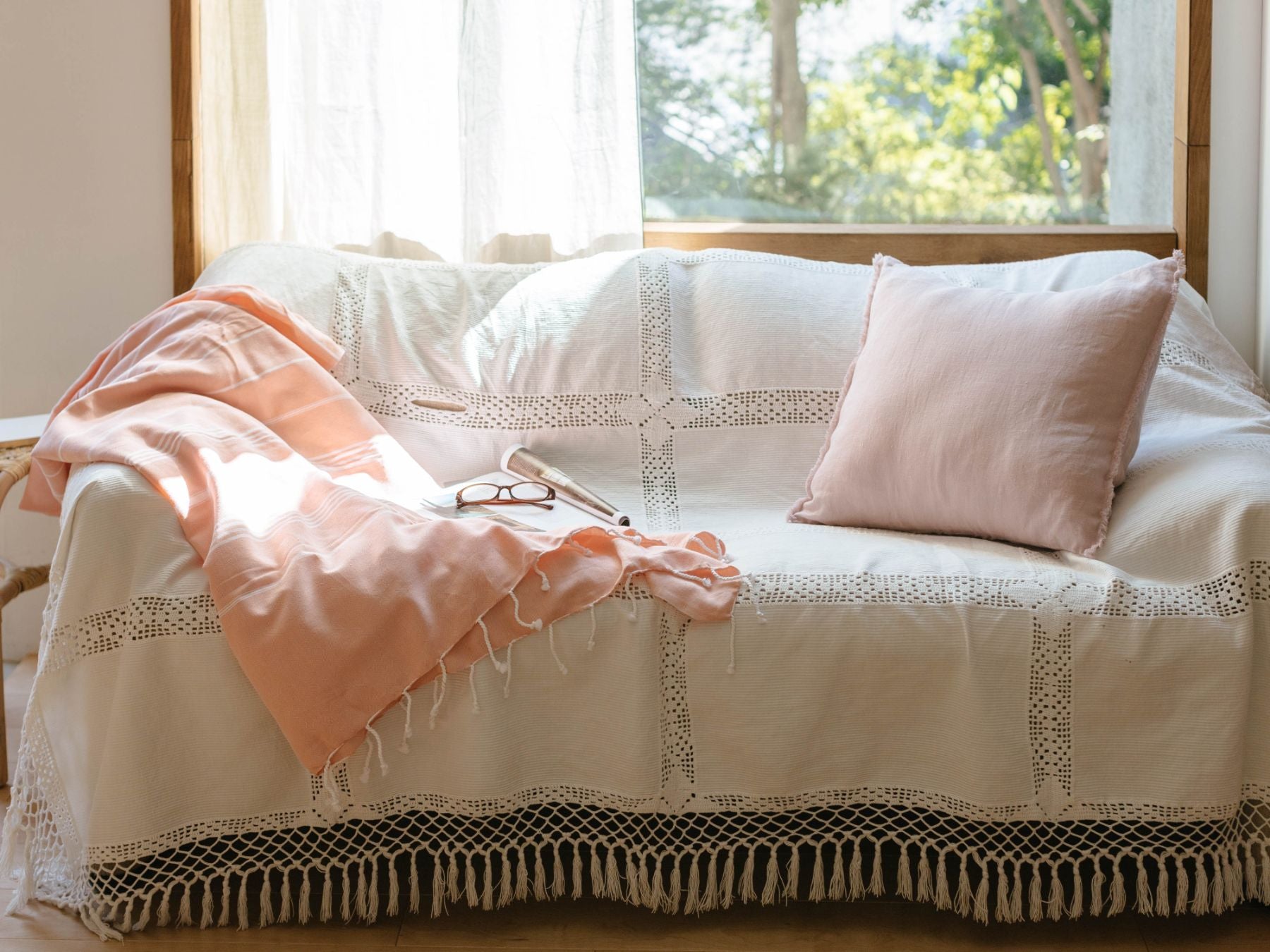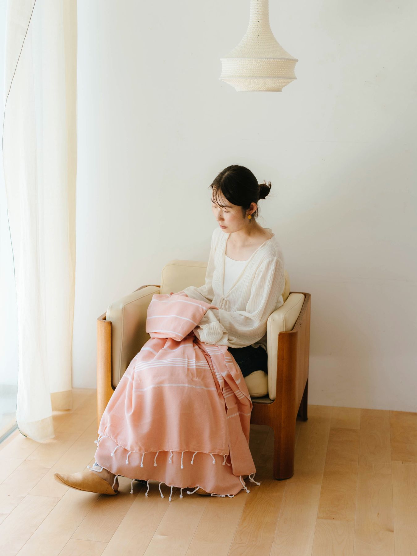 このハマムタオルは210cm×155cmと大判なので、ソファやベッドに掛けるマルチカバーやスローとしての使い方がおすすめです。さらっとした肌触りで、心地よいですよ。