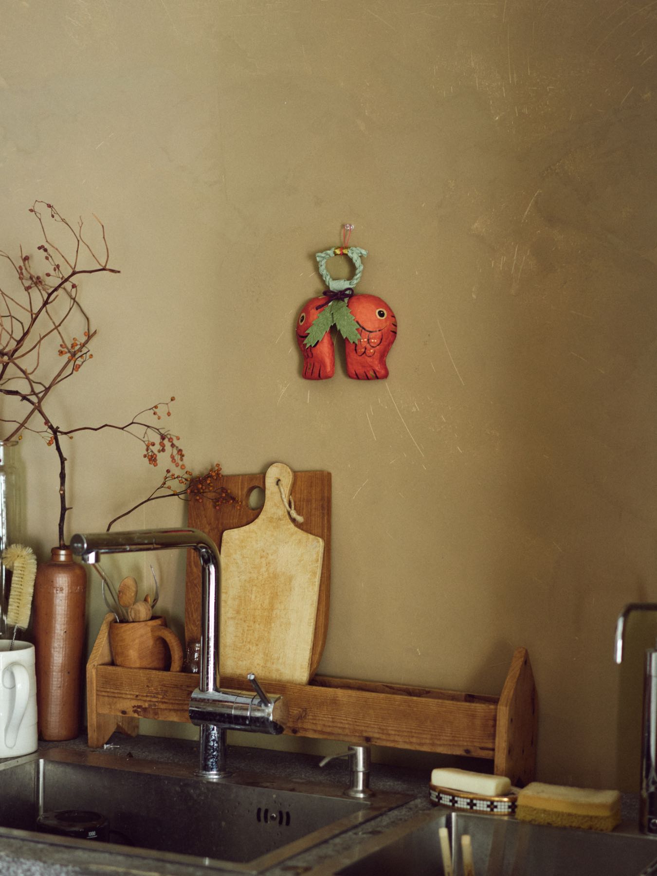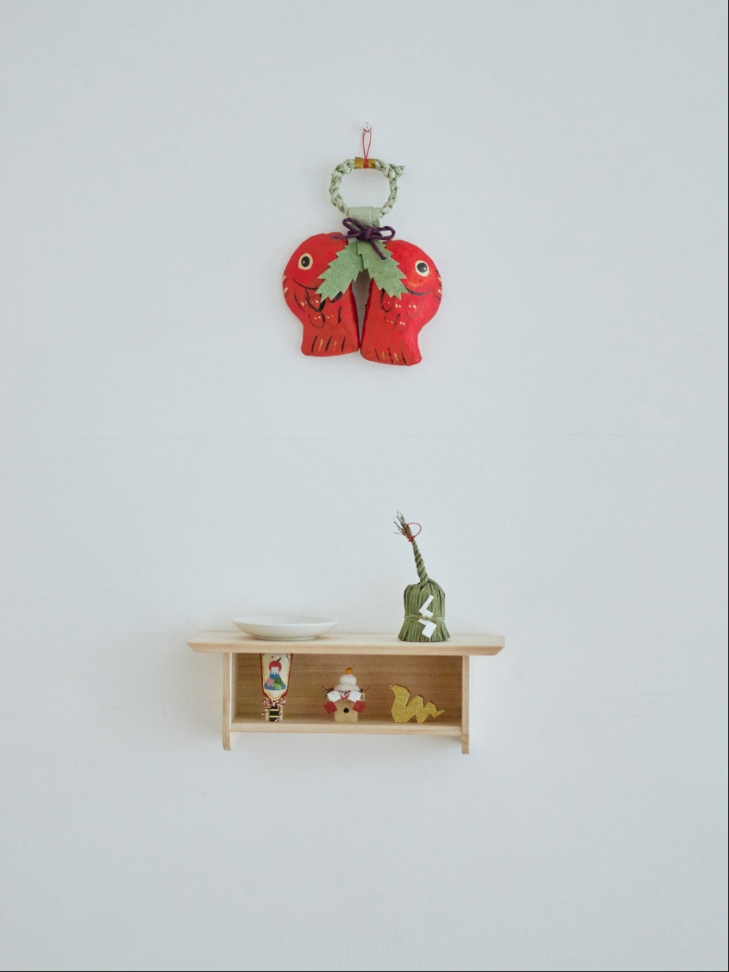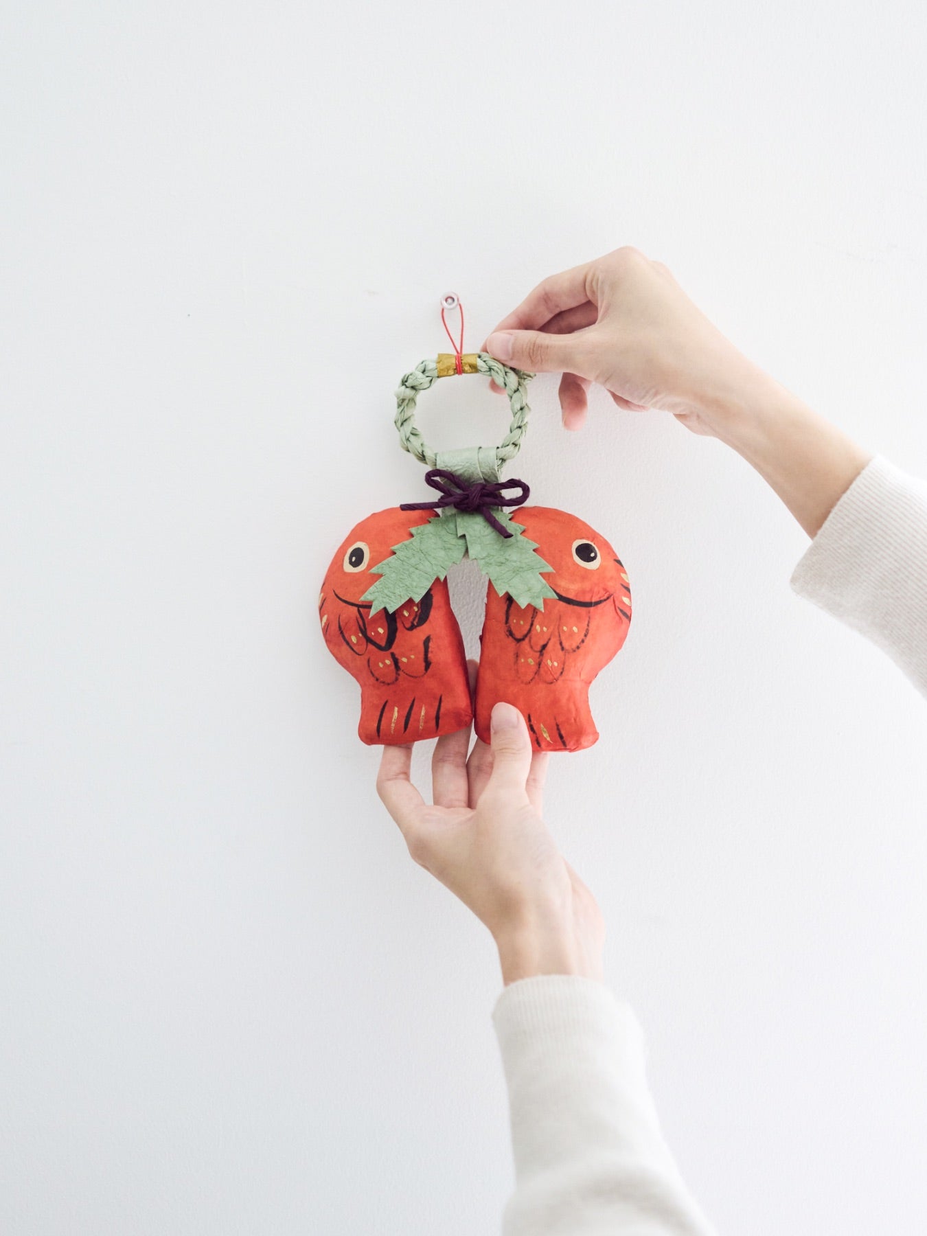 今年のオルネでは気軽に楽しめるお正月がテーマ。さっと飾れて目に入るたび嬉しい、ふくふくしい「向い鯛」の玄関飾りです。