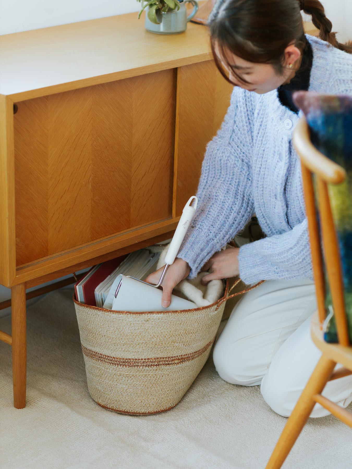 横幅にゆとりを持たせたフォルムで、空気がこもりにくい構造のため、ランドリーバスケットにしたり、リビングでブランケットの置き場所にするのもおすすめ。まとめにくいアイテムをざっくり入れて片付けることができます。