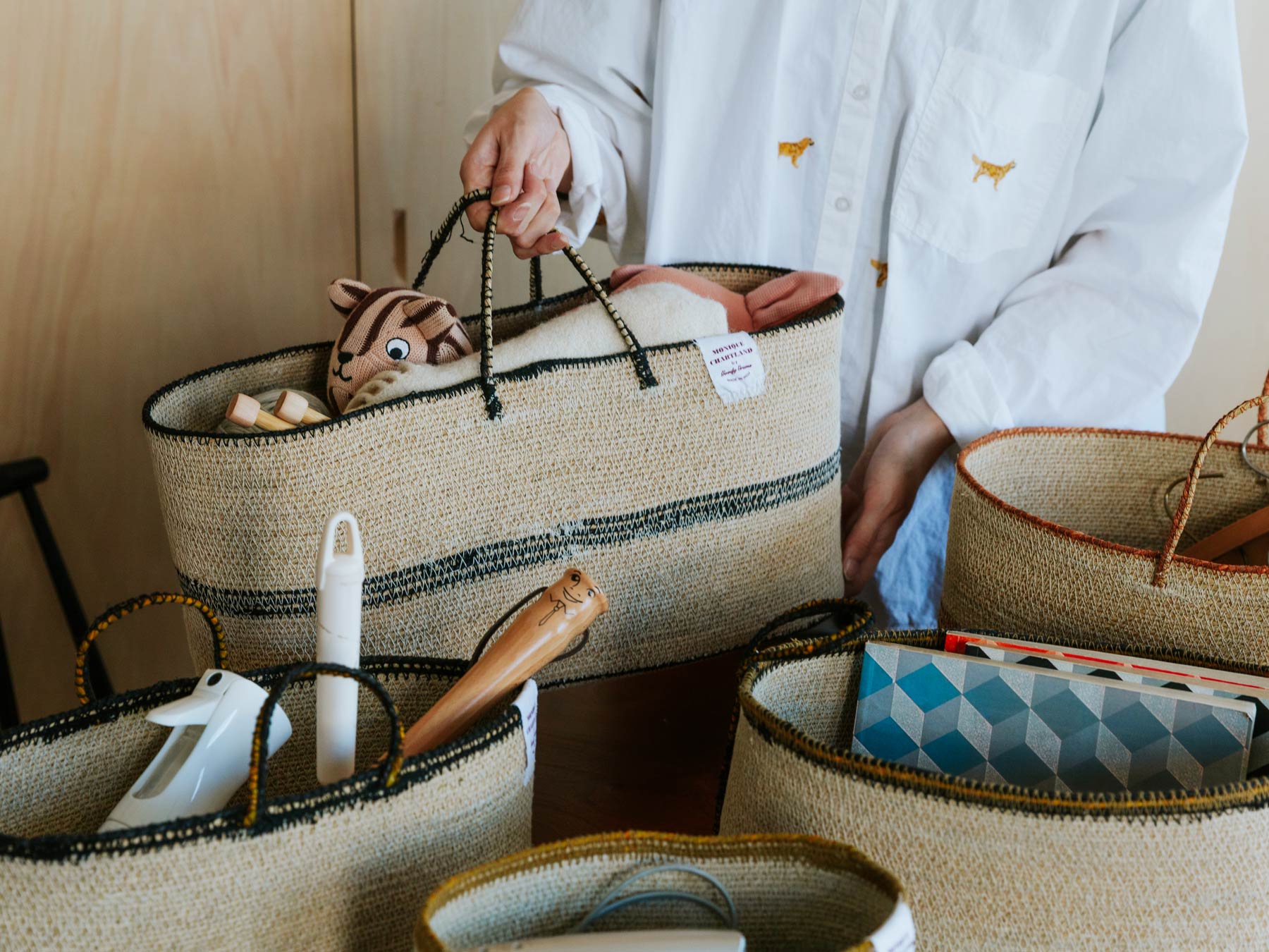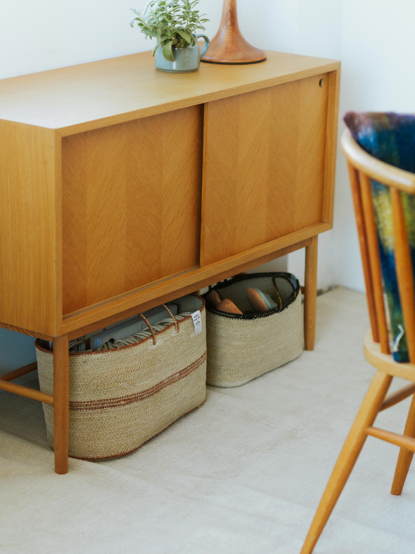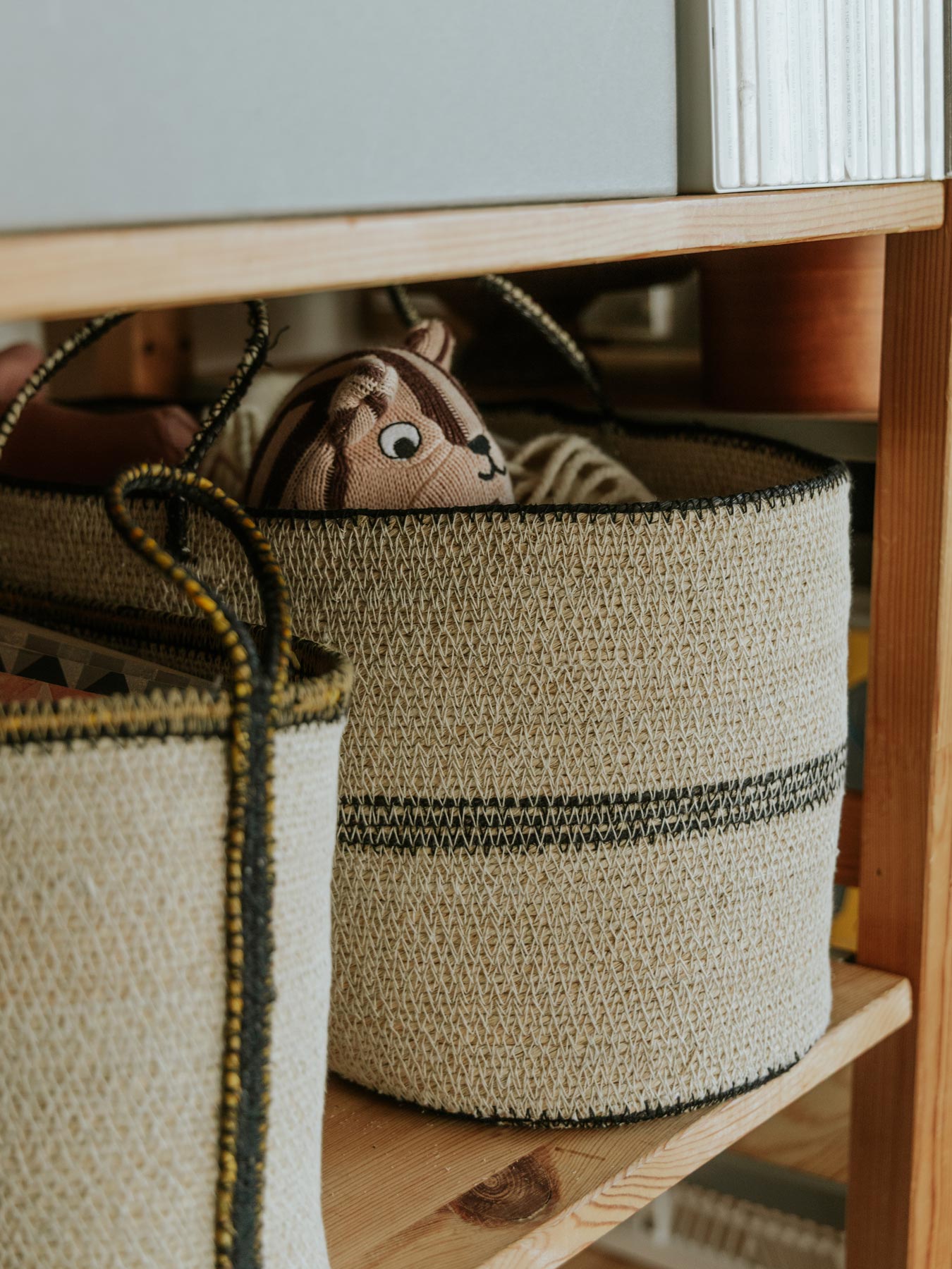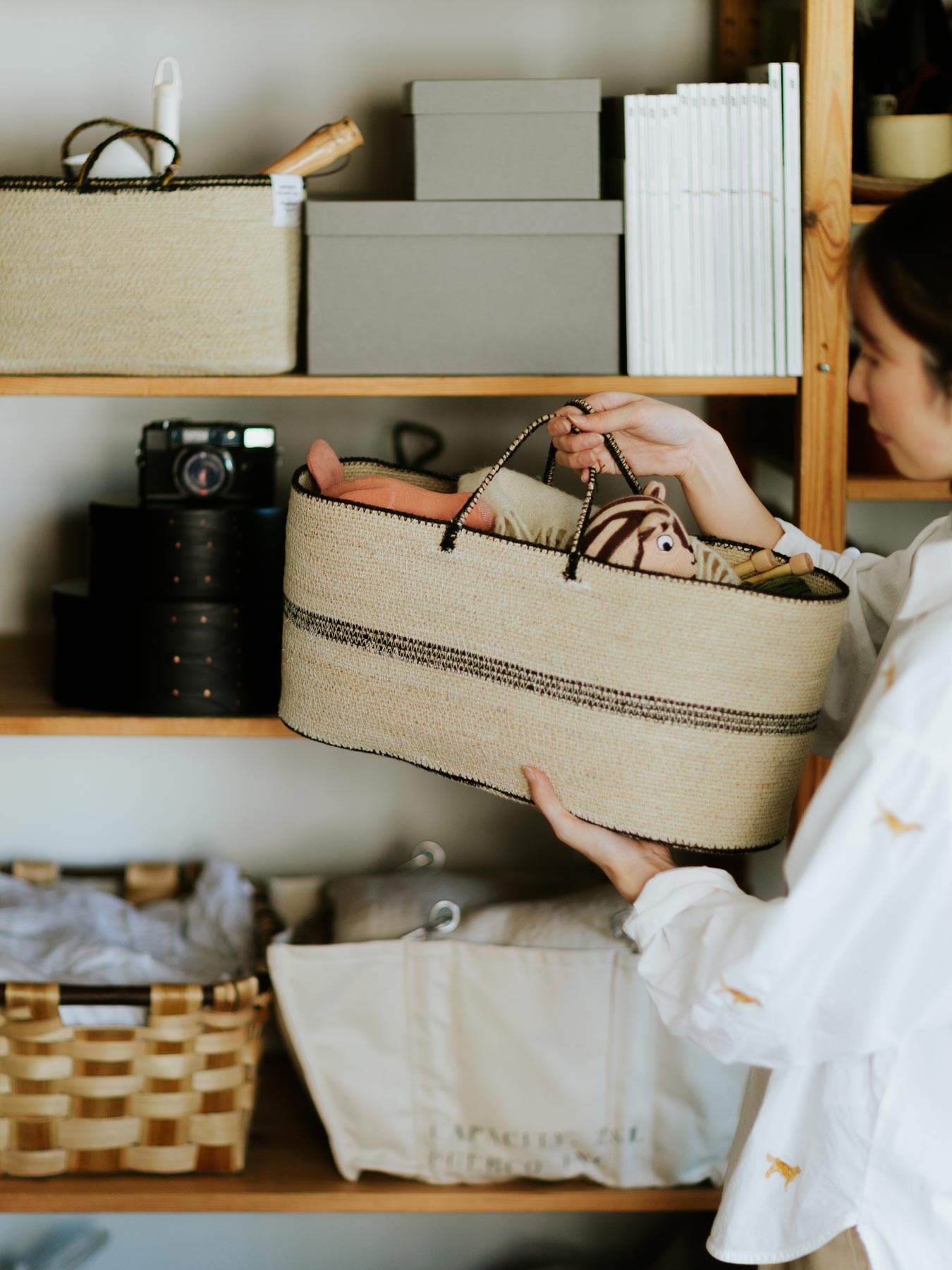 ナチュラルなバスケットは、四角四面になりがちな収納シーンに、抜け感をつくってくれます。