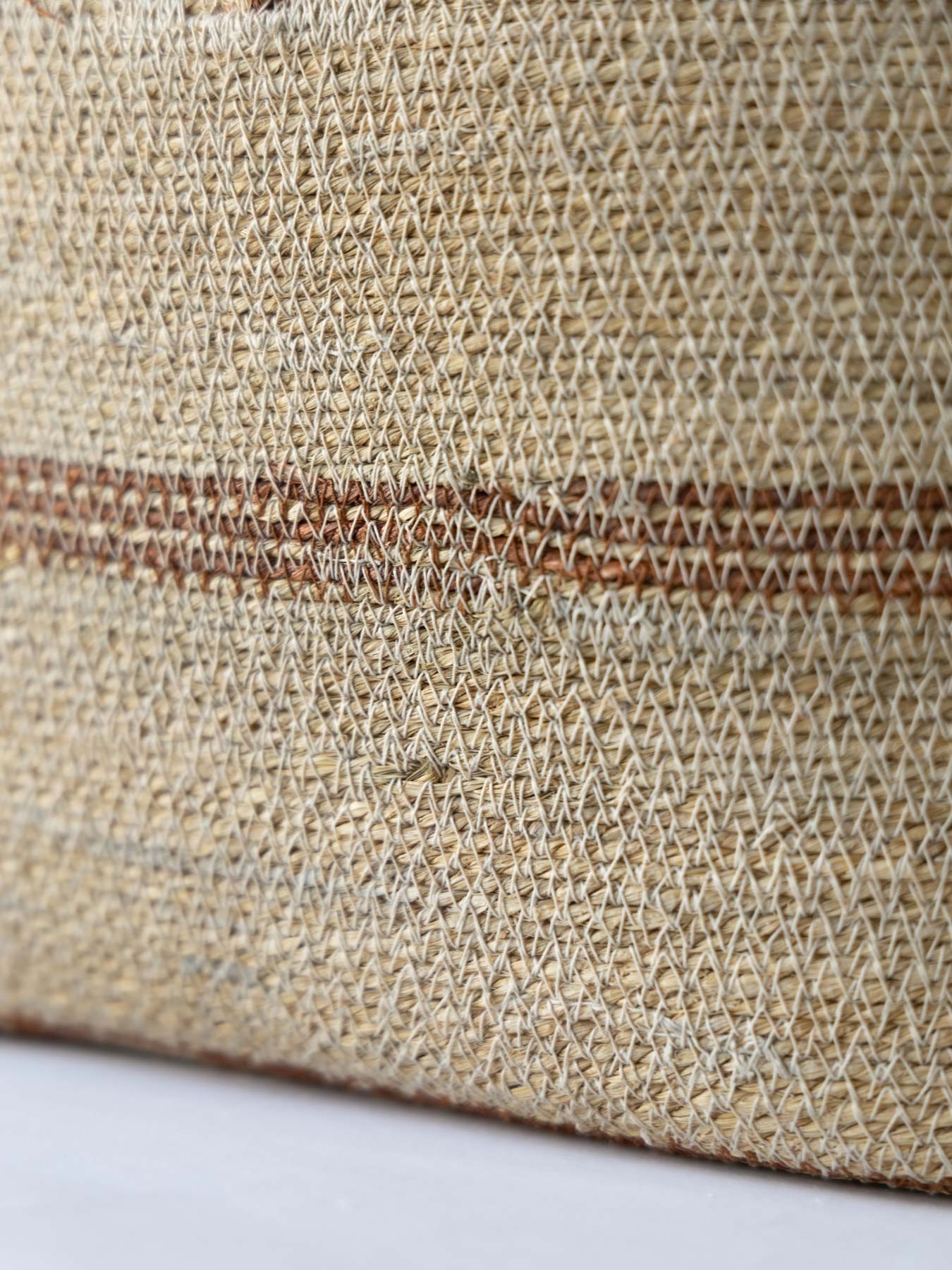 天然素材のシーグラスで編み上げた、やさしい雰囲気のバスケットです。ナチュラルカラーをベースに、さりげなく入ったラインや縁取りがポイント。片付けながらお部屋のおしゃれなアクセントにもなる、“見せる収納”におすすめです。