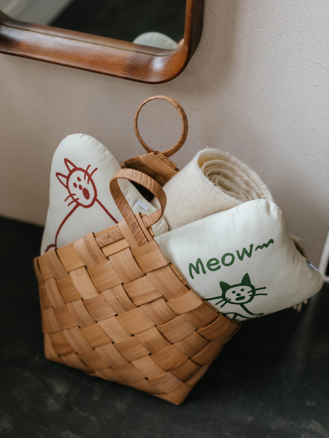 どちらのクッションも、呼びかけているようなネコが可愛くて、目が合うとほっこり。お家を賑やかにしてくれます。
