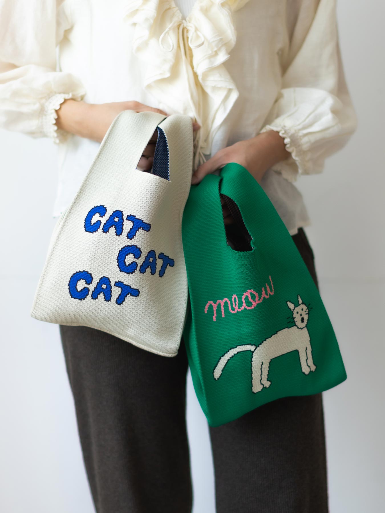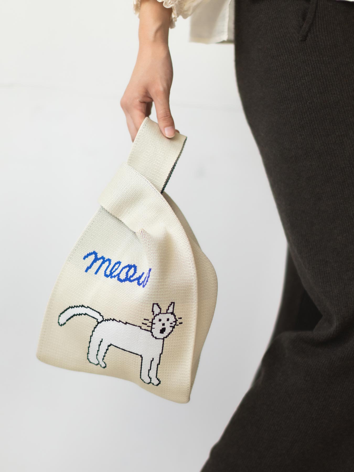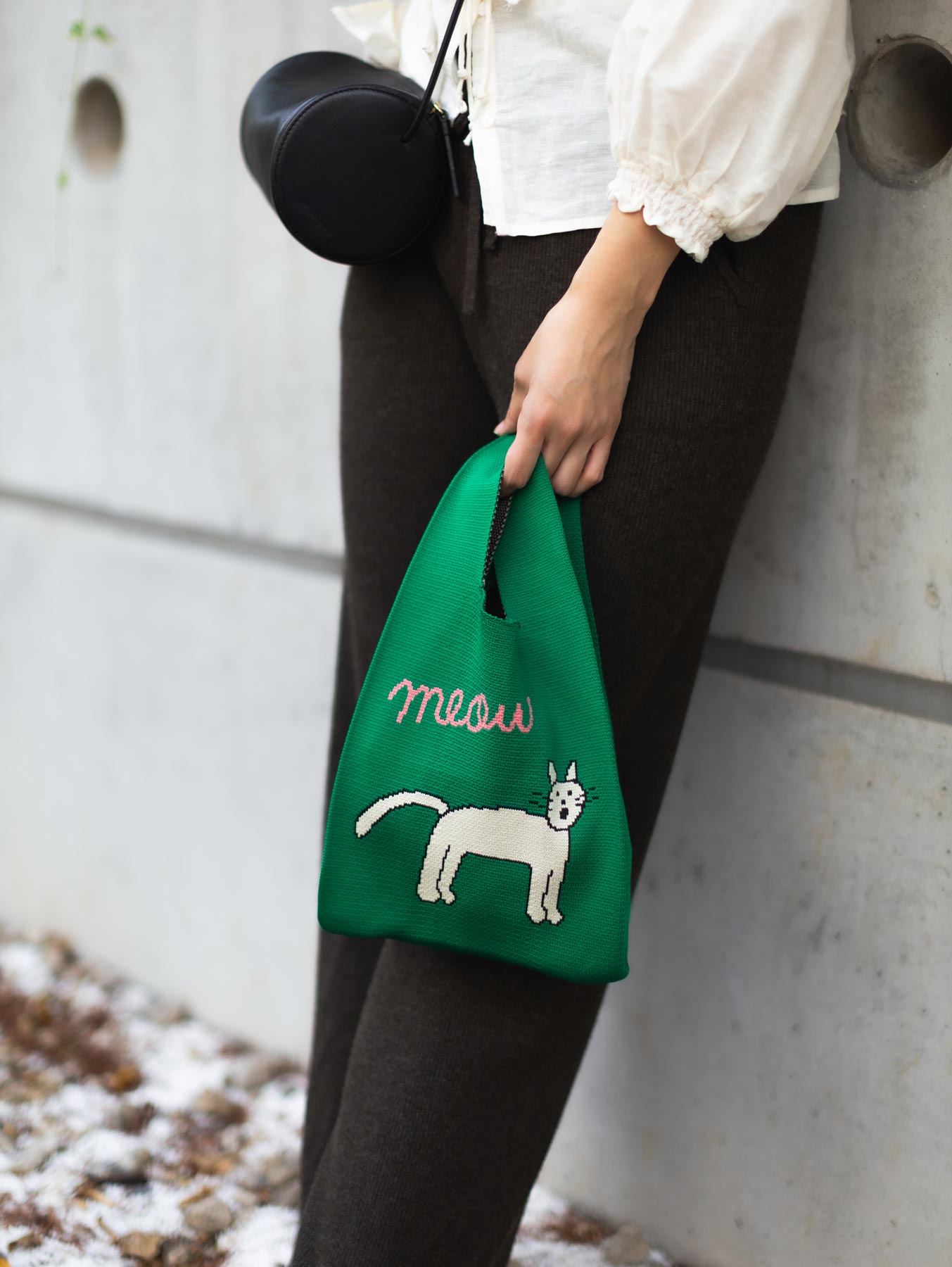 人気イラストレーターSTOMACHACHE. 描き下ろしのアートワークを編み込んだ、オルネコオリジナルのニットバッグです。