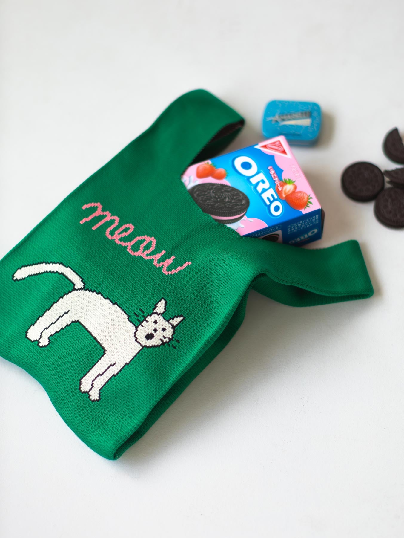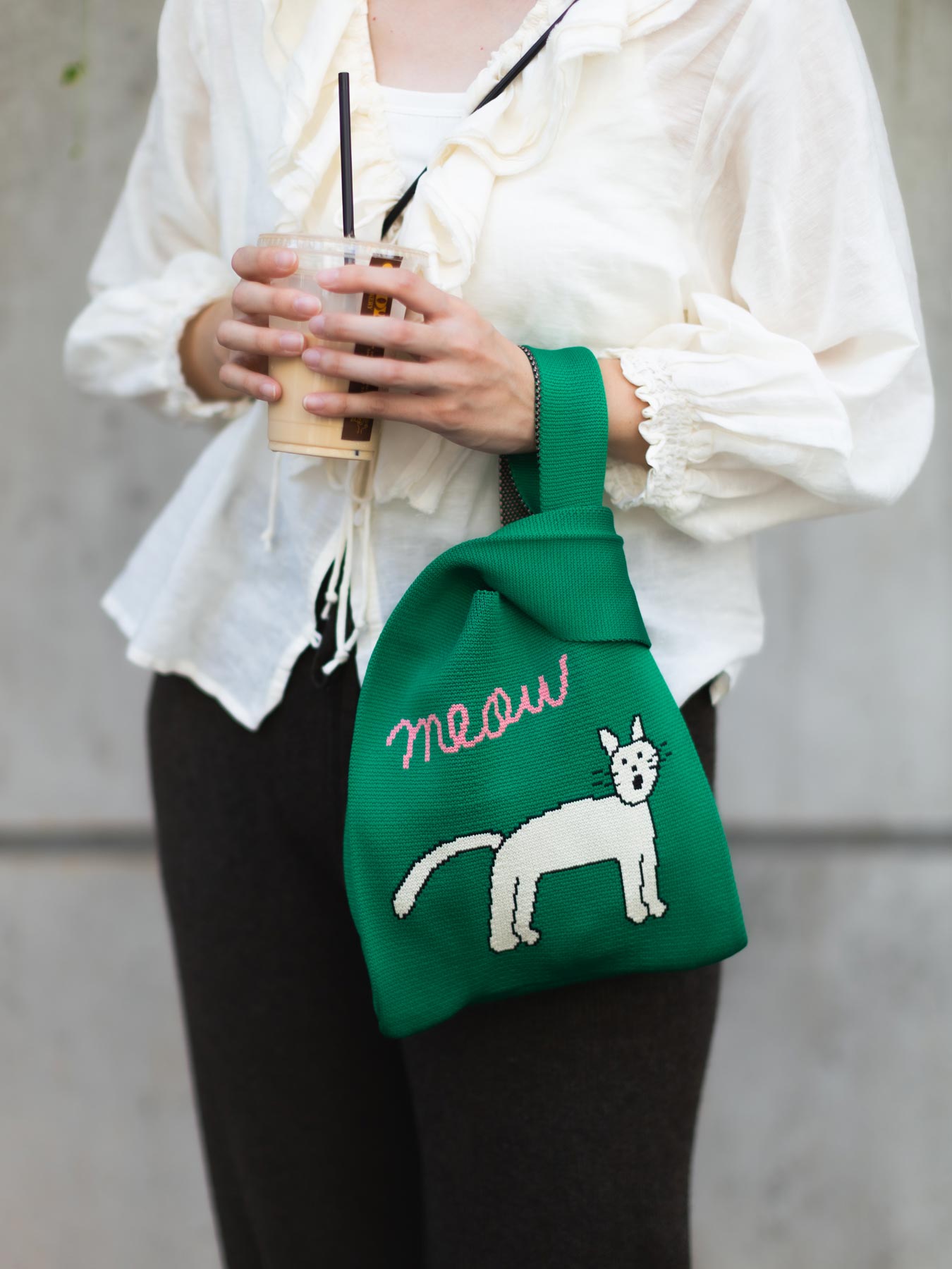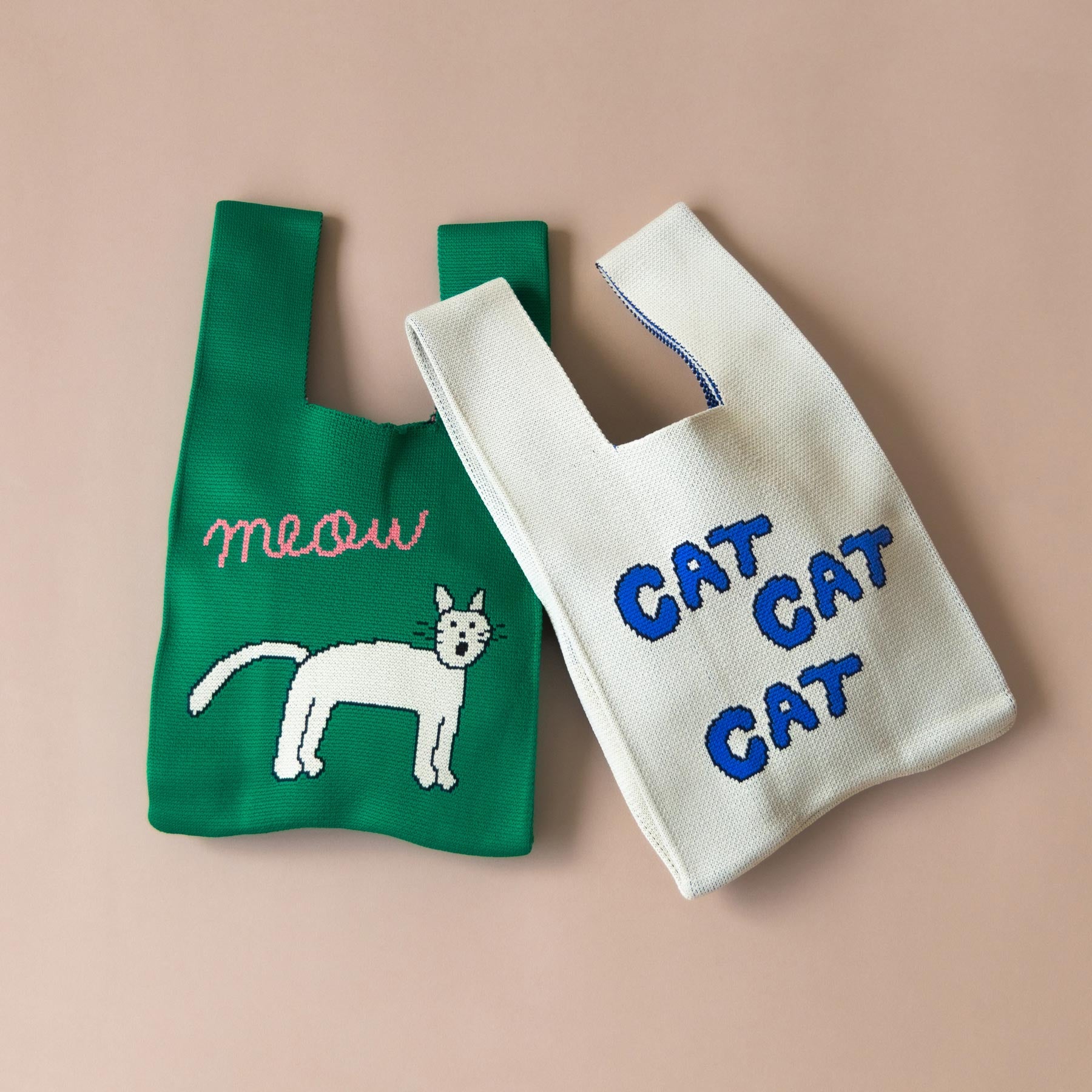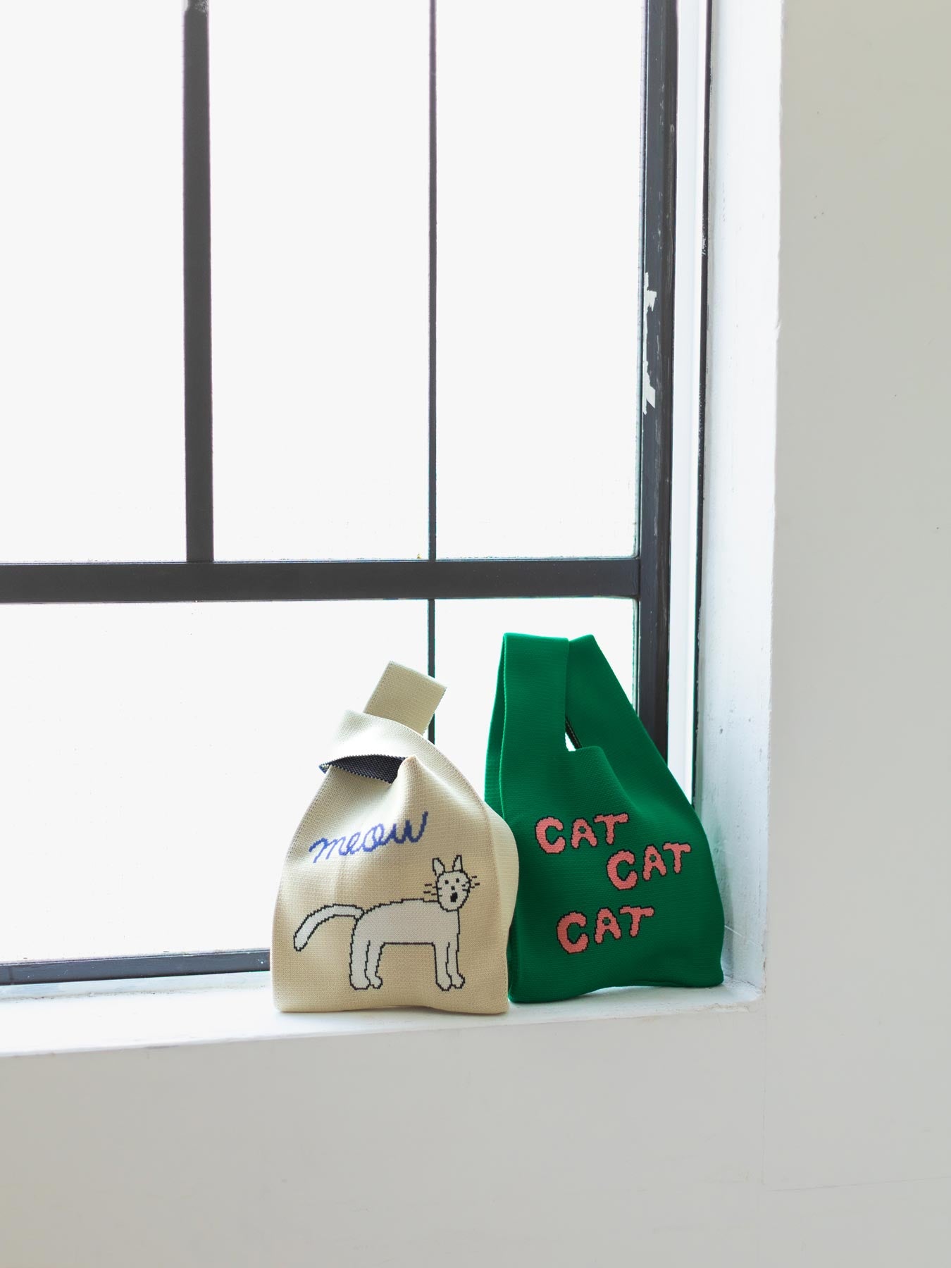 人気イラストレーターSTOMACHACHE. 描き下ろしのアートワークを編み込んだ、オルネコオリジナルのニットバッグです。
