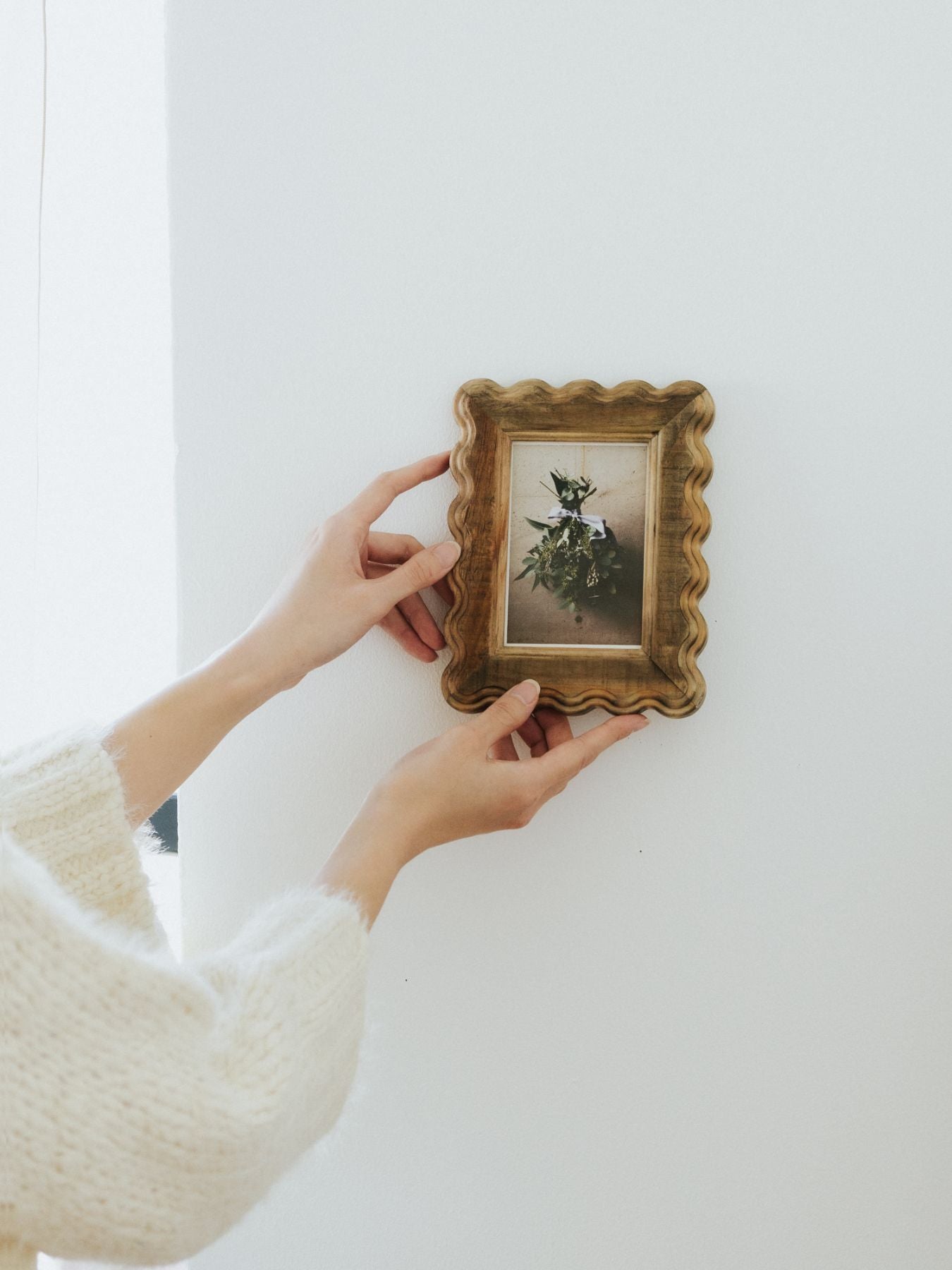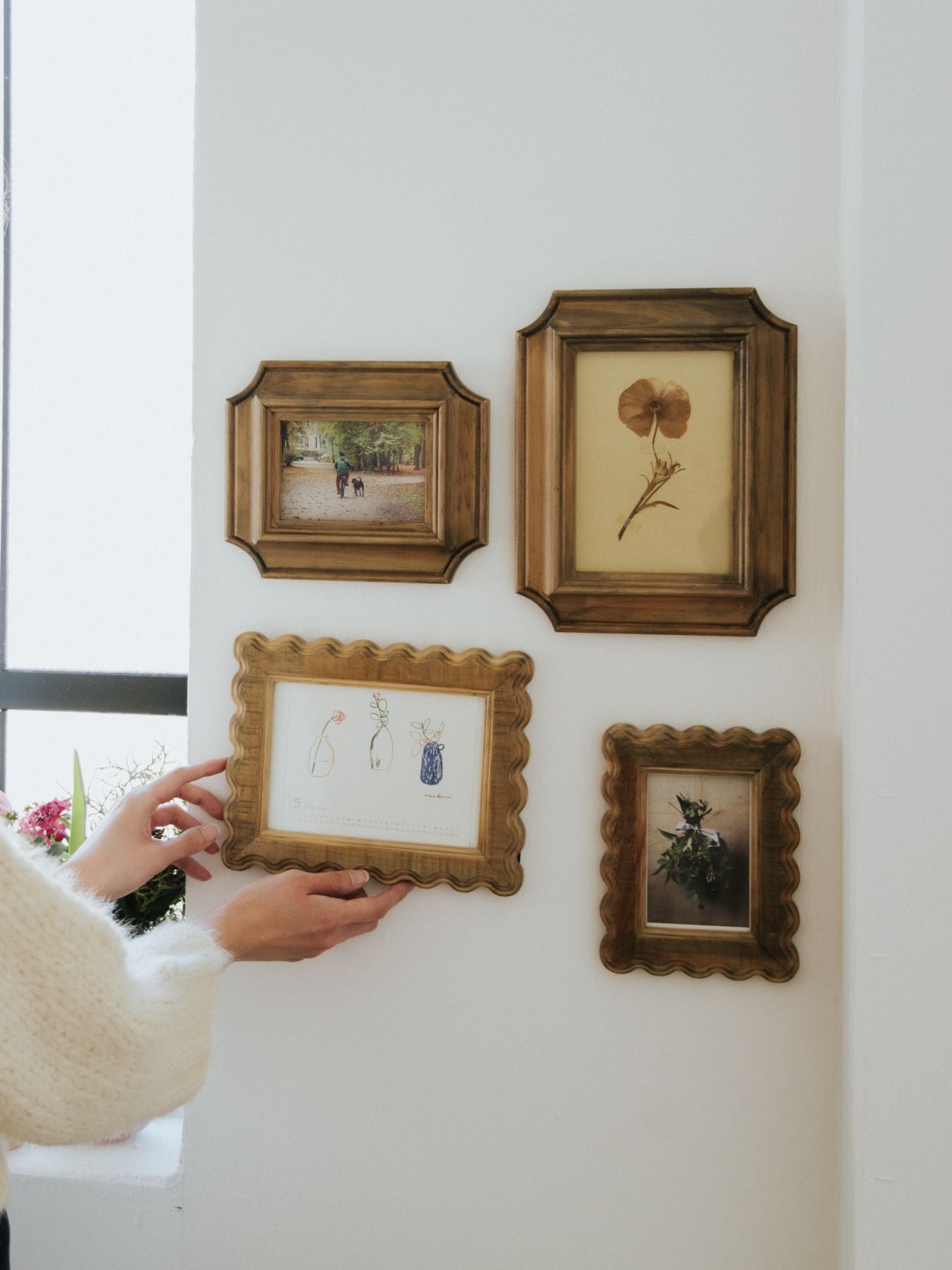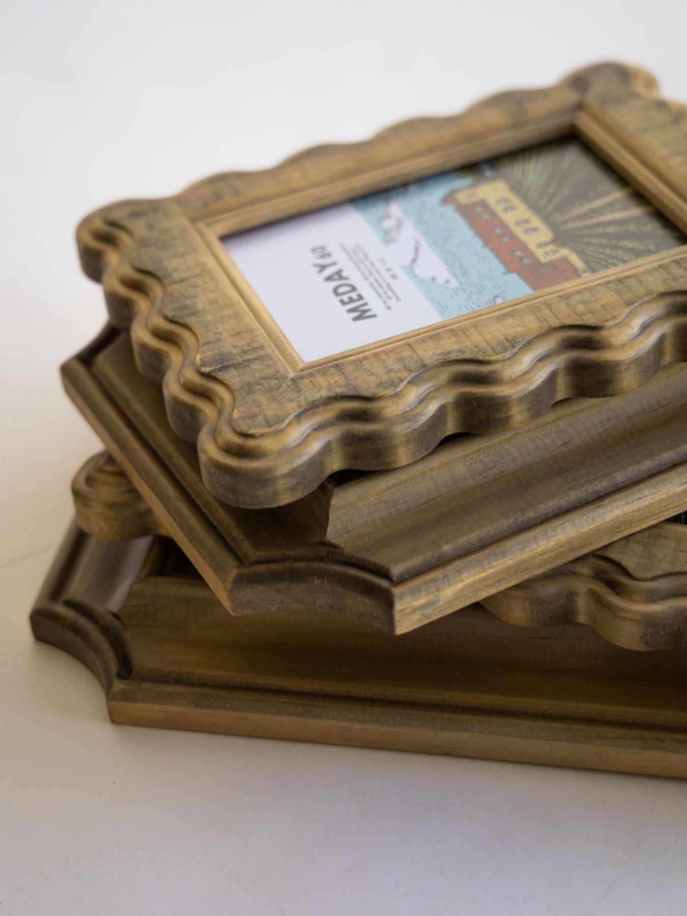 ヴィンテージライクな佇まいがお部屋のアクセントになる、手彫りの天然木フレーム。幅広のフレームに施された、ほどよく存在感のある装飾と、サラリとした表面の質感が魅力です。